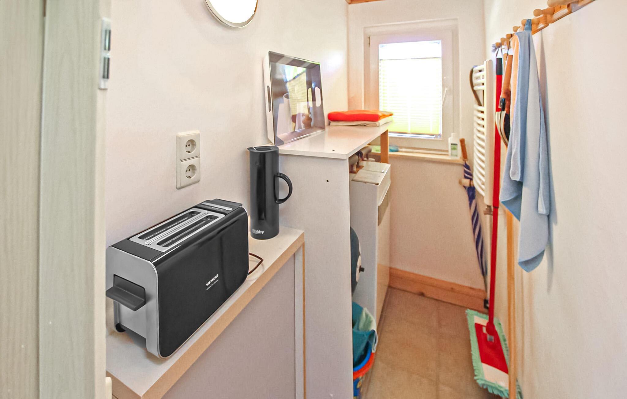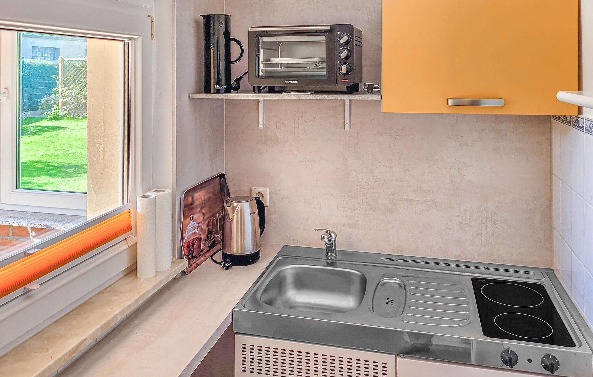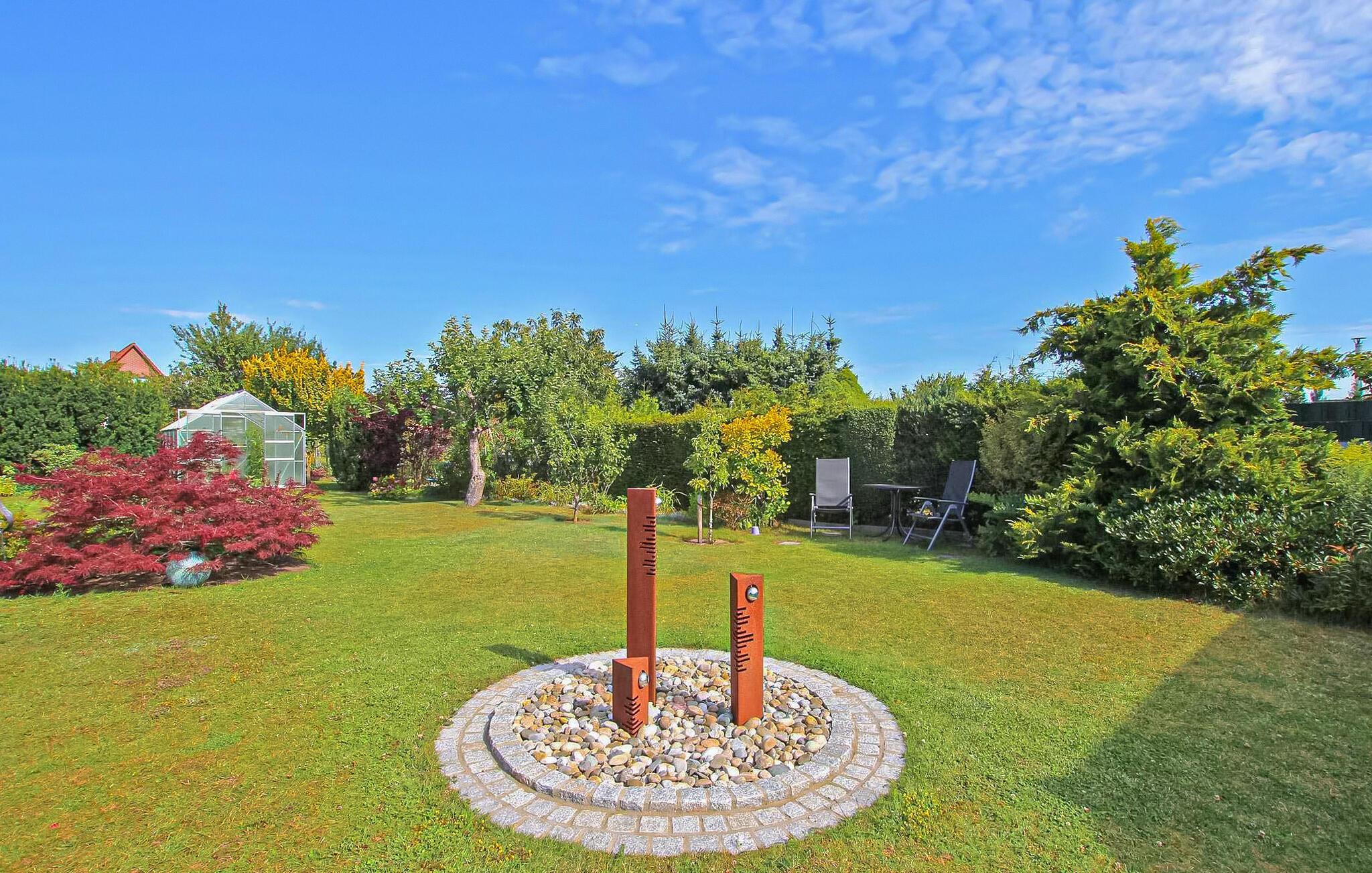 Det smakfullt inredda, centralt uppvärmda rökfria huset är utrustat med ett vardagsrum (bäddsoffa - extrasäng för en person, matbord, platt-TV, radio), ett sovrum (dubbelsäng, stor garderob), ett minikök (keramikhäll, kyl med frys, mikrovågsugn med grill, diverse små köksmaskiner), ett förråd, en hall och ett badrum (duschkabin, WC, tvättmaskin, hårtork). Det finns också en möblerad sittgrupp i trädgården, cykelförvaring, en parkeringsplats framför huset och WiFi.