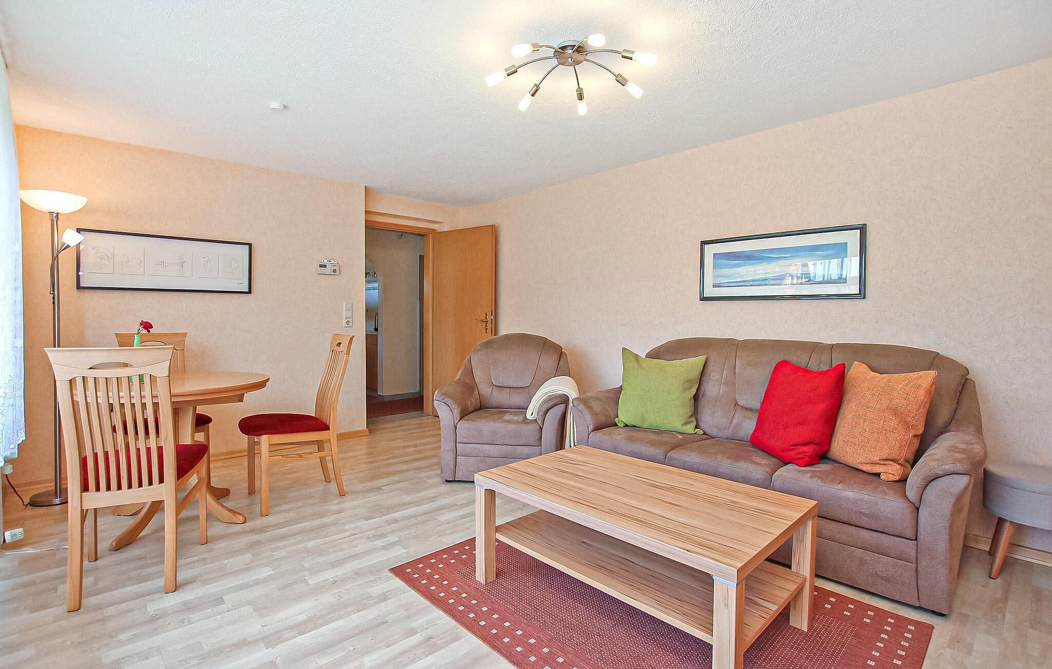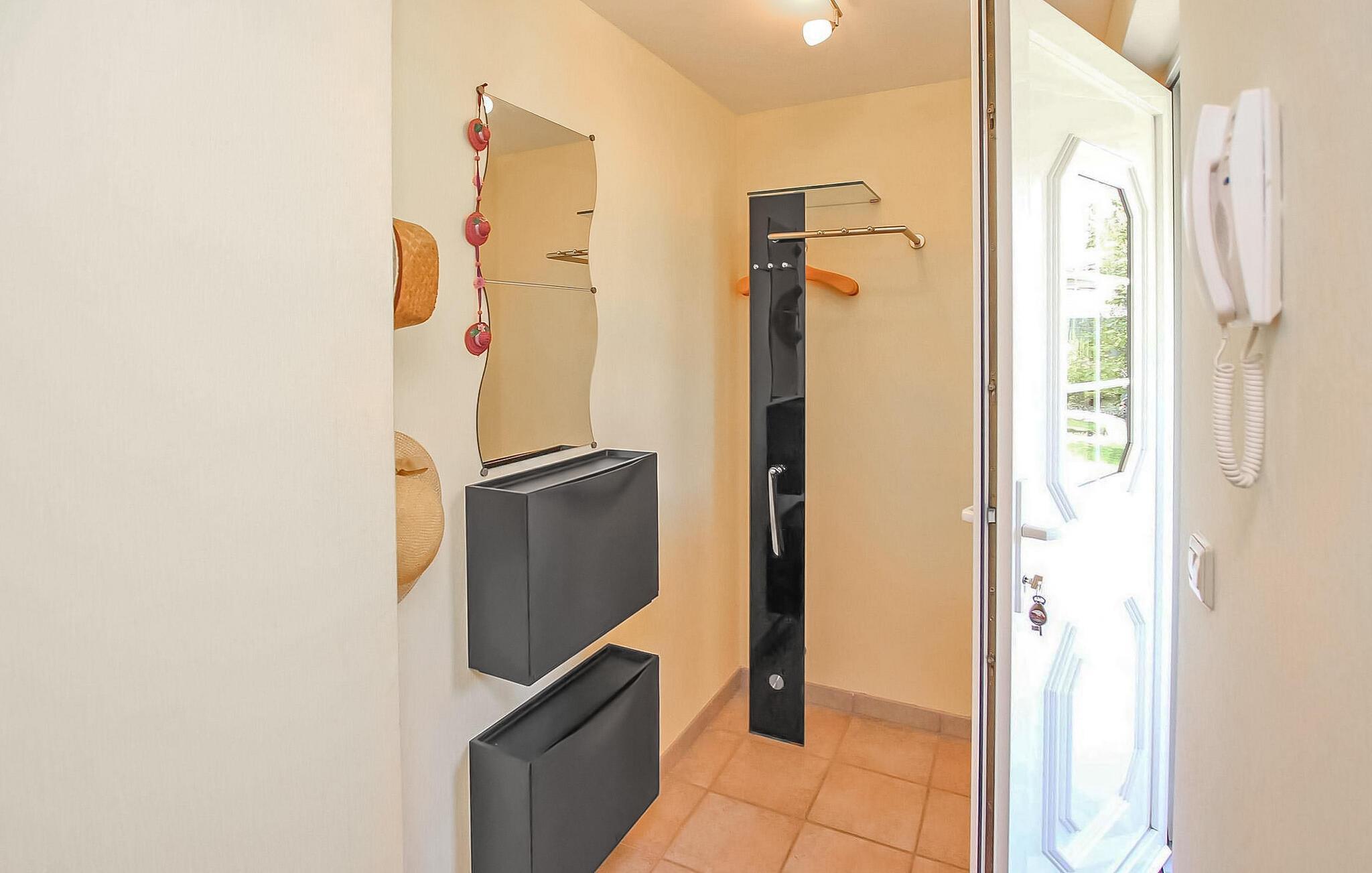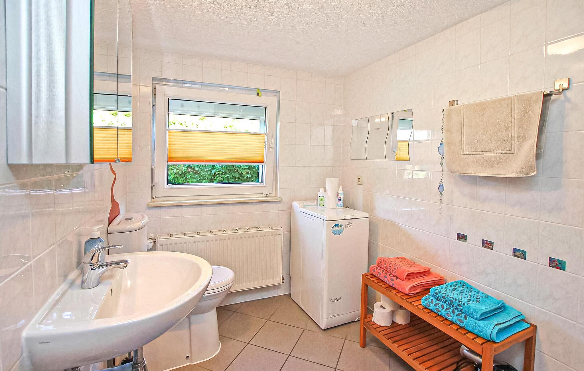 Det smakfullt inredda, centralt uppvärmda rökfria huset är utrustat med ett vardagsrum (bäddsoffa - extrasäng för en person, matbord, platt-TV, radio), ett sovrum (dubbelsäng, stor garderob), ett minikök (keramikhäll, kyl med frys, mikrovågsugn med grill, diverse små köksmaskiner), ett förråd, en hall och ett badrum (duschkabin, WC, tvättmaskin, hårtork). Det finns också en möblerad sittgrupp i trädgården, cykelförvaring, en parkeringsplats framför huset och WiFi.