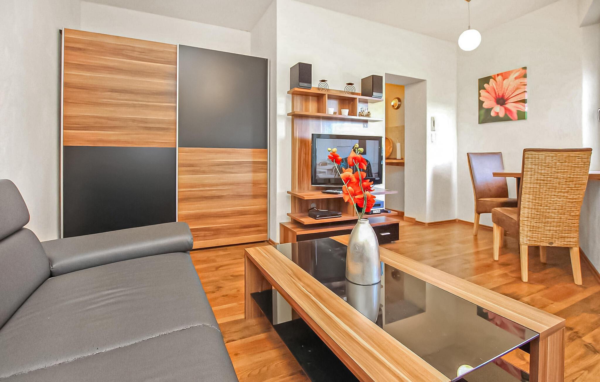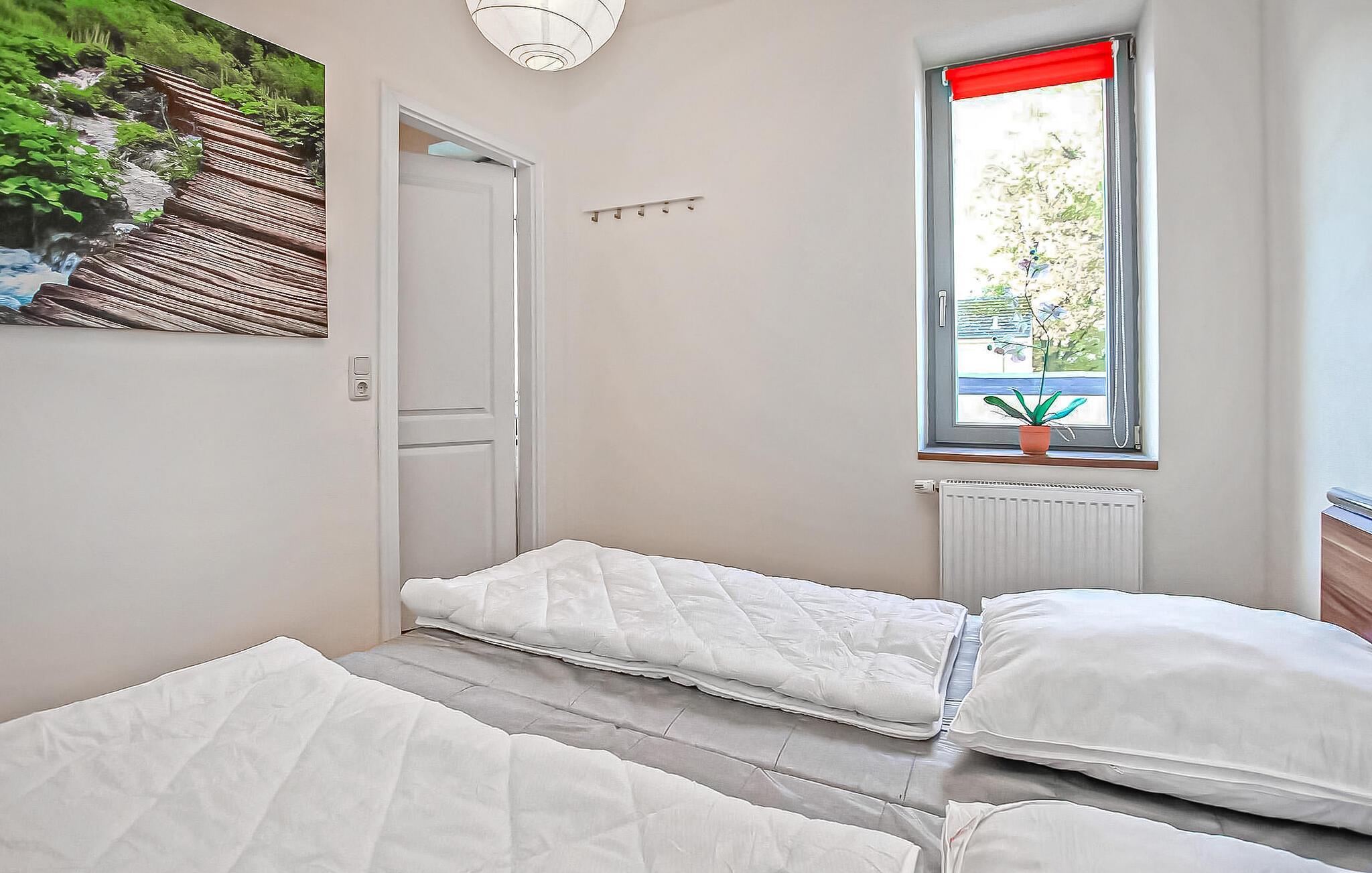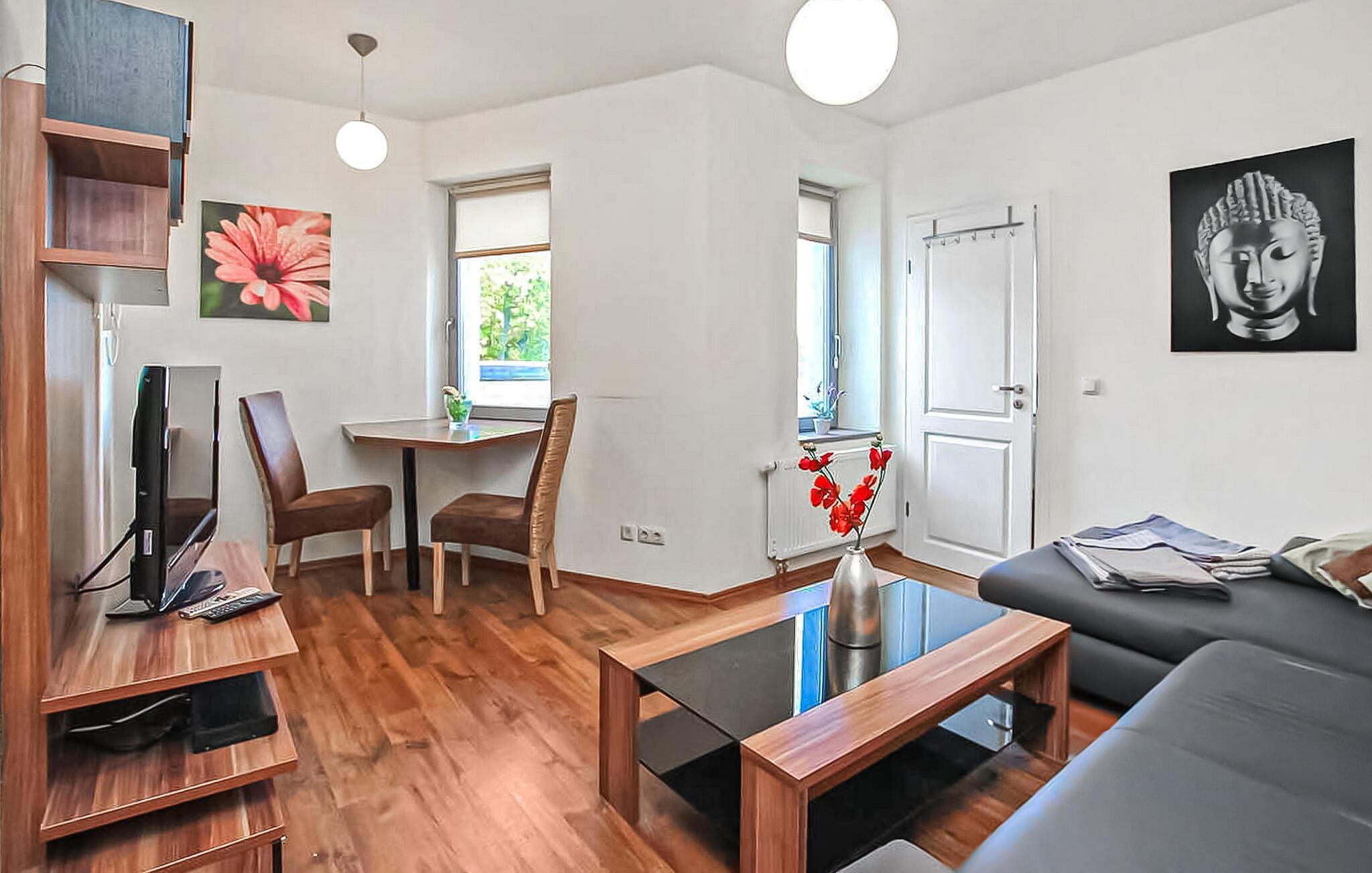 Den ca 37 kvadratmeter stora, centralt uppvärmda, rökfria lägenheten med separat ingång har ett vardagsrum (soffa, platt-TV, radio, CD-spelare, litet matbord), ett sovrum (dubbelsäng), ett komplett kök (elektrisk spis med ugn, kyl med frys, diskmaskin, mikrovågsugn, diverse små köksmaskiner) och ett badrum (dusch, toalett, elektrisk handdukstork). Det finns också cykelförvaring (cykelskjul) på fastigheten, en liten sittgrupp på fastigheten, grill och W-LAN. Gratis allmän bilparkering finns direkt framför huset eller i omedelbar närhet.