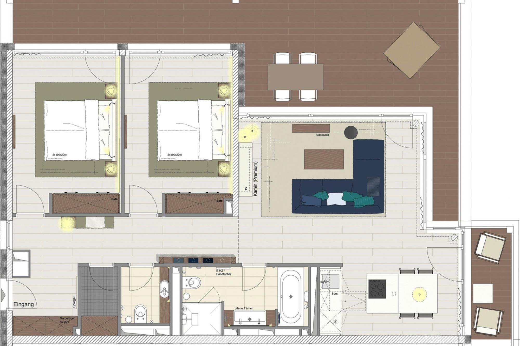 Öppet kök(matbord, Kokplattor(Spis med 4 kokplattor, keramisk), vattenkokare, brödrost, kaffebryggare, ugn, diskmaskin, kylskåp), ardags- och matrum(TV(kabel), radio), sovrum(dubbelsäng), sovrum(dubbelsäng), badrum(dusch, handfat, toalett , hårfön), förråd, garage(delas med andra gäster ), sauna(paid), balkong, värme, cykelförvaring, trädgårdsmöbler, parkering, swimmingpool(delas med andra gäster , betalt, uppvärmd), hiss, baby crib(paid), Handdukar/lakan (inkl.)