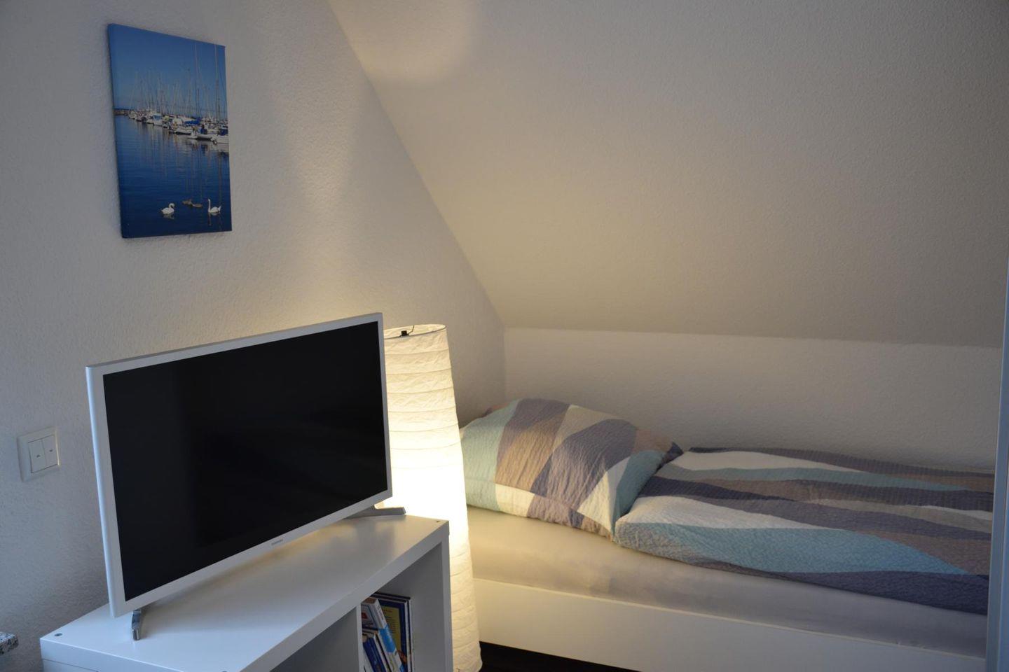 Ein Schlafzimmer im Obergeschoss verfügt über 3 Einzelbetten und Seeblick. Das zweite obere Schlafzimmer hat ebenfalls ein Doppelbett (180 x 200 cm). In beiden Zimmern befinden sich Flachbildfernseher. Alle Schlafräume sind mit Außenrollos und Fliegengitter versehen. Hochwertige Matratzen und Decken, sowie verstellbare Lattenroste sorgen für Ihr Wohlbefinden. Praktisch ist ein weiteres Duschbad im Obergeschoss.