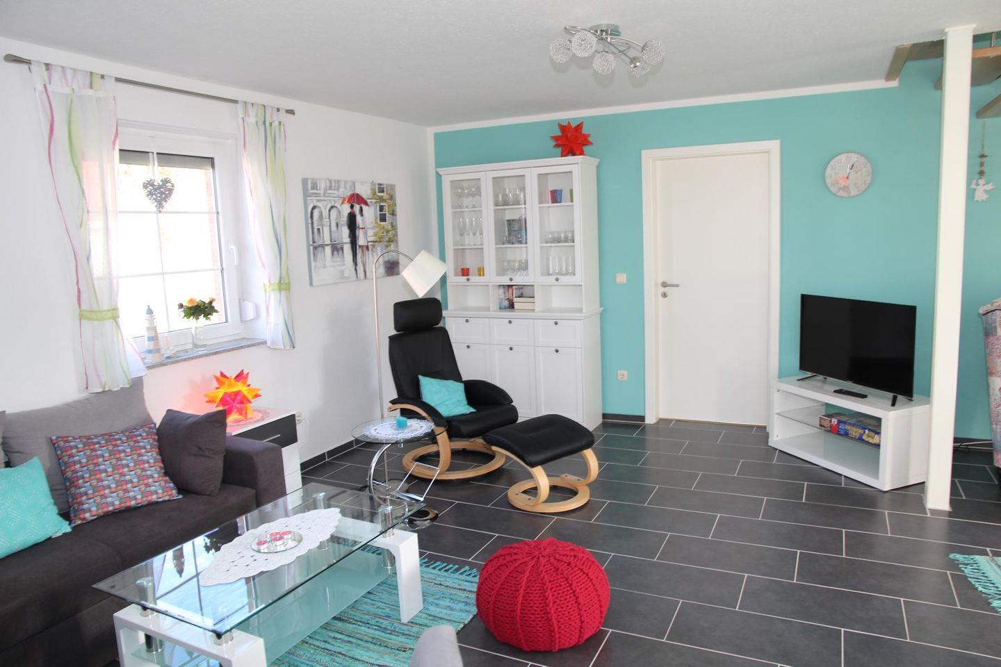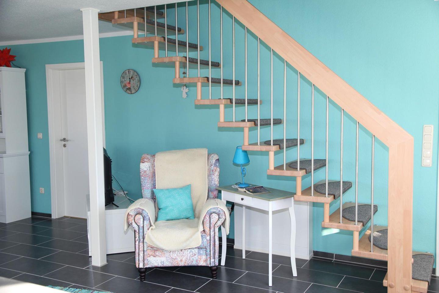 Das Haus ist komfortabel und geschmackvoll eingerichtet und bietet Platz für 3 Personen (eine 4. Person ist auf Anfrage möglich). Im Erdgeschoss erreichen Sie vom Flur aus eine Gästetoilette mit einem durch eine Schiebegardine abgetrennten, kleinen Abstellraum mit Waschmaschine. Im großen Wohnbereich befindet sich die offene Küche, die durch eine kleine Theke vom Essplatz abgetrennt ist. Die Küche ist komplett eingerichtet und verfügt z.B. über ein Cerankochfeld, Backofen, Kühlschrank mit Gefrierfach, Spülmaschine, Mixer, Eierkocher, Kaffee- und Kaffee-Pad-Maschine, Toaster, Mikrowelle, ausreichend Geschirr und Gläser etc. Eine gemütliche Sitzecke mit Relaxsessel, ideal zum Entspannen, zum Lesen, Musik hören oder auch zum Fernsehen, schließt sich an. Ein Blu-ray-Player gehört ebenfalls zur Ausstattung. Vom Ohrensessel unter der Treppe kann man direkt auf den See blicken. Die überdachte Terrasse (mit verschiebbaren Glaswänden) ermöglicht, auch bei Regen draußen zu sitzen. Bei starker Sonneneinstrahlung bietet ein Sonnenschirm Schutz, ansonsten sorgen die Linden für natürlichen Schatten und für ein angenehmes Klima auf der Terrasse. Das angrenzende Gartenhaus verfügt über genügend Platz, um nötige Utensilien, z.B. mitgebrachte Fahrräder, unterzustellen. Im Erdgeschoss befindet sich weiterhin ein Schlafzimmer mit Doppelbett (Komfort-Höhe und verstellbare Lattenroste), Kleiderschrank, Kommode und großem Wandspiegel und hat einen direkten Zugang zum Bad. Das Gäste-WC und das Badezimmer im Erdgeschoss sind mit Aufstehhilfen versehen, sodass das Erdgeschoss seniorengerecht ist. Auch der elektrische Relaxsessel verfügt über eine Aufstehhilfe.