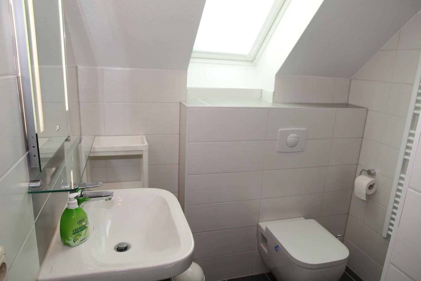 Über eine offene Holztreppe gelangt man ins Obergeschoss. Hier befindet sich ein weiteres großes Schlafzimmer mit Doppelbett, Kleiderschrank, Kommode, Sitzecke, Schreibtisch, Bücherregal mit Büchern, Spielen und ein zweiter Fernseher. Ein zweites Duschbad steht für dieses Zimmer zur Verfügung. Dieses ist mit einem Dachfenster mit Sonnenschutz ausgestattet.