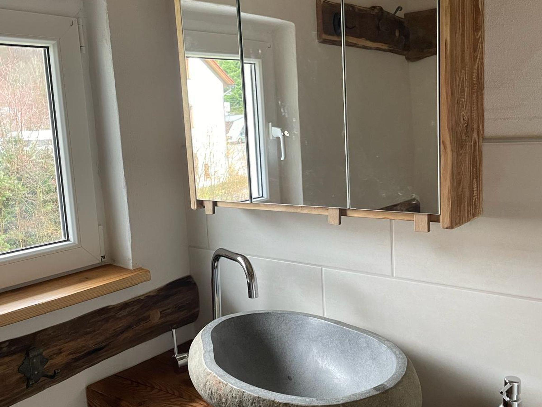 Die neuen rustikal eingerichteten Nassräume mit Waschbeken, barrierefreien Duschen und WC befinden sich im EG und OG. Handtücher bitte selber mitbringen.