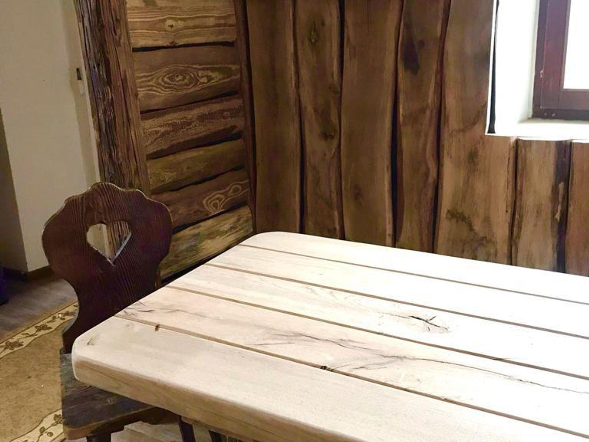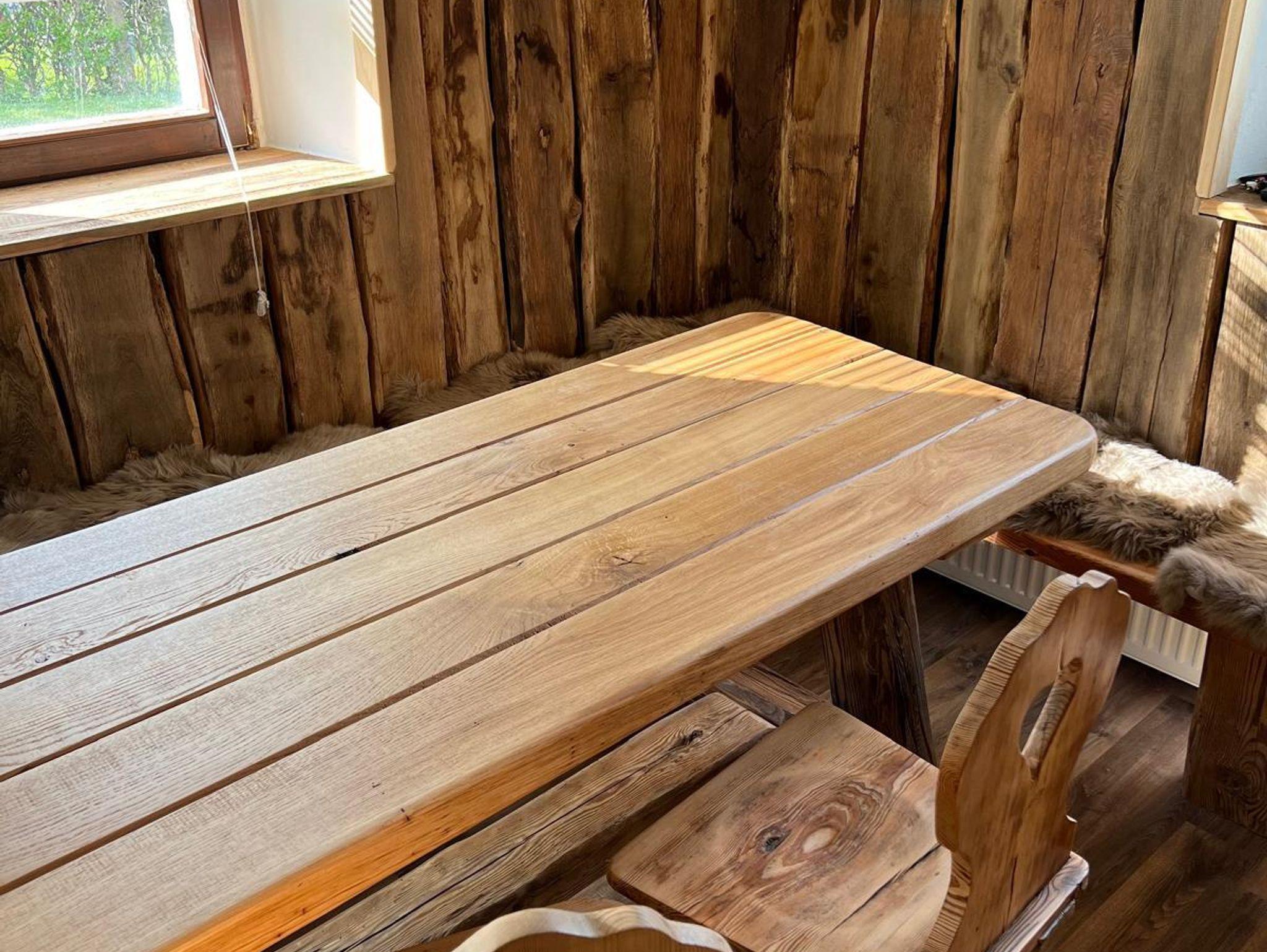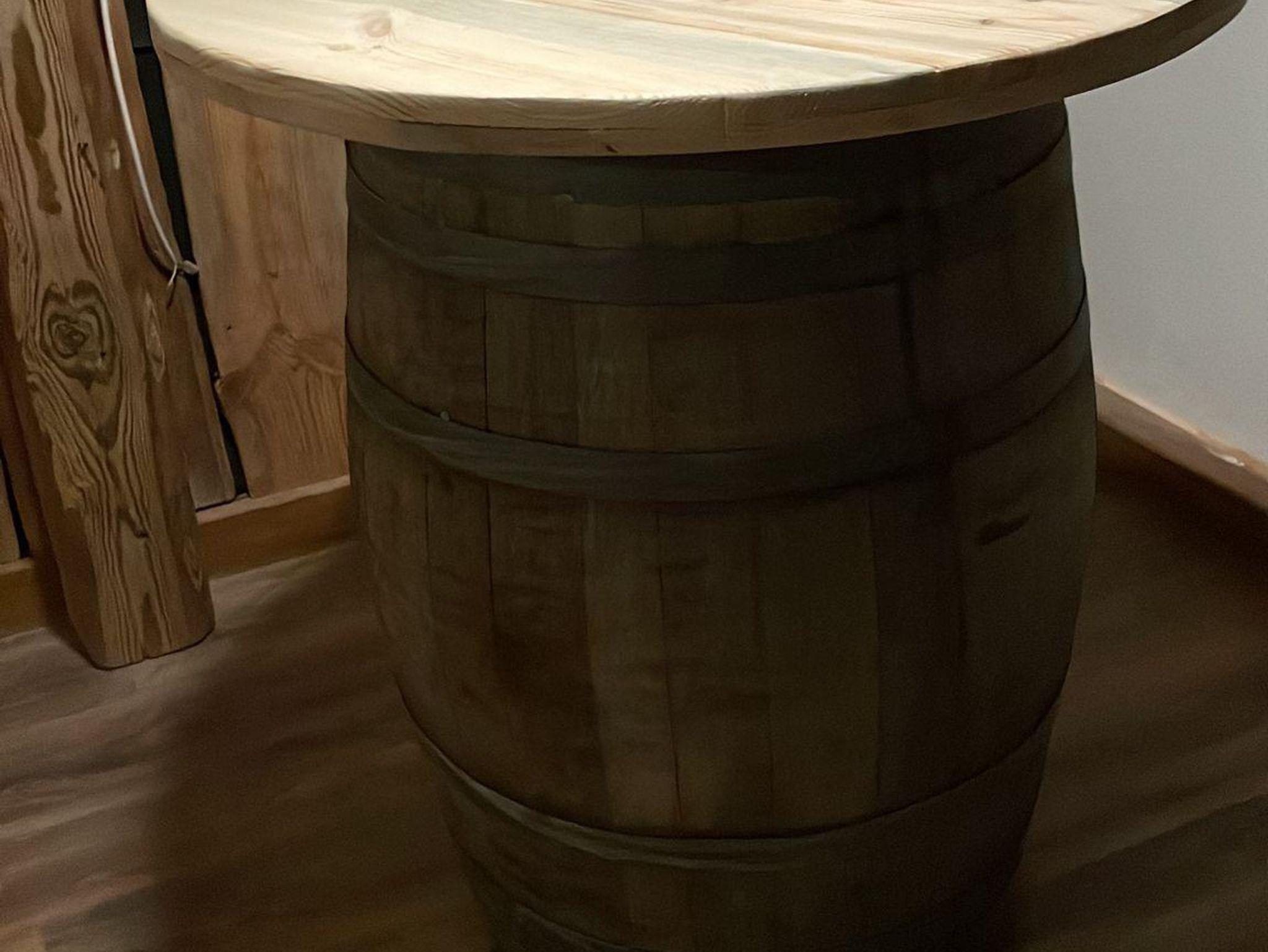 Rustikale Vollholzmöbel, uralte Holzbalken und ein Holzofen im Stil einer alten Berghütte bieten im großen Gastraum eine besondere Atmosphäre. Der Stehtisch, ein altes 225 l Eiche-Weinfass, lädt zum kurzen Verweilen mit einem guten Tropfen ein.