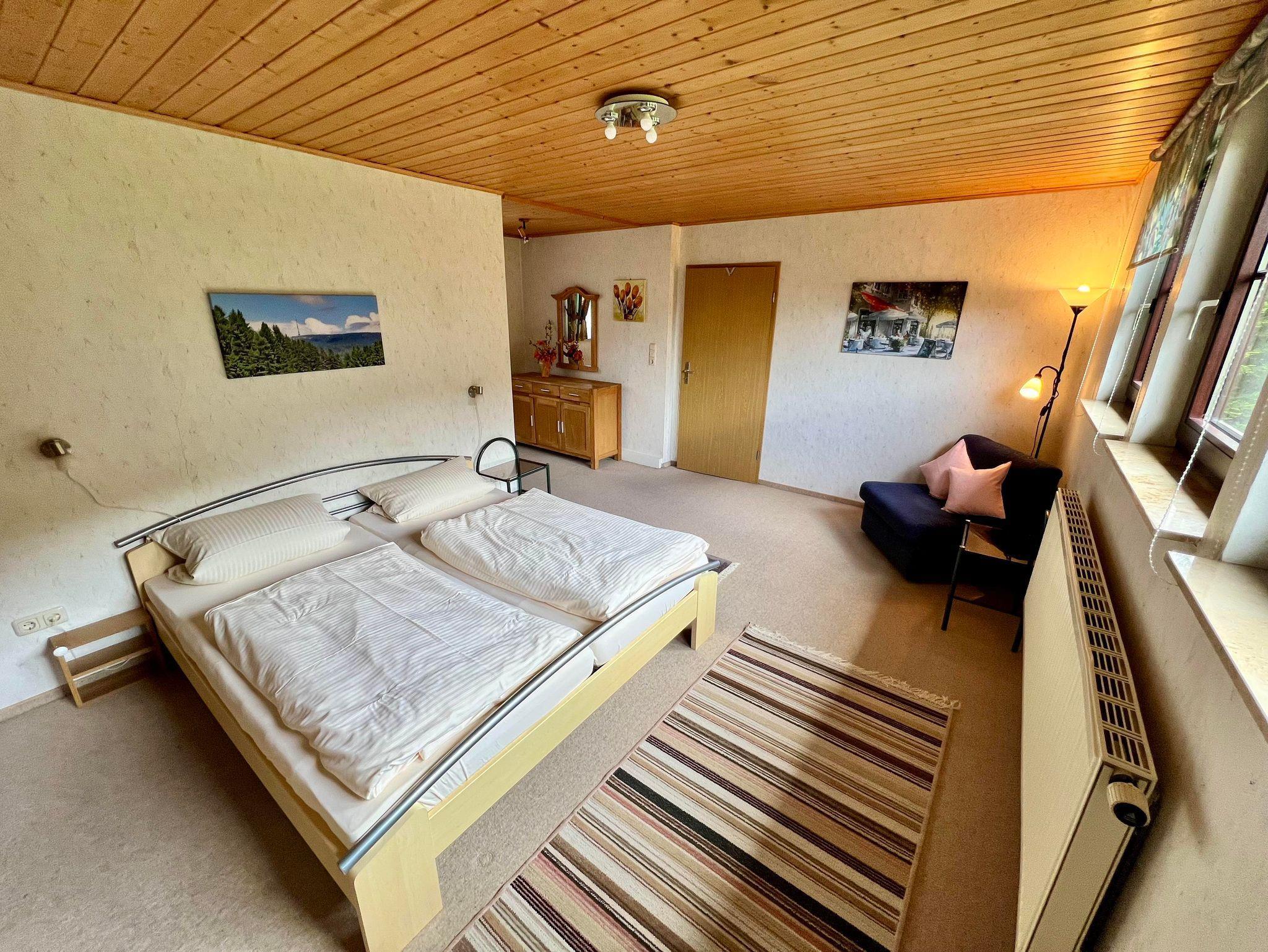 Eine Ferienwohnung (45 qm), Schlafzimmer mit Doppelbett und bei Bedarf Liegecouch, Bad mit Dusche / WC,