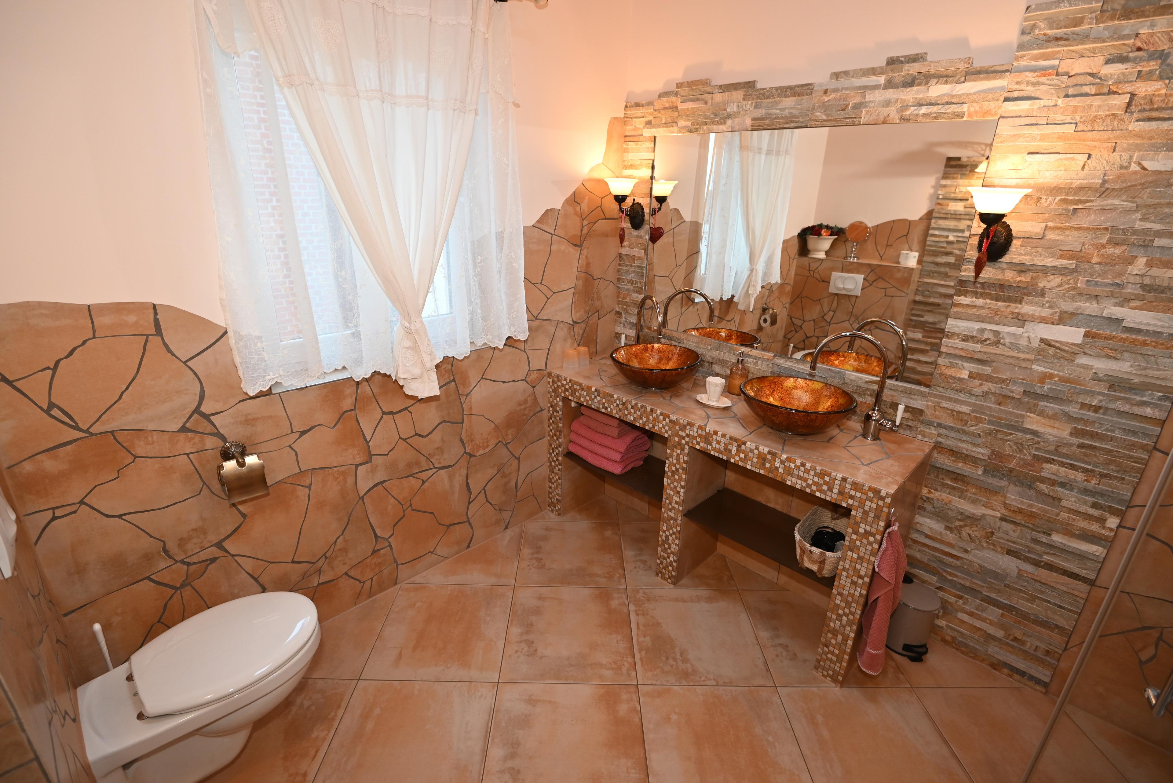 Das hochwertige BADEZIMMER ist dank eines Fensters lichtdurchflutet. Eine ebenerdige Dusche, Handtuchwärmer und 2 Waschbecken gehören zur Ausstattung. Ein Gäste-WC sorgt für extra Komfort.