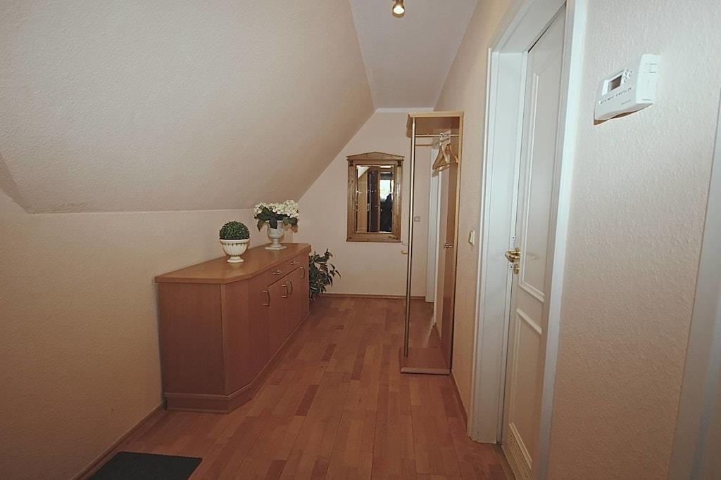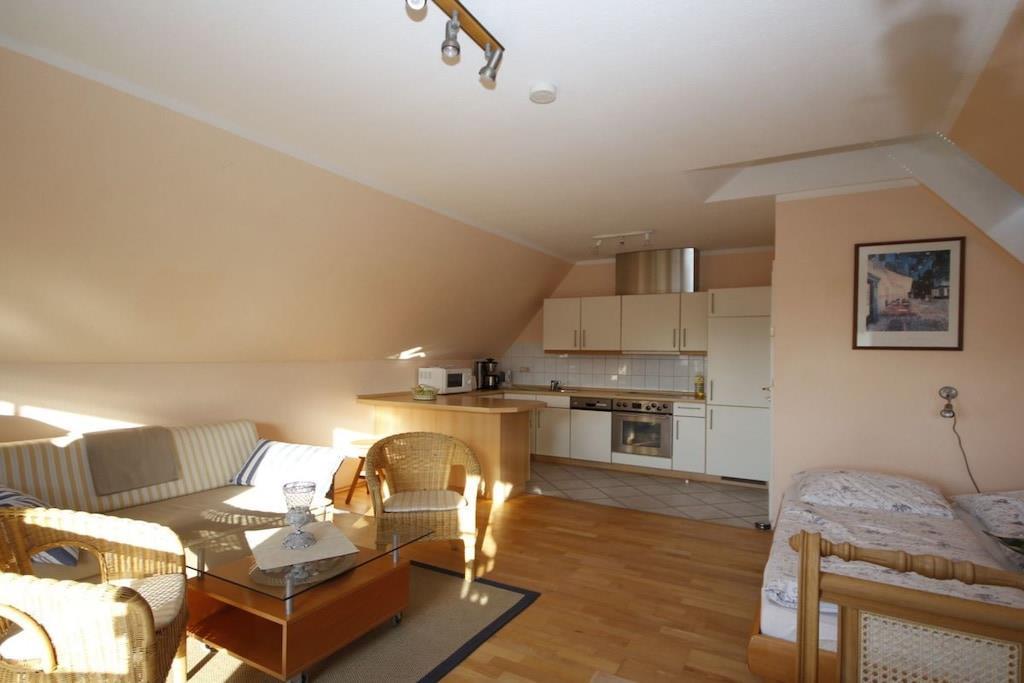 The holiday apartment is located directly on the old river, in Warnemünde, with underground parking and a unique view over the roofs of Altwarnemünde.