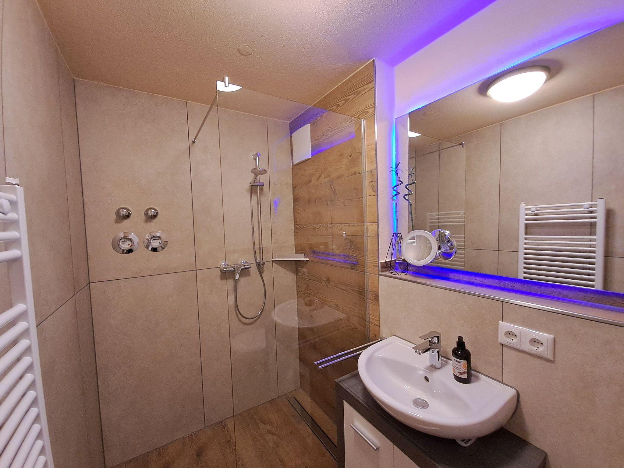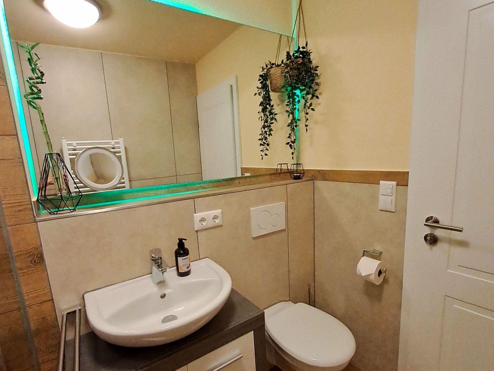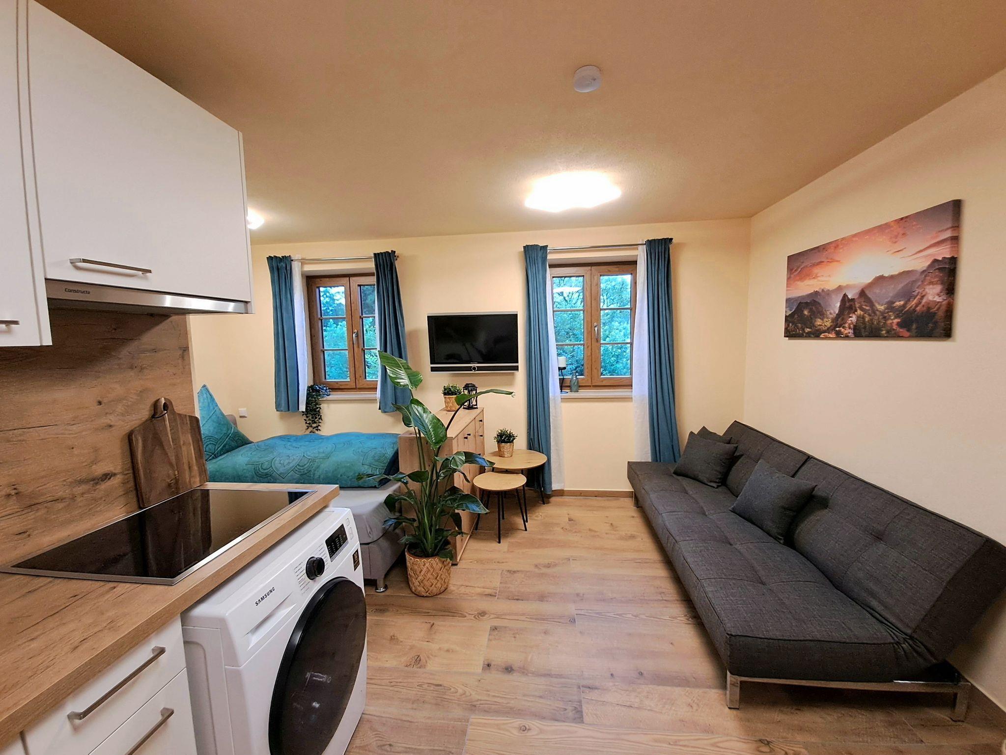 Unsere Ferienwohnung(Neubau2024) ist ein gemütliches ein Zimmerappartement bestehend aus einer vollausgestatteten Küche mit Spülmaschine, einem modernen Hochtisch mit Hochstühlen, einem französischen Bett und einer Schlafcouch, Flachbild TV, kostenlosen WLAN und LAN-Anschluss. Das Badezimmer hat eine begehbare Dusche und einen großen Spiegel. Handtücher und Bettwäsche sind inkludiert. Die Ferienwohnung ist über eine Außentreppe begehbar, direkt von den Parkplätzen (kostenlos). Sie liegt auf einem landwirtschaftlichen Anwesen.
