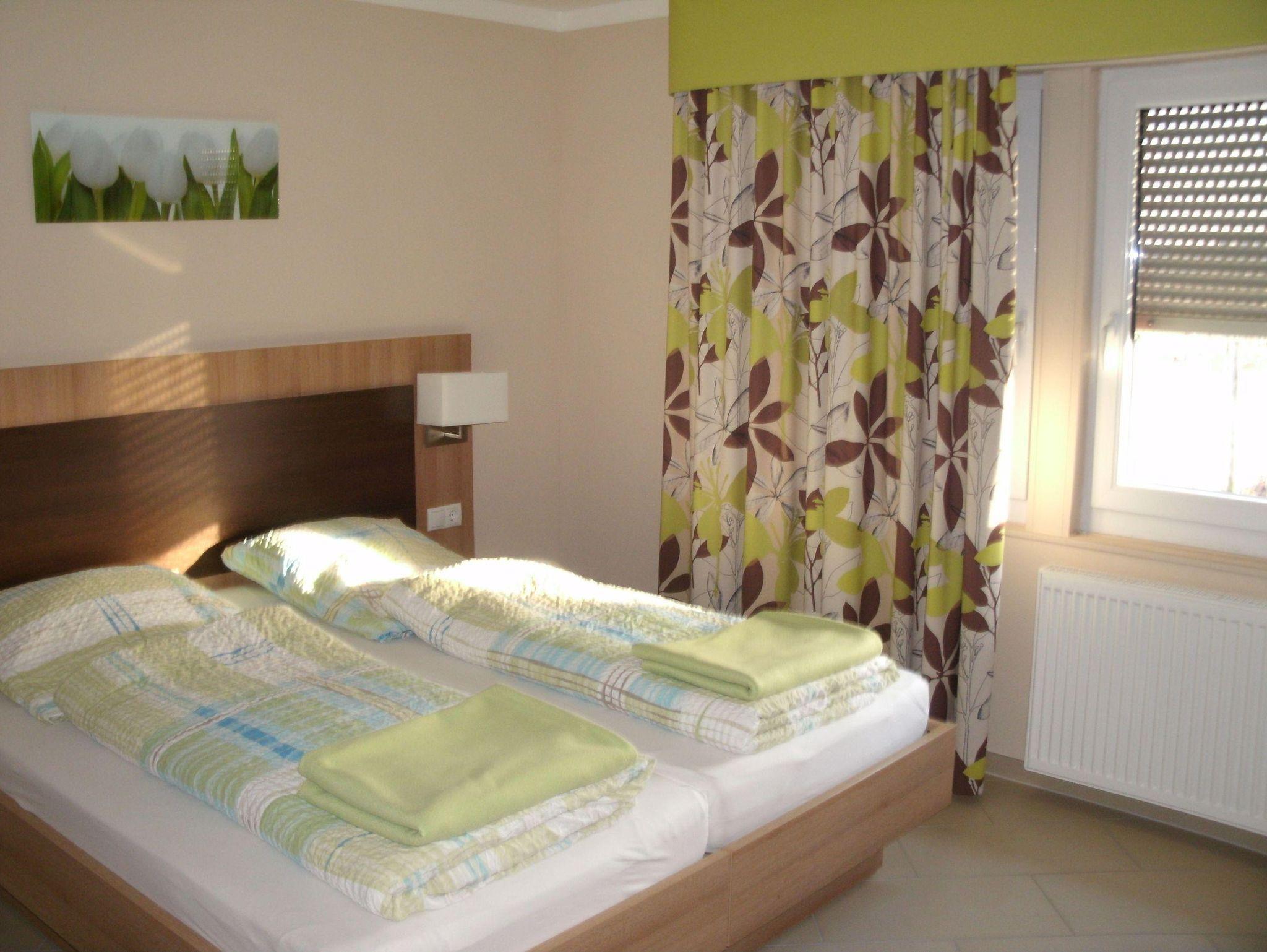 Die komfortable, liebevoll eingerichtete 75 m² große Ferienwohnung bietet Platz für 2 – 6 Personen. Sie besteht aus Diele, 2 Doppelzimmern (Einzelbetten) einer Ausziehcouch für 2 Personen, einer komplett ausgestatteten Küche mit Essecke, einem Bad mit begehbarer Dusche und WC und einem weiteren separaten WC. Die Wohnung ist rollstuhlgerecht. Eine Sitzecke im blumengeschmückten Innenhof des Weingutes lädt zum Verweilen ein.