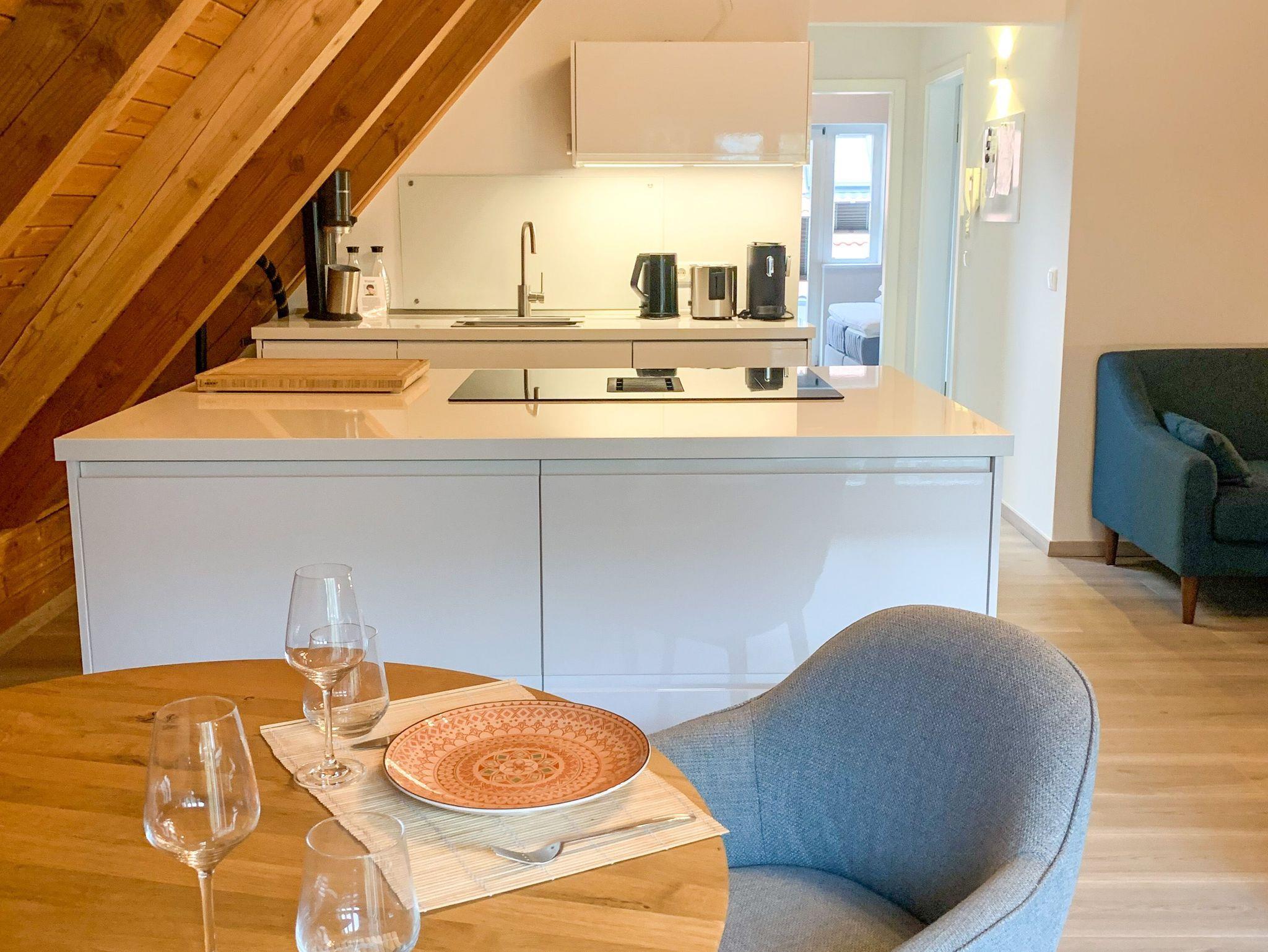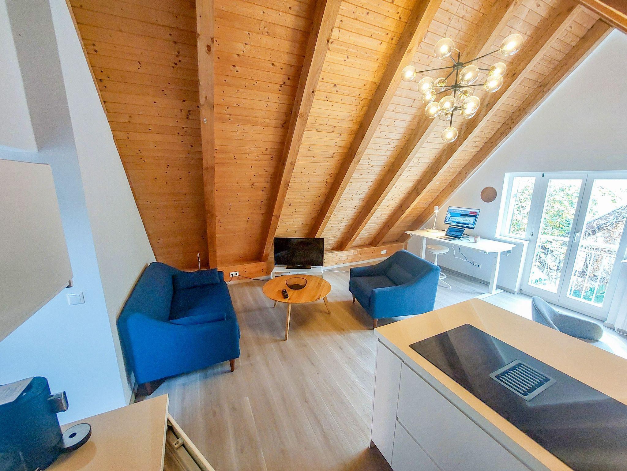 Für die Arbeit im Apartment kannst du optional einen höhenverstellbaren Schreibtisch mit großem Bildschirm hinzubuchen, der sich ideal für produktives Arbeiten eignet. Die Küche ist voll ausgestattet ? vom Cerankochfeld über den Backofen bis zur Spülmaschine ist alles für das Kochen und die tägliche Versorgung da, ergänzt durch eine CoffeeB-Kaffeemaschine, Frenchpress, Toaster, Wasserkocher und ausreichend Geschirr. Auch grundlegende Vorräte wie Spülmittel, Gewürze und Kaffee gehören zur Ausstattung. Im modernen Bad findest du eine komfortable Regendusche und alles, was du für deine persönliche Pflege brauchst, inklusive Hand- und Duschtüchern, Seife und Föhn.