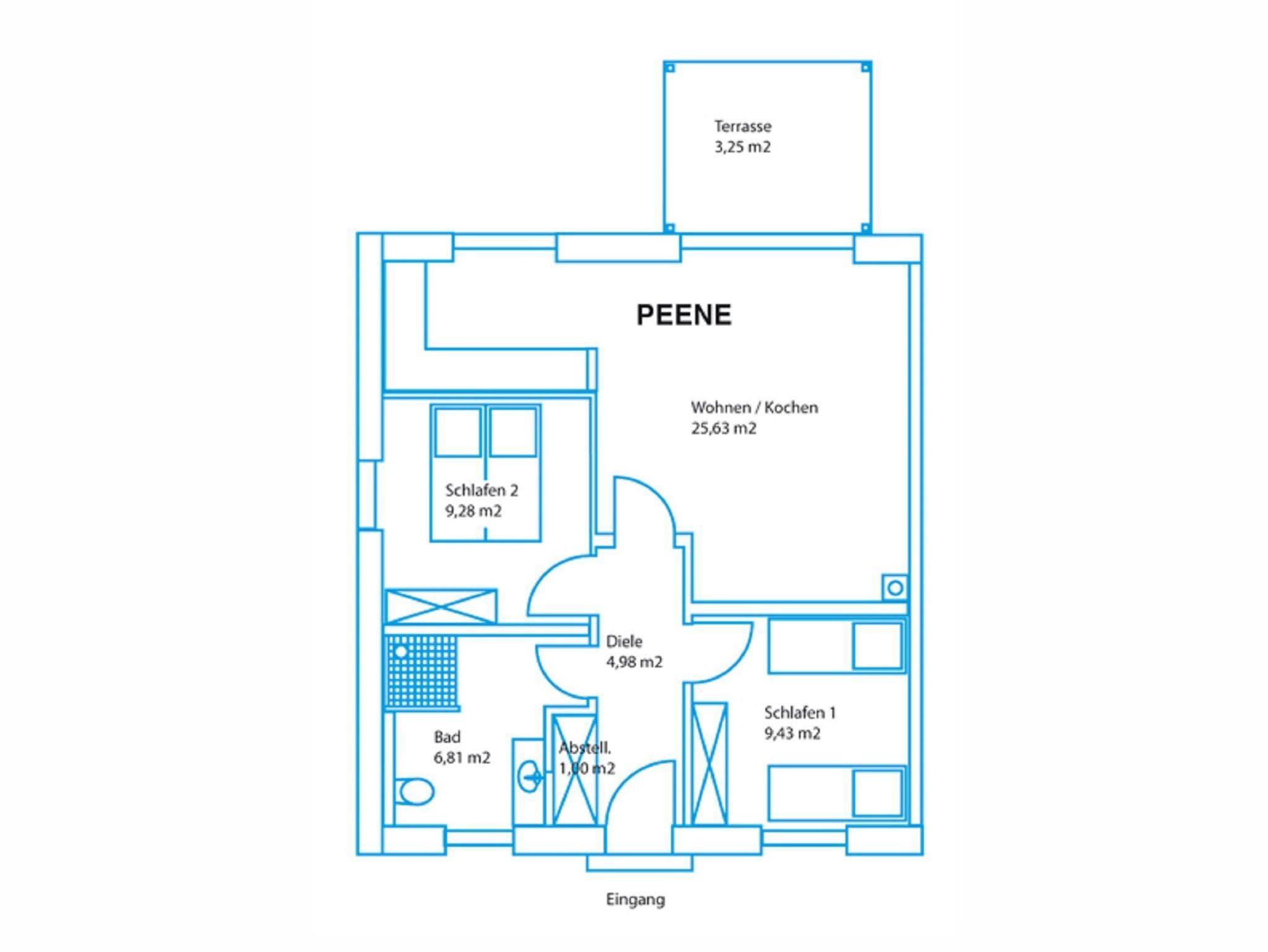Die Ferienwohnung Peene befindet sich im Erdgeschoss des Hauses und ist ca. 59 m² groß. Das geräumige Wohnzimmer ist ausgestattet mit einem gemütlichen Sofa, Sessel zum Lesen und Fernsehen, mit einem Fernseher und mit einem Radio, sowie mit einem Esstisch und vier Stühlen. Durch das große Terrassenfenster haben Sie einen schönen Ausblick ins Grüne. Die offene Küchenzeile verfügt über eine Ausstattung zum alltäglichen Kochen: Geschirr, Kochgeschirr, Ceranfeld, Backofen, Kühlschrank, Spülmaschine, Mikrowelle, Kaffeemaschine, Wasserkocher und Toaster.
