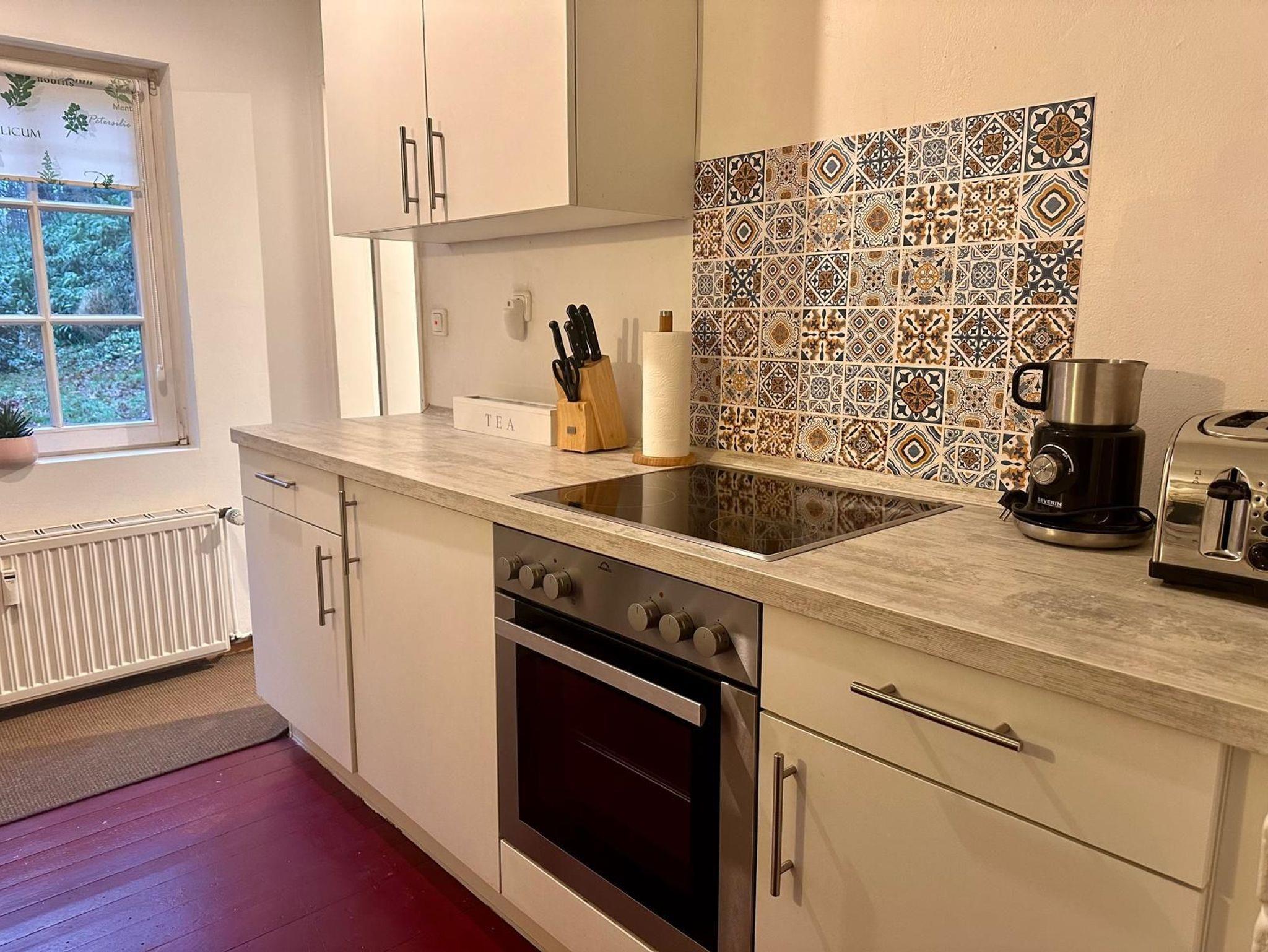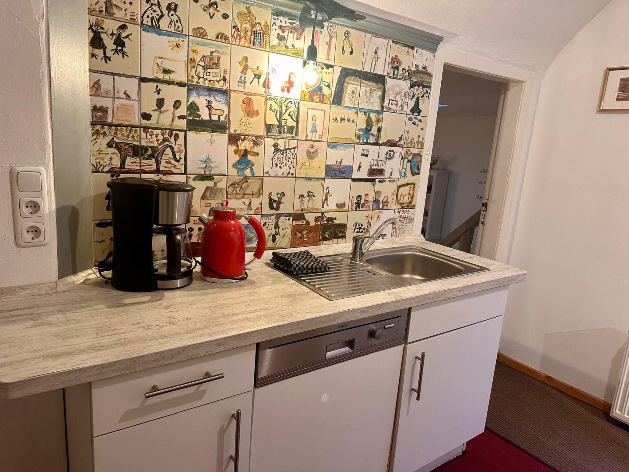 Gemütliches Schlafzimmer mit komfortablem. Boxspring Bett (180 cm, Länge 200 cm), Dachfenster. Küche mit Einbaugeräten (4 Kochplatten, Backofen, Geschirrspüler, Kühlschrank) komplett ausgestattet,