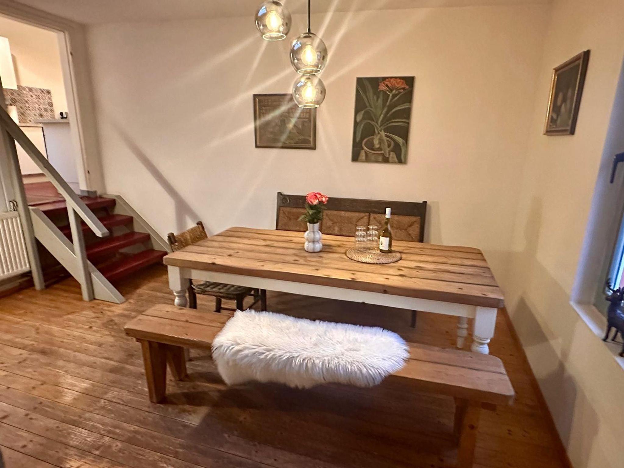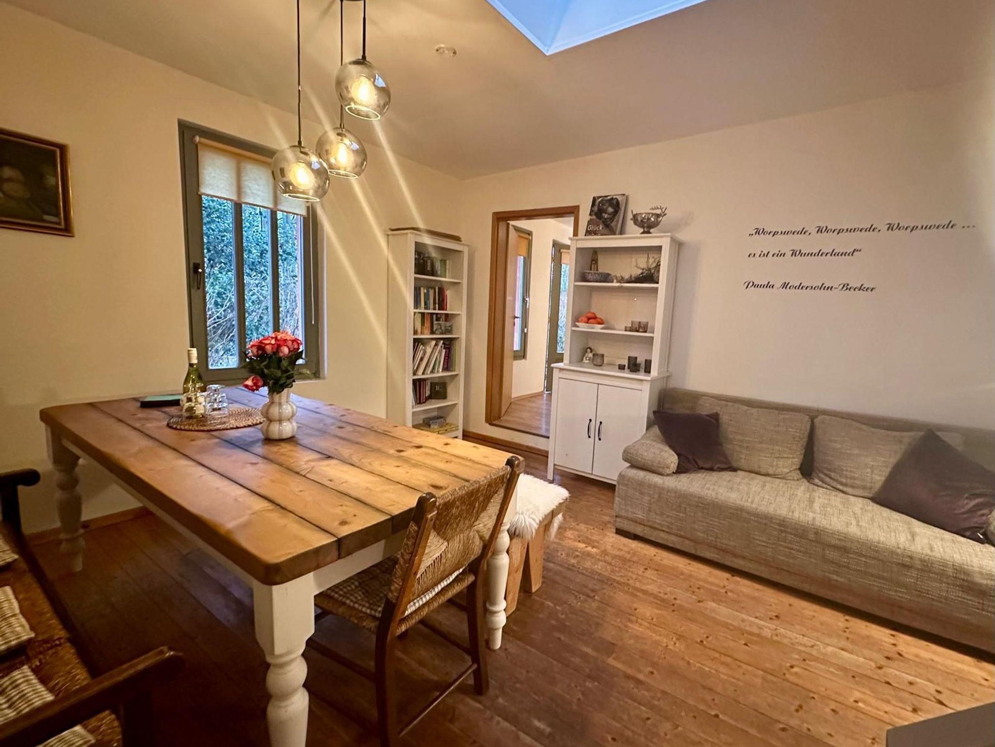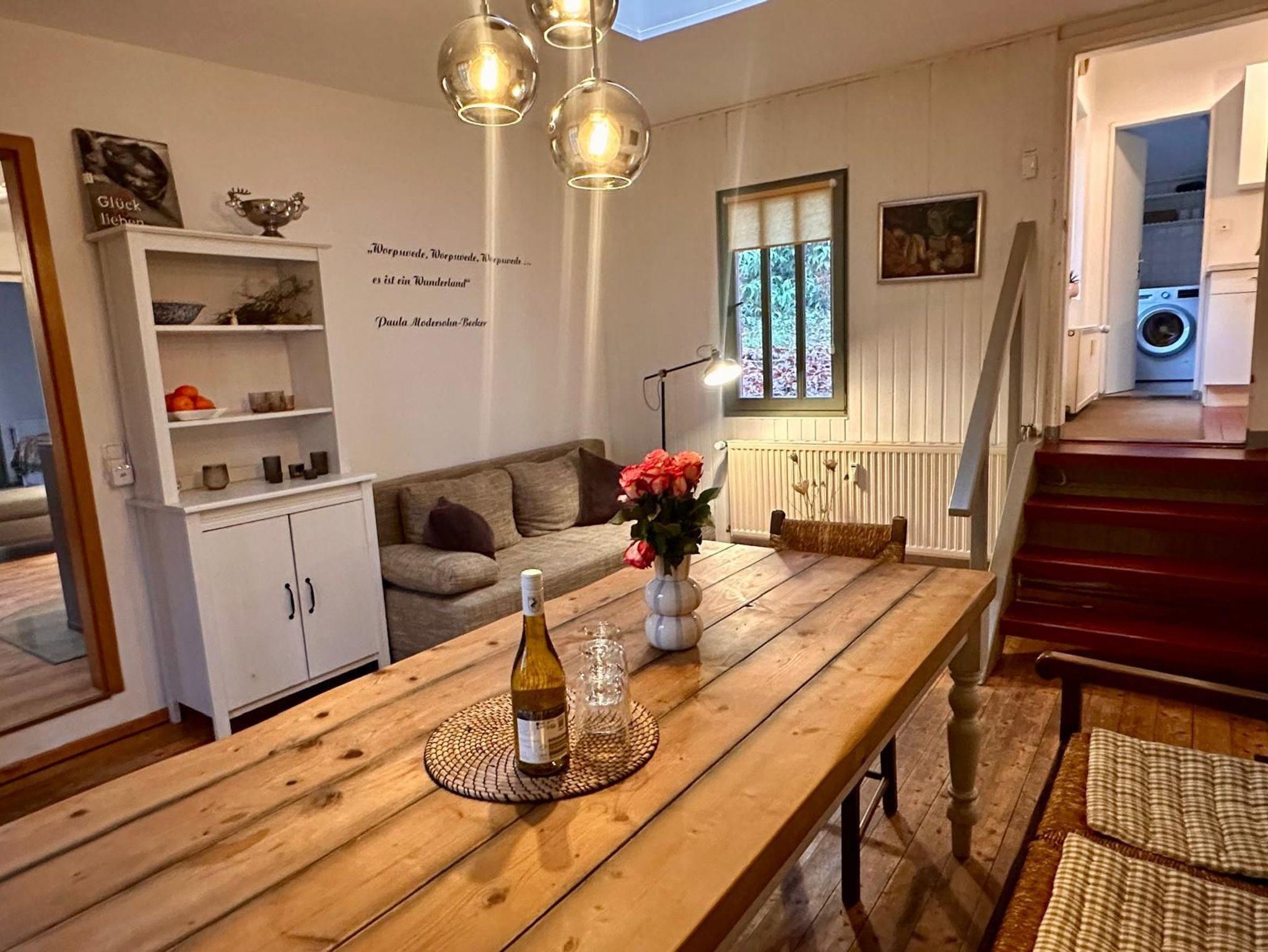 3 Zimmer-Wohnung, 86 m2, Erdgeschoss, geräumig und hell, 2013 vollständig renoviert, modern und geschmackvoll, u.a. mit Worpsweder Antiquitäten und Bildern eingerichtet: sehr gr. helles Wohnzimmer mit gemütlicher Sitzecke, Fliesenboden, 2 komf. Schlafcouches, Flachbild-TV, Stereoanlage/DVD. Gemütliches Schlafzimmer mit komf. Boxspring Bett (160 cm, Länge 190 cm), Dachfenster. Küche imt Einbaugeräten (4 Kochplatten, Backofen, Geschirrspüler, Kühlschrank) komplett ausgestattet, sep. Esszimmer mit Esstisch, Sitzecke, Dielenboden. Dusche/WC. Gasheizung und Kaminofen.