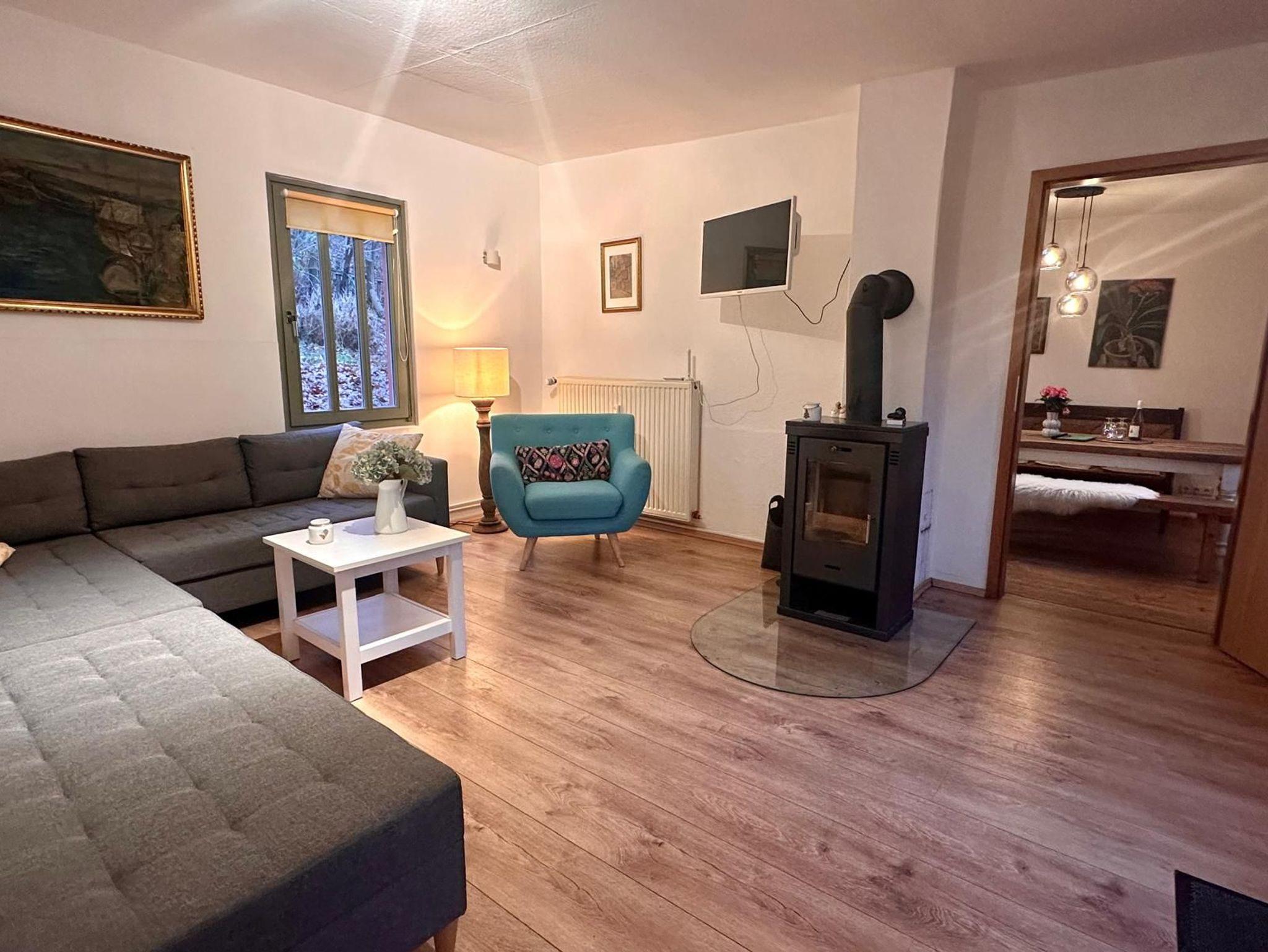 Wohnzimmer mit gemütlicher Sitzecke, und Kaminofen, Flachbild-TV, Stereoanlage/DVD.