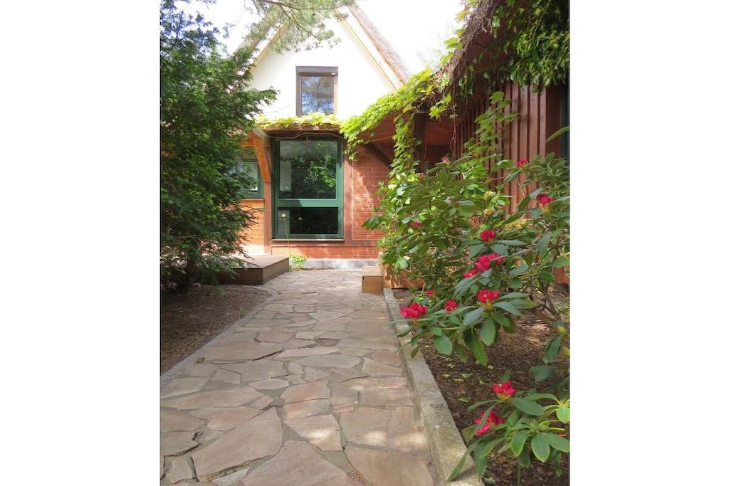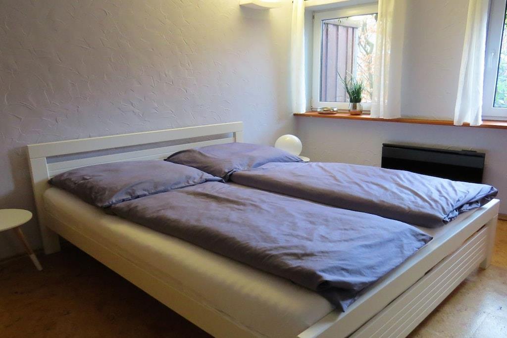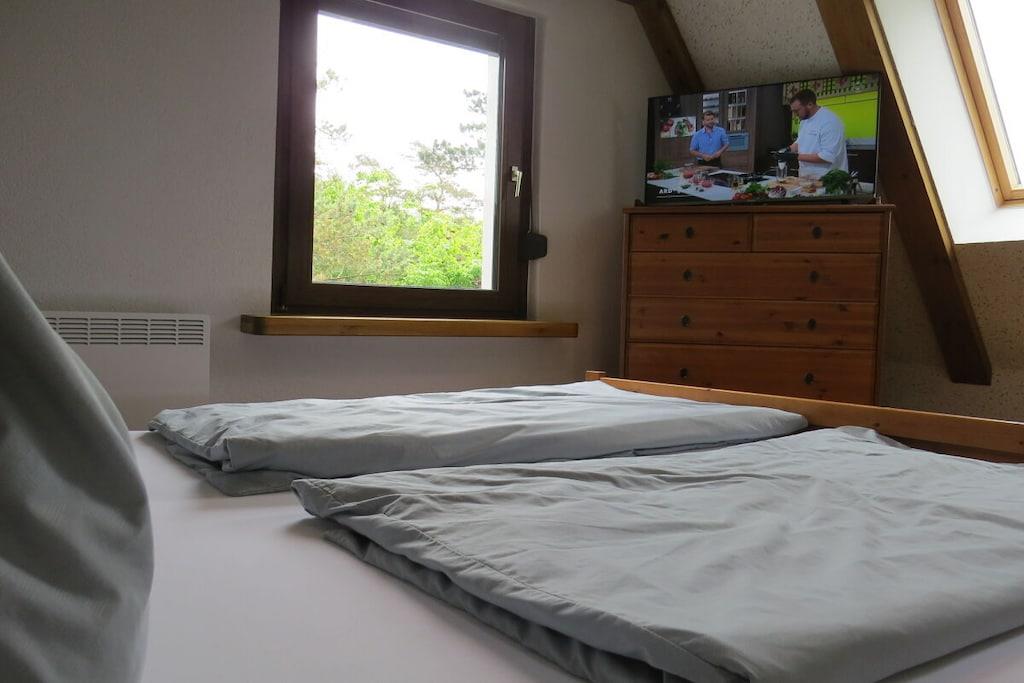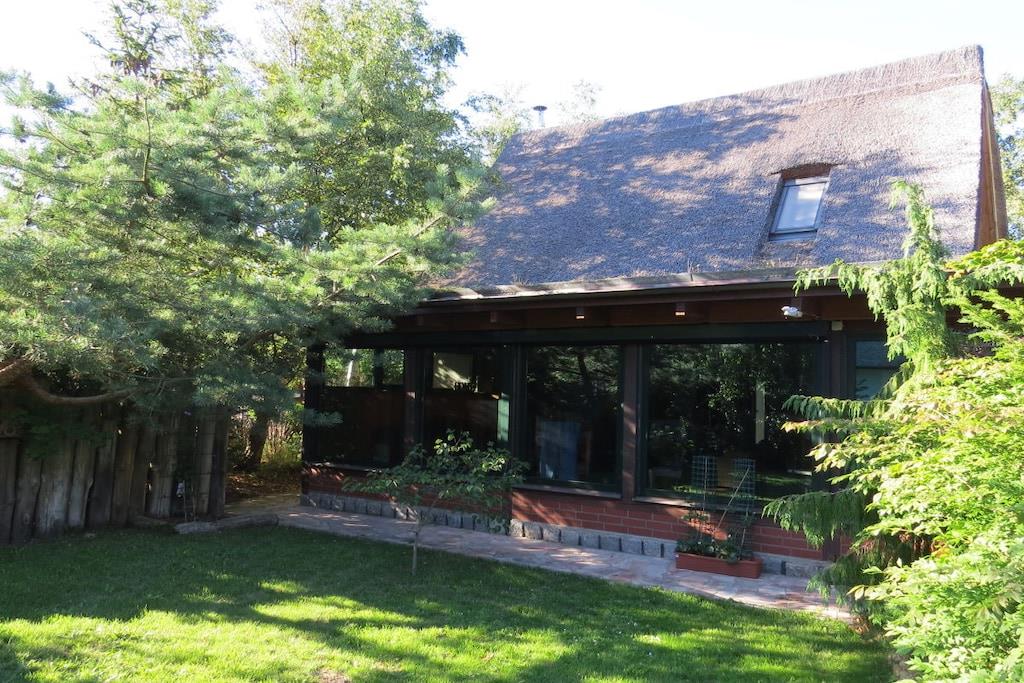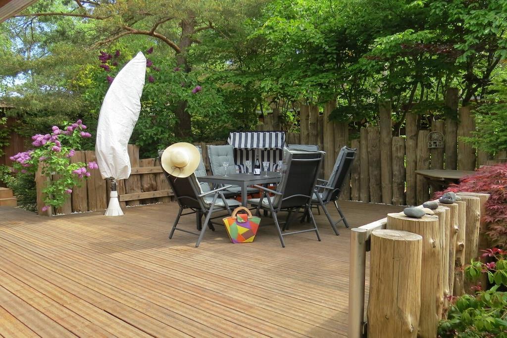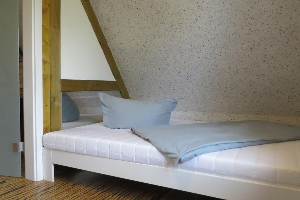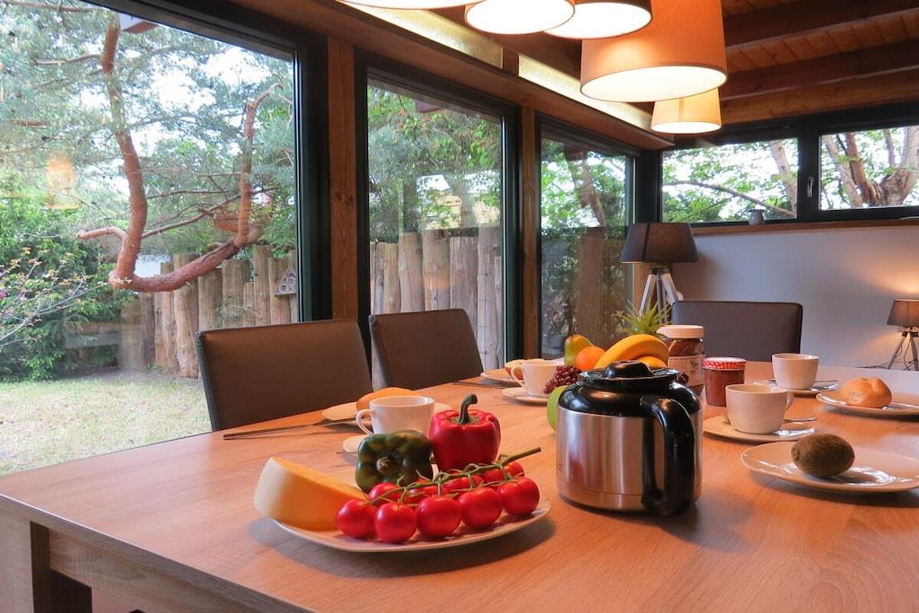 Tillbringa underbara soliga timmar och kvällar på den stora bambuterrassen. Semesterhuset har ett rymligt vardagsrum med öppen spis och matplats med utsikt över trädgården. Intill vardagsrummet finns ett litet badrum med dusch och toalett. Köket med öppen planlösning är modernt och fullt utrustat. Längst bak i huset finns ett sovrum med dubbelsäng (1,80m x 2,00m) och en separat toalett i ett angränsande rum. Det stora badrummet har badkar, dusch och toalett. Tvättmaskin och torktumlare finns också på denna våning. På övervåningen hittar du två sovrum. Det mindre rummet, med två enkelsängar (1,40m x 1,90m), kan användas som sovplats för barn. Det andra sovrummet har en dubbelsäng (1,80m x 2,00m).
