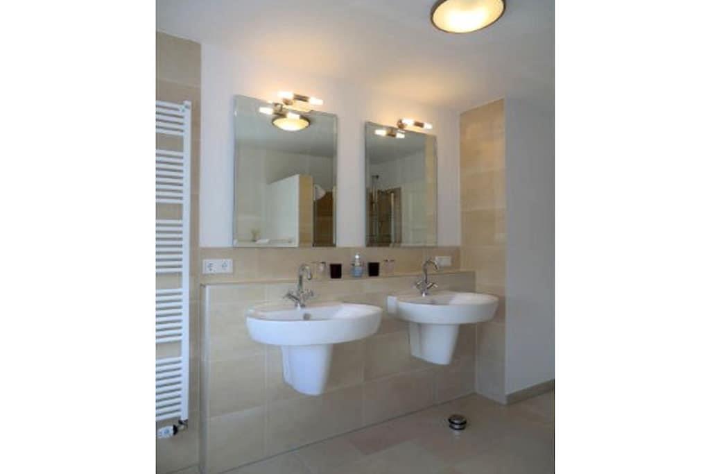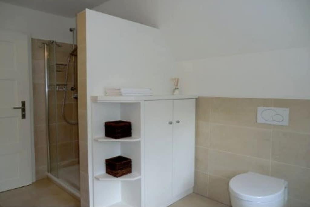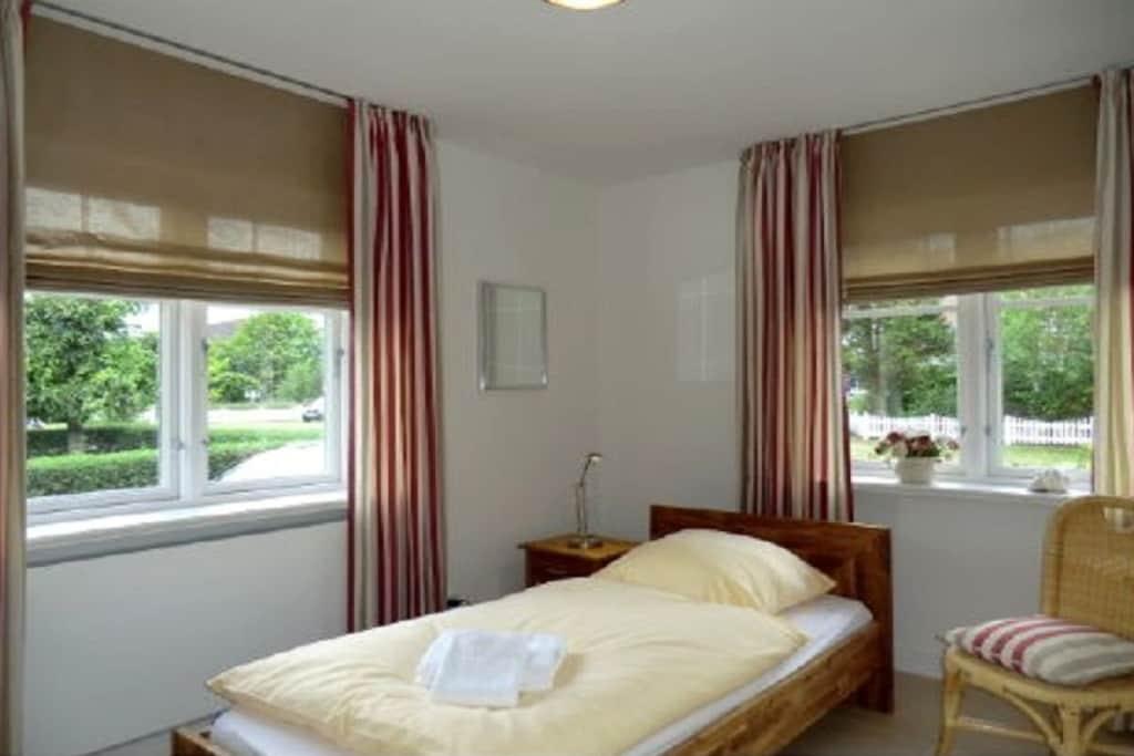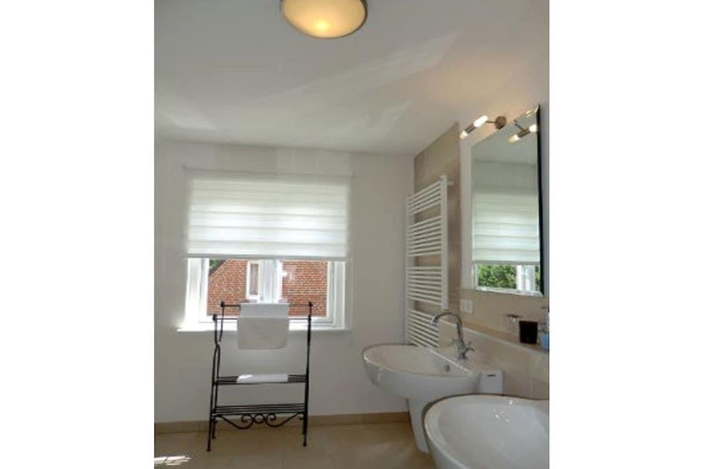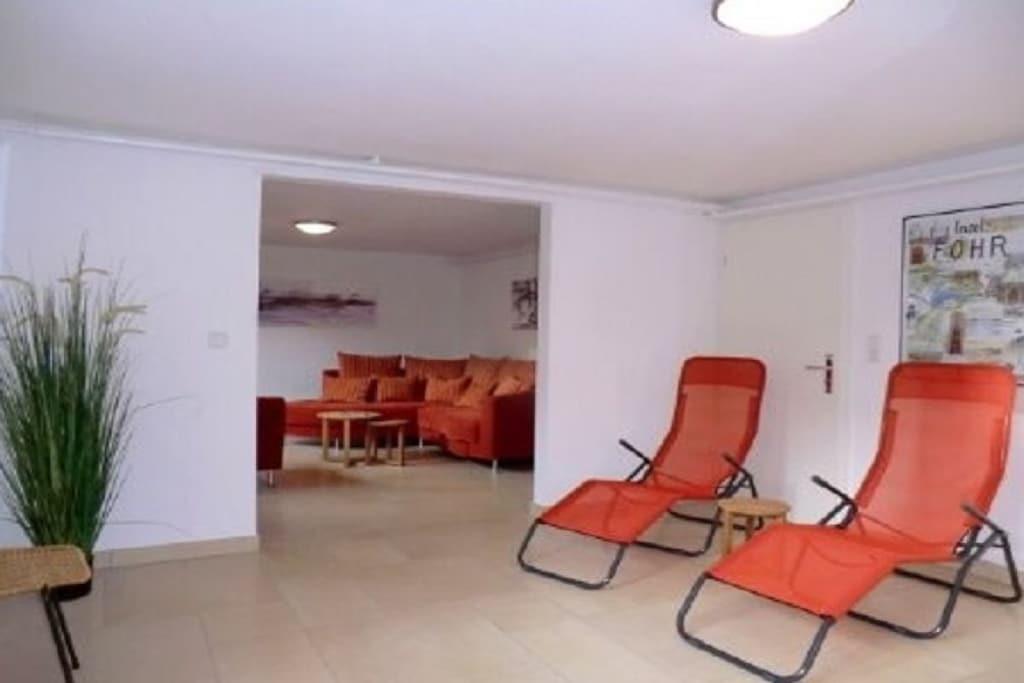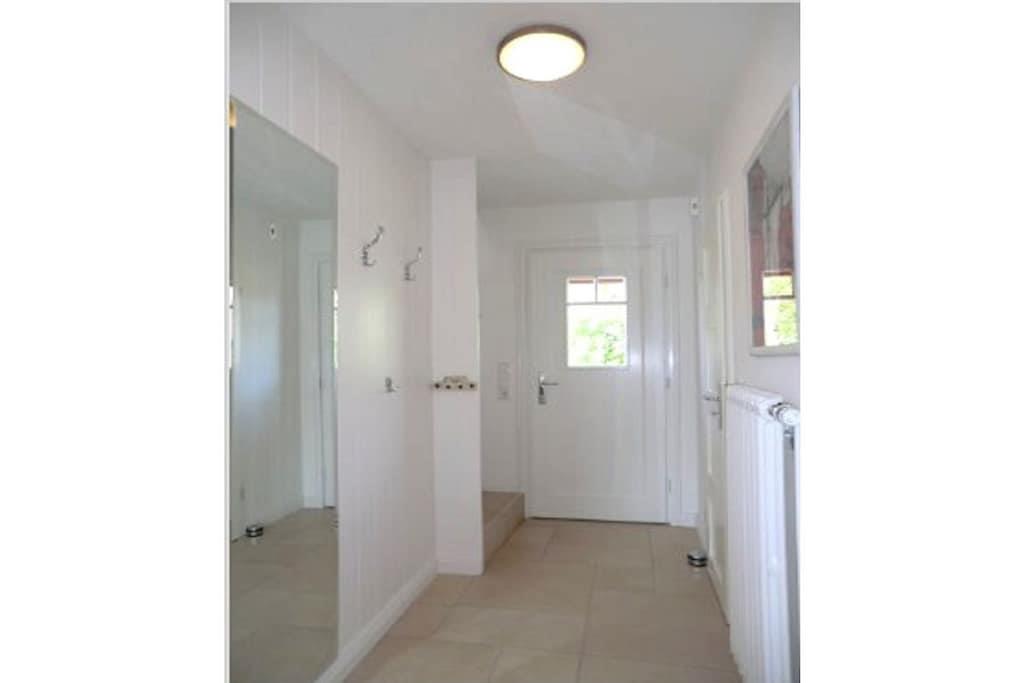 Bottenvåning med entréhall och garderob, gästtoalett med dusch, modernt och fullt utrustat kök med tillgång till den stora matsalen med braskamin, tillgång till trädgården och vardagsrummet, sovrum med enkelsäng. Vind med öppen arbetsyta och internetanslutning (via DSL-kabel), rymligt duschrum/toalett, två sovrum med dubbelsängar och ytterligare ett sovrum med enkelsäng. Hel källare: Bastu med tillgång till relax-/lekrum, grovkök med Miele-apparater (tvättmaskin och torktumlare).
