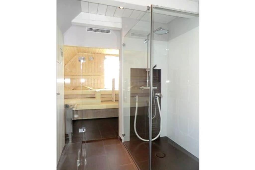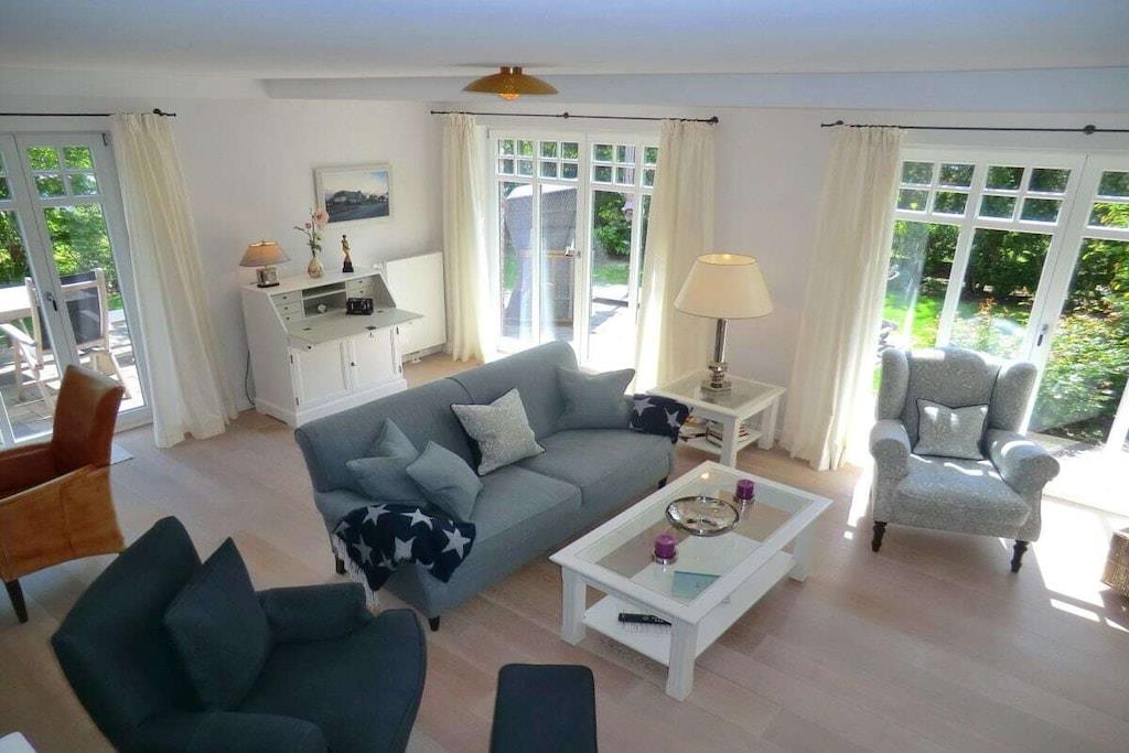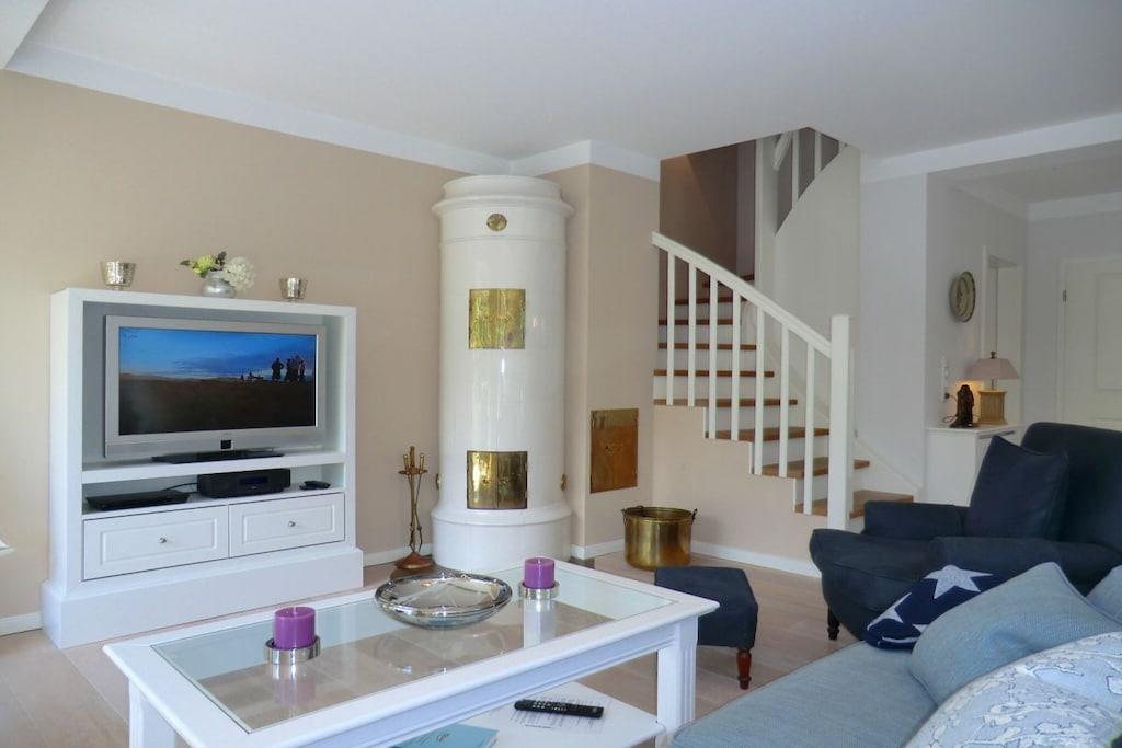 På våning 1: (sovrum(, , dubbelsäng), sovrum(, enkelsäng, enkelsäng)) , , Hall(, ), Kök(Öppet kök, Kokplattor, kaffebryggare, ugn, diskmaskin), ardags- och matrum(, , TV, matbord, Braskamin, DVD-spelare, stereo), badrum(, WC, badkar, dusch, handfat), guest toilet(, WC, handfat), relaxavdelning(bastu), Tillgång till Internet, torktumlare, tvättmaskin, värme, terrass(Strand, trädgårdsmöbler, solstole), trädgård(Gräsmatta), parkering, strykbräda, strykjärn, torkskåp