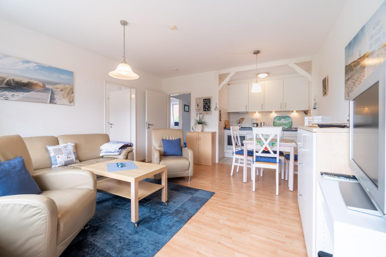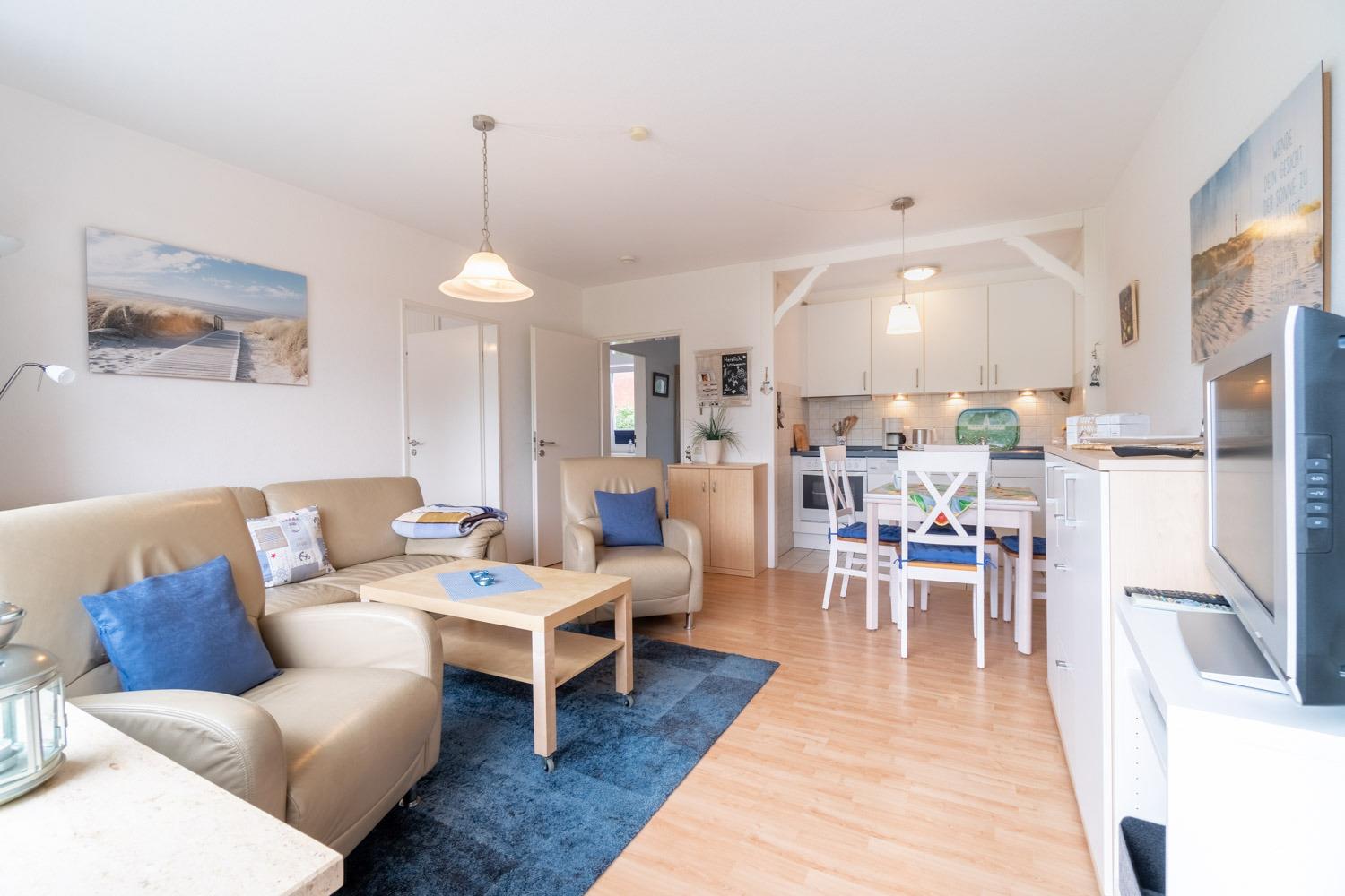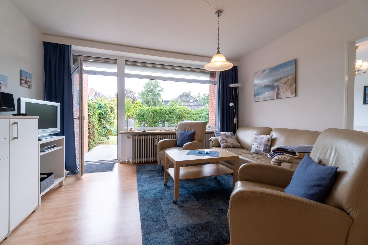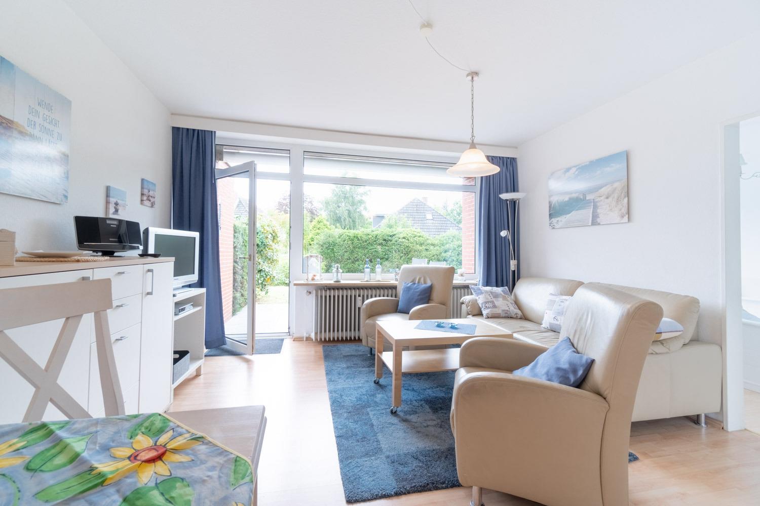 Dieser gemütliche und helle Bungalow liegt nur 500 m vom Südstrand entfernt, bis zur Promenade sind es gerade mal 10 Gehmin.