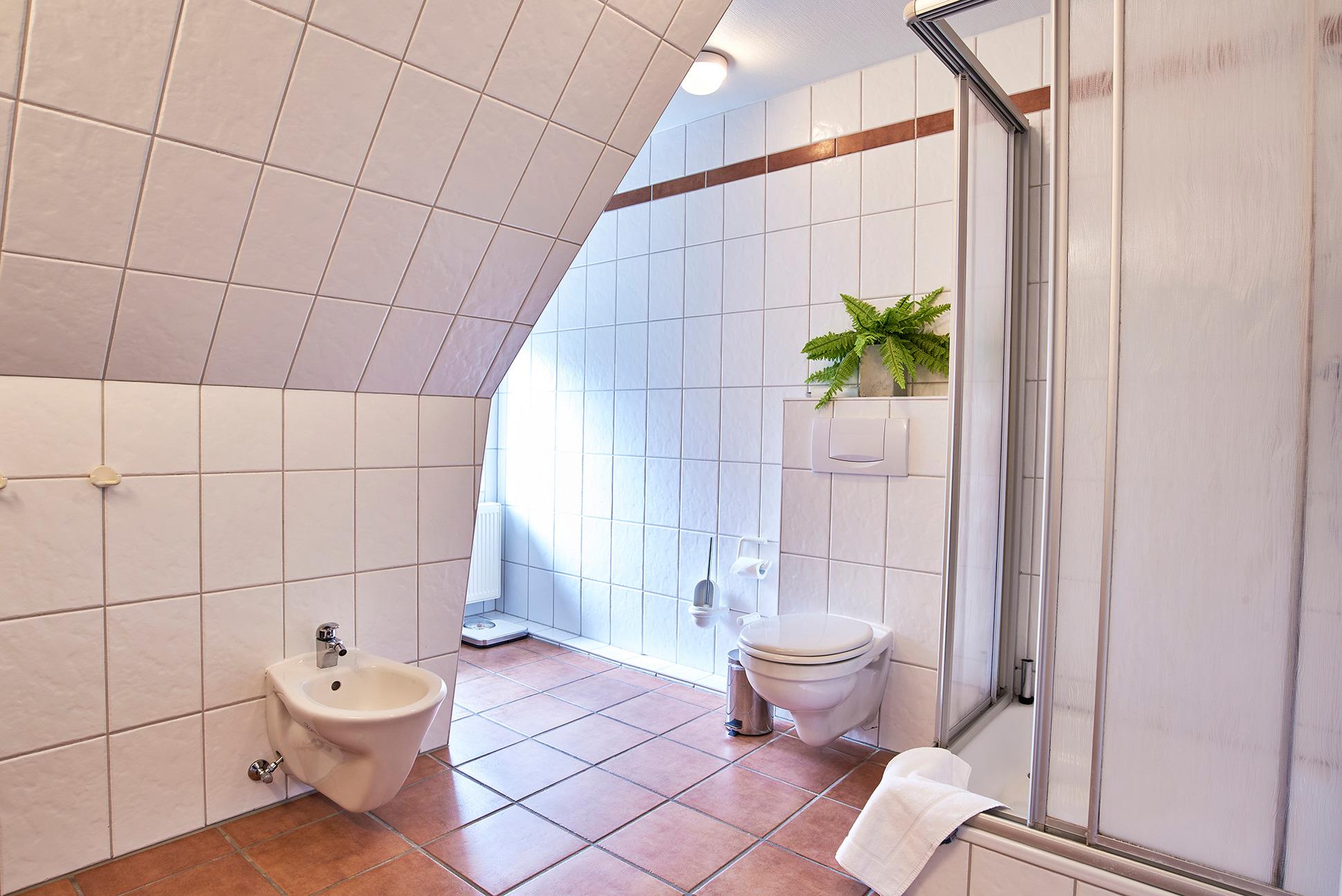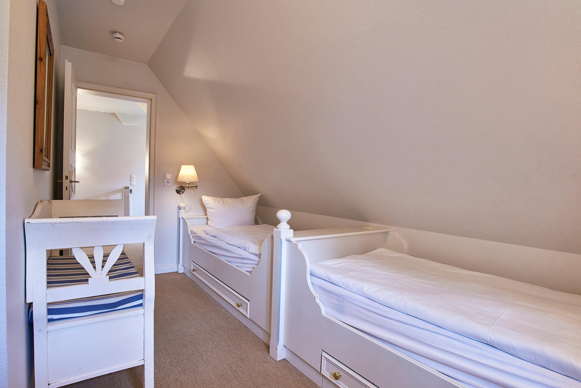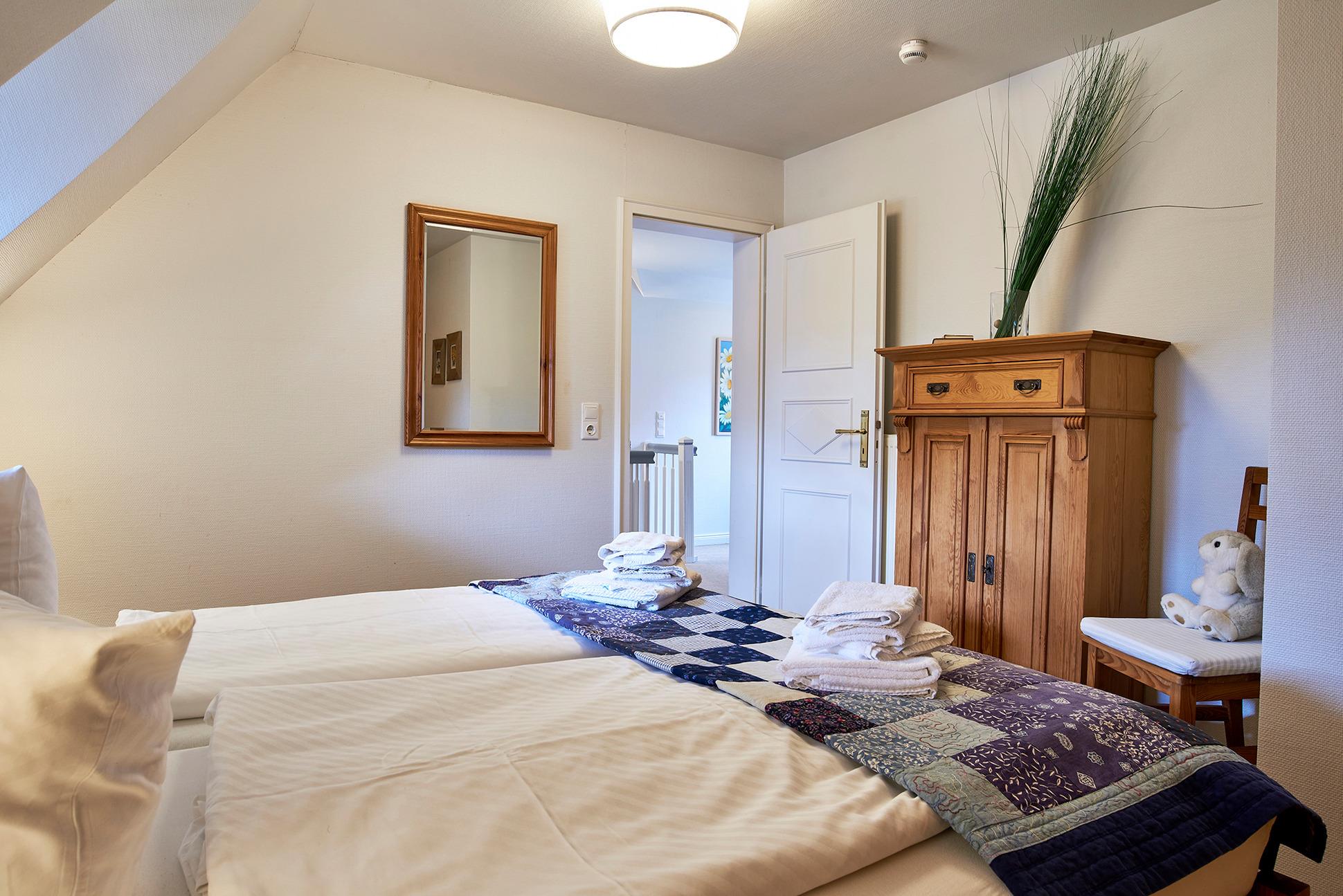 Das Obergeschoss verfügt über zwei Schlafzimmer: 1 Doppelbett im Elternschlafzimmer, 2 Einzelbetten im Stil von Alkoven im Kinderzimmer sowie eine kleine Spielgalerie im Flur laden zum Verweilen ein. Das Duschbad ist mit WC und Bidet ausgestattet. Das gesamte Mobiliar ist hochwertig und sehr liebevoll zusammengestellt. Auf der Süd-Terrasse, mit bequemen Möbeln und Strandkorb, kann man die Stunden im Freien genießen. Dabei wünschen wir Ihnen bereits jetzt viel Vergnügen und hoffen, dass die Nordseeluft und das Wetter dazu beitragen!