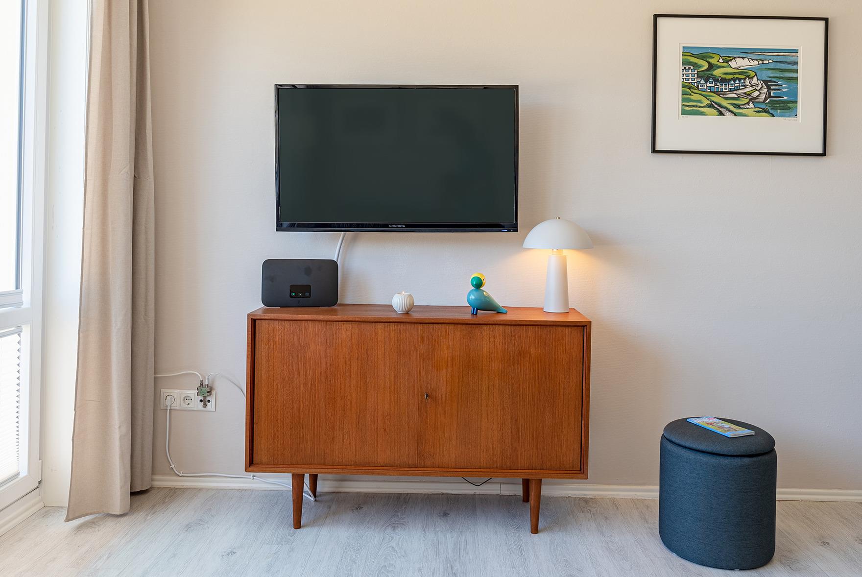Auf ca. 40 qm stehen Ihnen ein kleiner Flur, ein Schlafzimmer mit Doppelbett und 2. TV, Duschbad/WC, offene Einbauküche und ein kombinierter Wohn-Essbereich zur Verfügung.