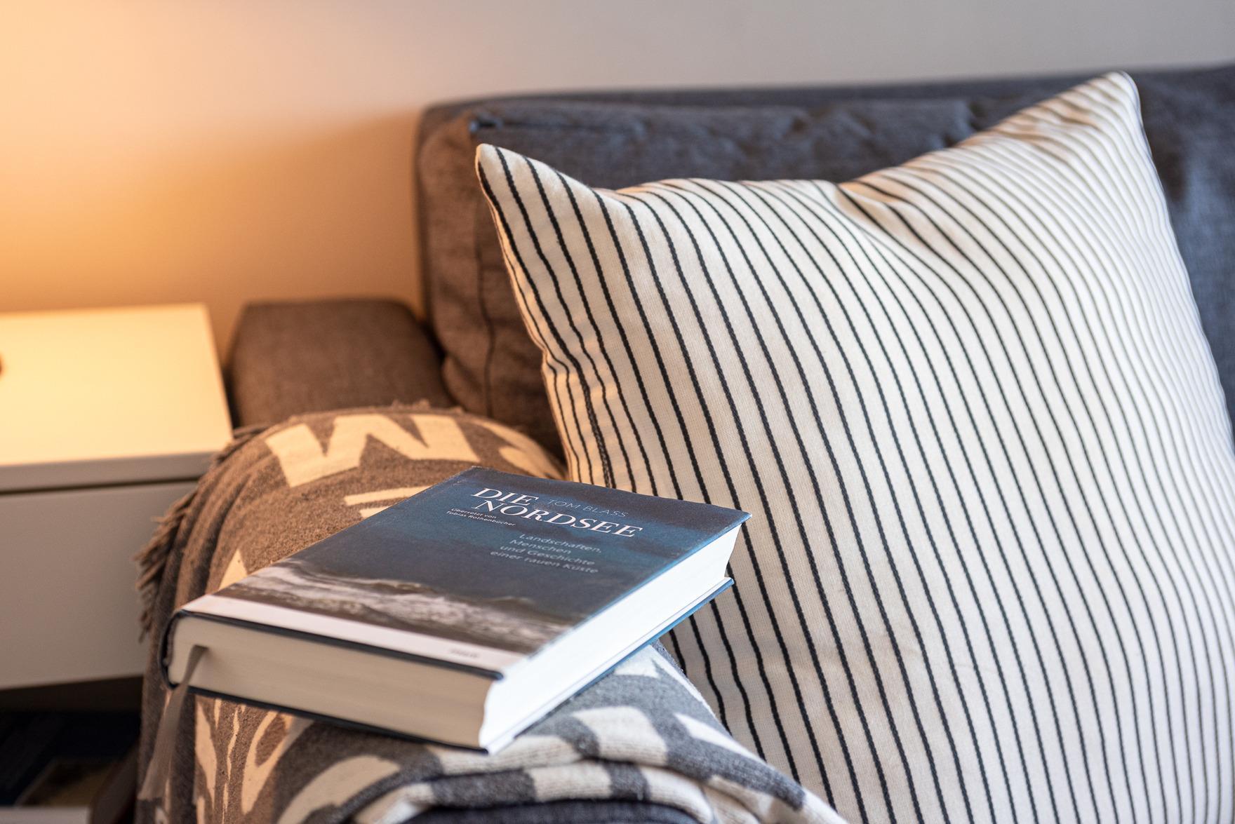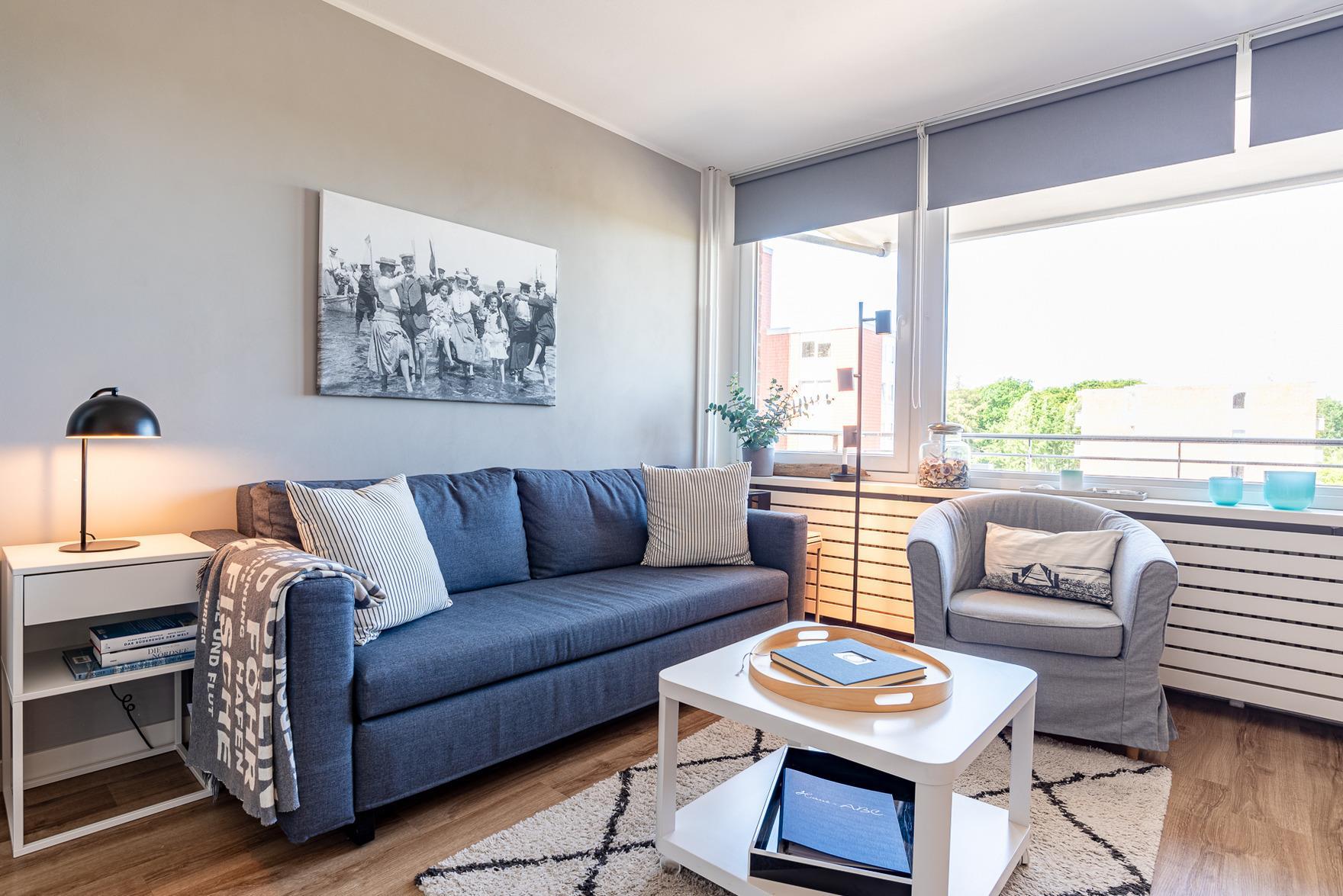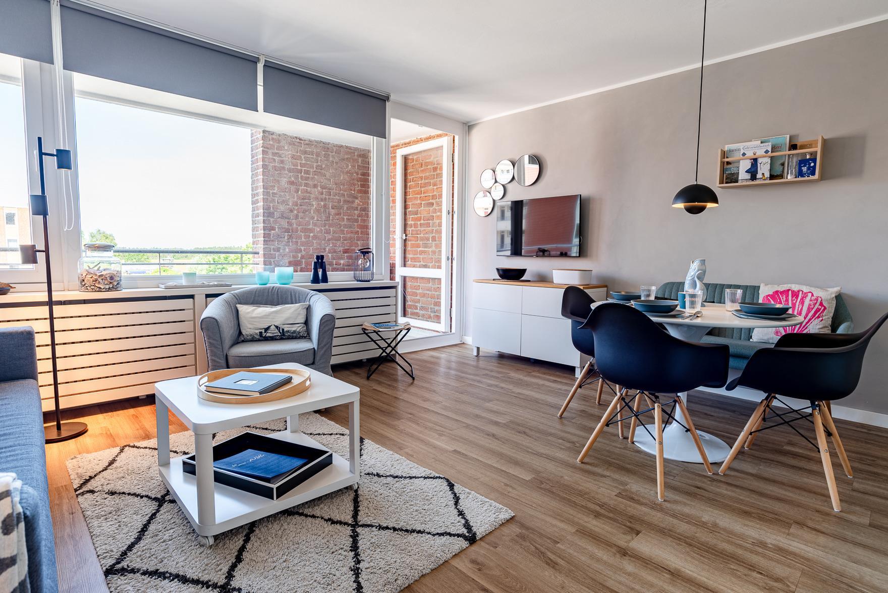 Im großzügigen Wohn- und Essbereich finden Sie eine voll ausgestattete, moderne Küchenzeile mit Induktionskochfeld, Backofen-Mikrowellen-Kombigerät, Nespresso-Kapselmaschine und weiteren technischen Geräten vor. Eine bequeme Sitzgelegenheit, ein 42" Smart-TV und eine Bose-Bluetooth-Box sorgen für Unterhaltung und Entspannung. Der zweite Balkon bietet einen Blick auf die Nordsee und lädt mit einem Lounge-Sessel zum Verweilen ein oder zum gemütlichen Frühstücken.