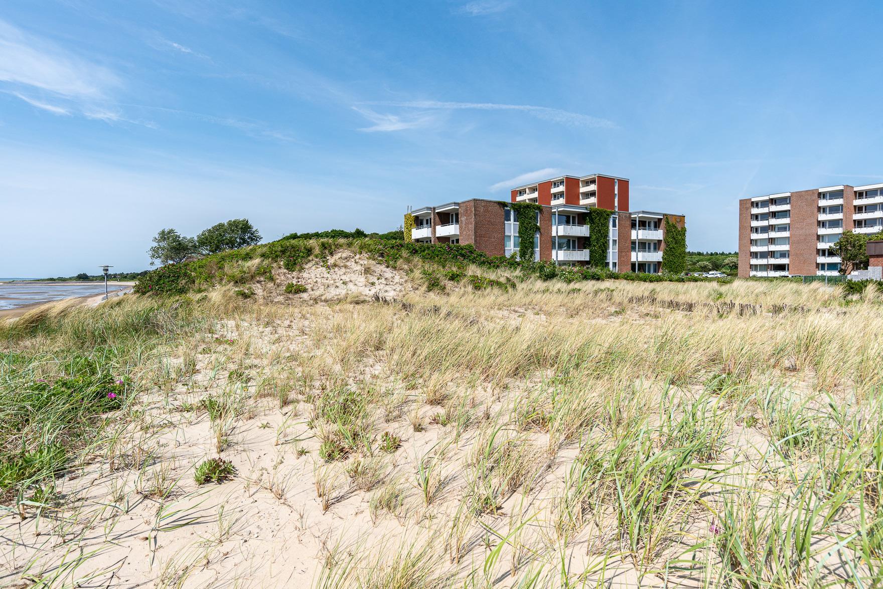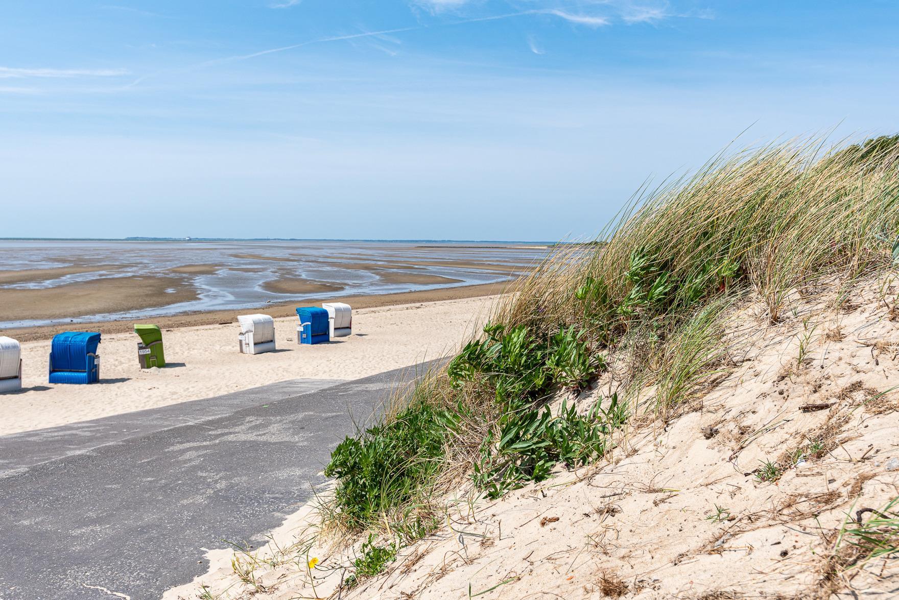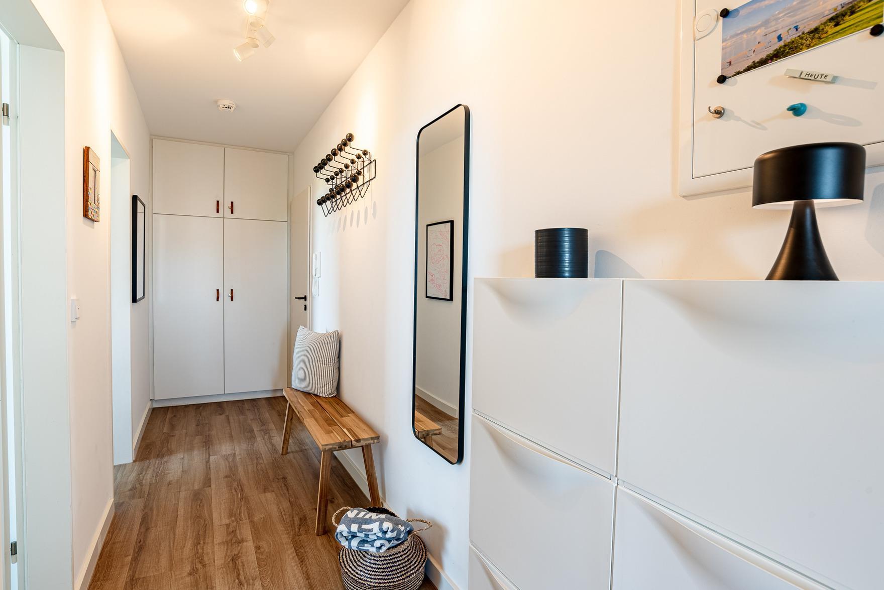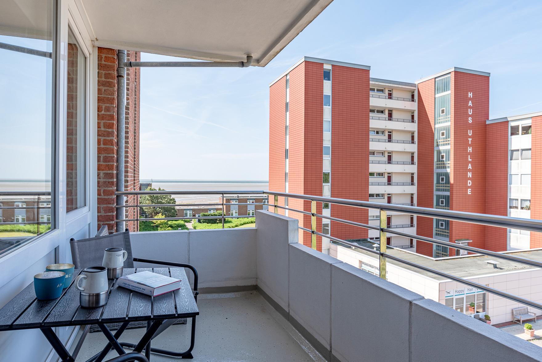 Im großzügigen Wohn- und Essbereich finden Sie eine voll ausgestattete, moderne Küchenzeile mit Induktionskochfeld, Backofen-Mikrowellen-Kombigerät, Nespresso-Kapselmaschine und weiteren technischen Geräten vor. Eine bequeme Sitzgelegenheit, ein 42" Smart-TV und eine Bose-Bluetooth-Box sorgen für Unterhaltung und Entspannung. Der zweite Balkon bietet einen Blick auf die Nordsee und lädt mit einem Lounge-Sessel zum Verweilen ein oder zum gemütlichen Frühstücken.