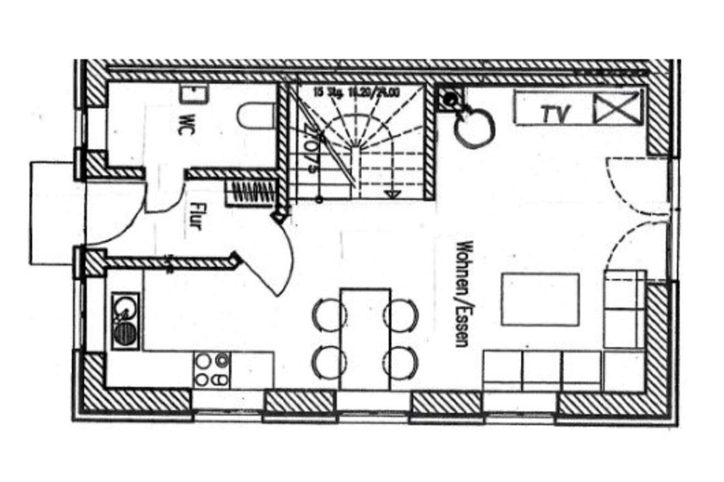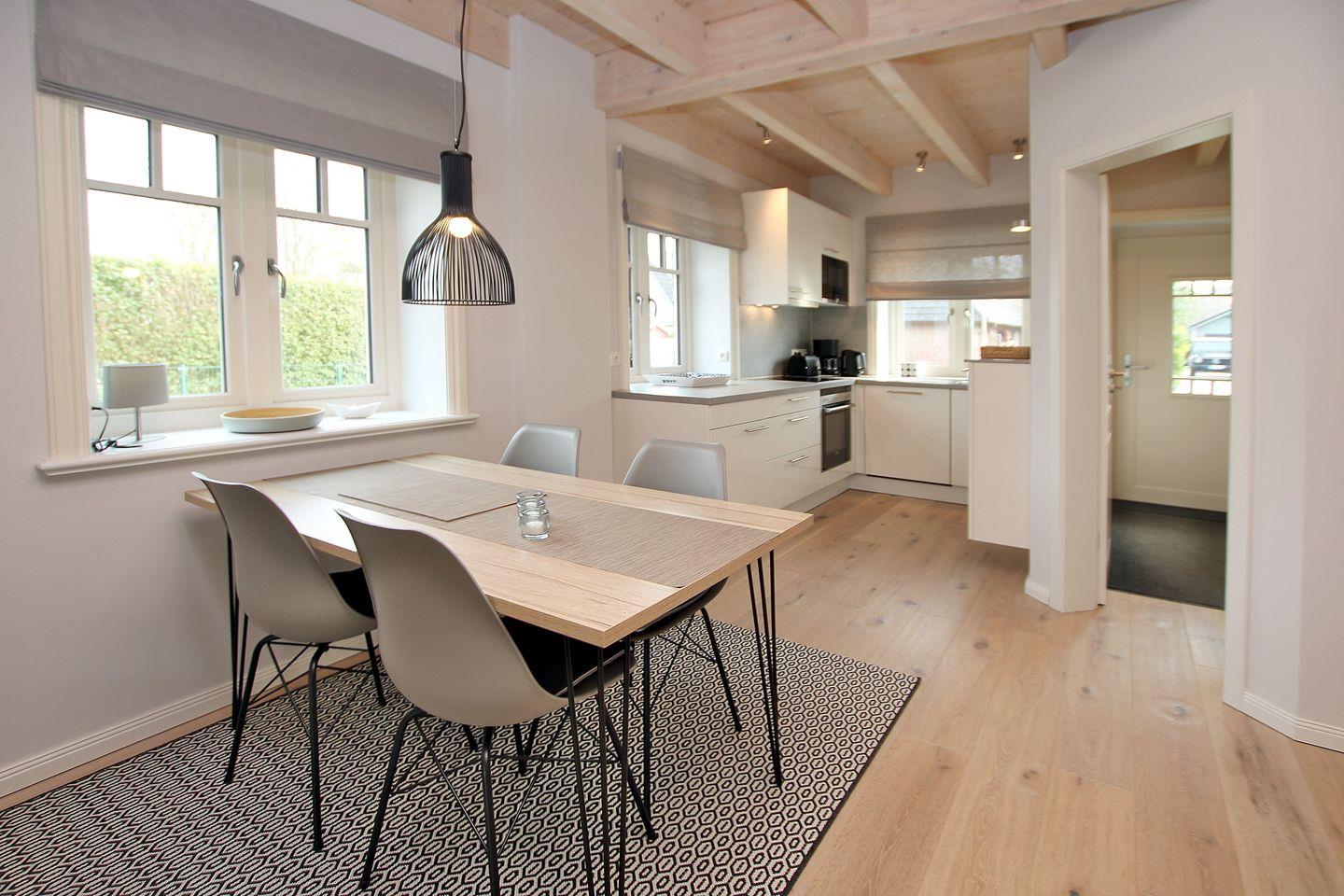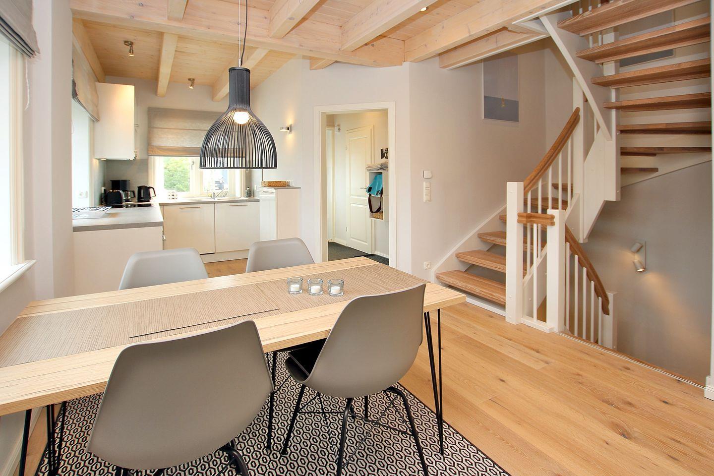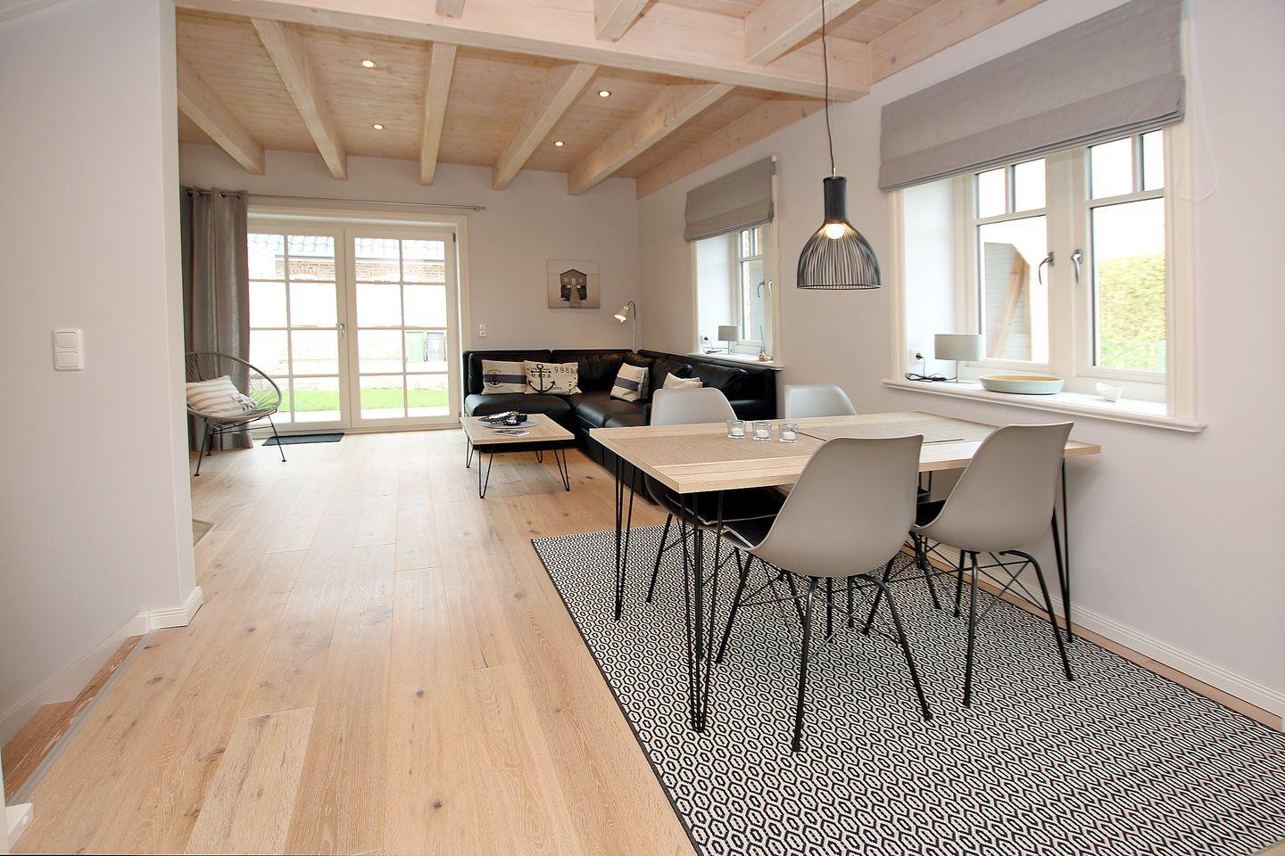 - Erdgeschoß ist offen unterteilt in Wohn-, Ess- und Küchenbereich. Esstisch mit 4 Stühlen, Ecksofa, Sessel