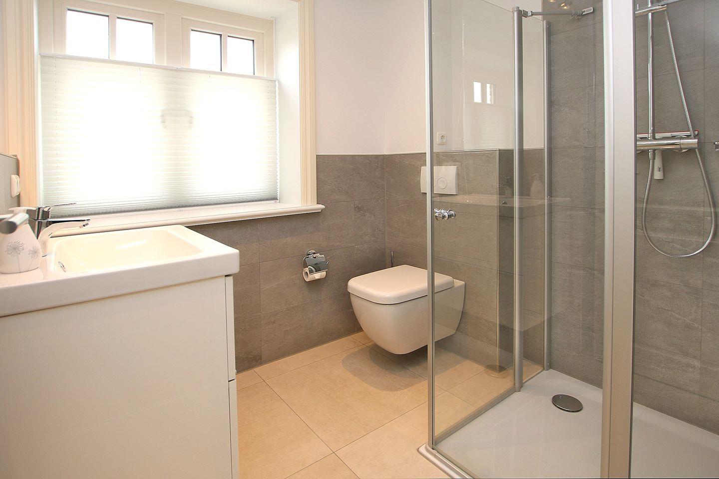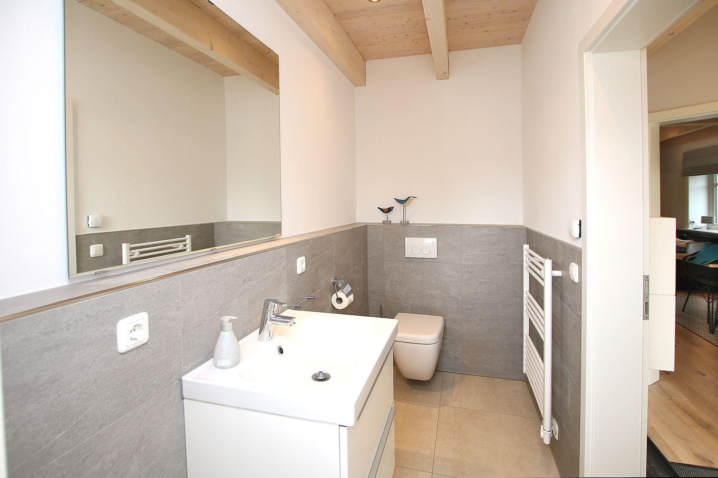 Das moderne BAD im OG mit Dusche und WC bietet ausreichend Platz. Im EG befindet sich ein großes Gäste/WC