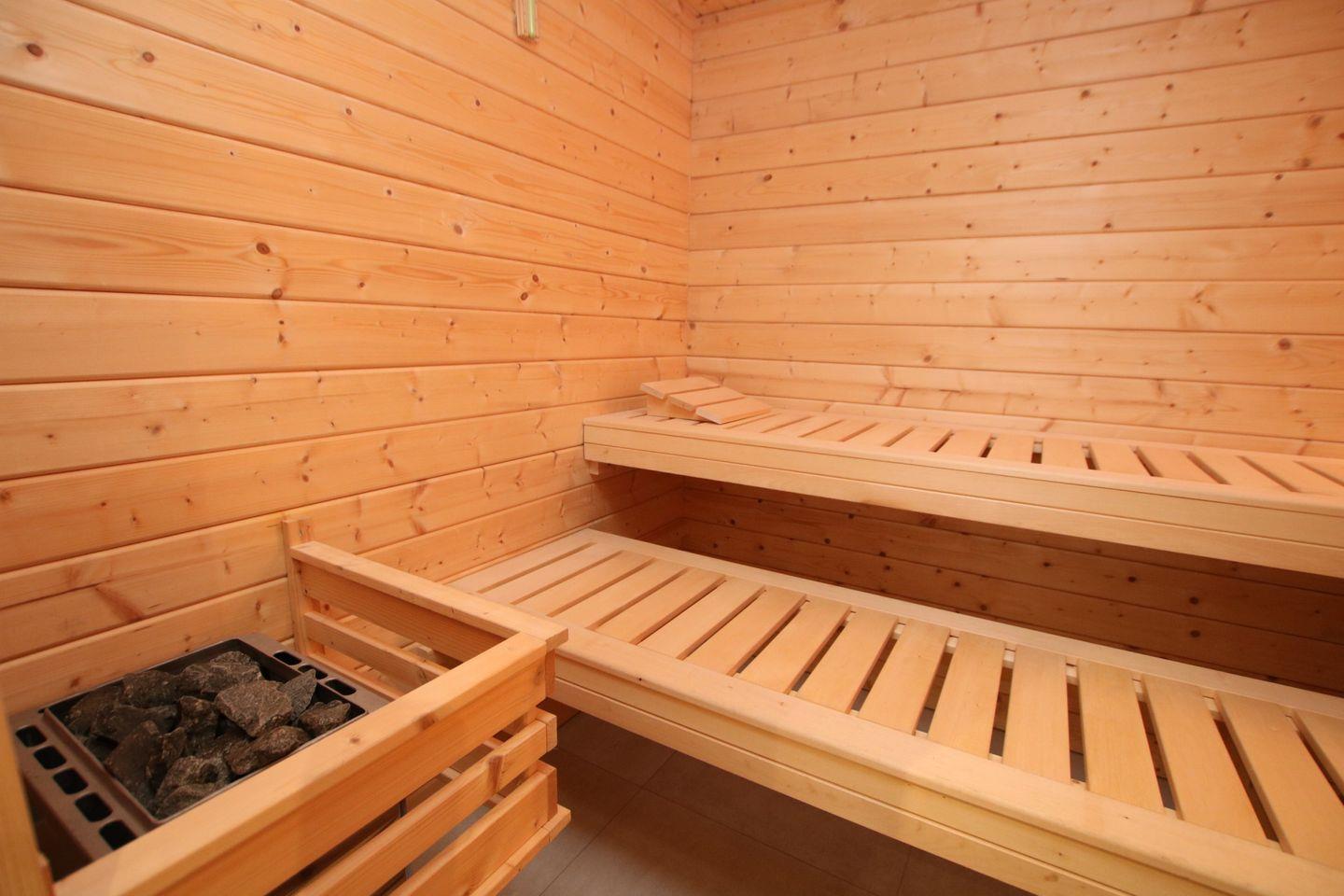Im Untergeschoss befindet sich die eigene Sauna mit Dusche und 2 Liegen und der HWR mit Waschmaschine und Trockner.