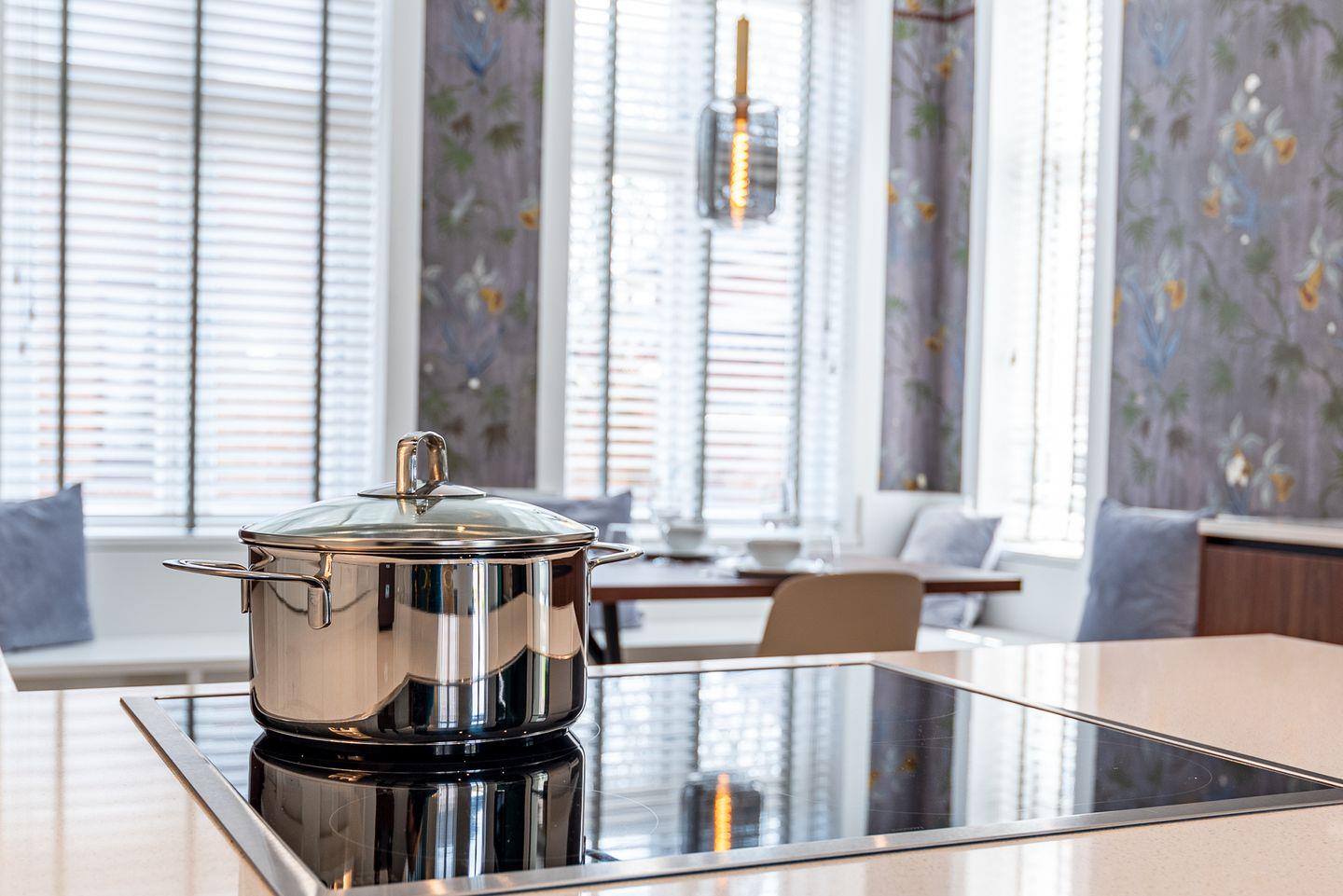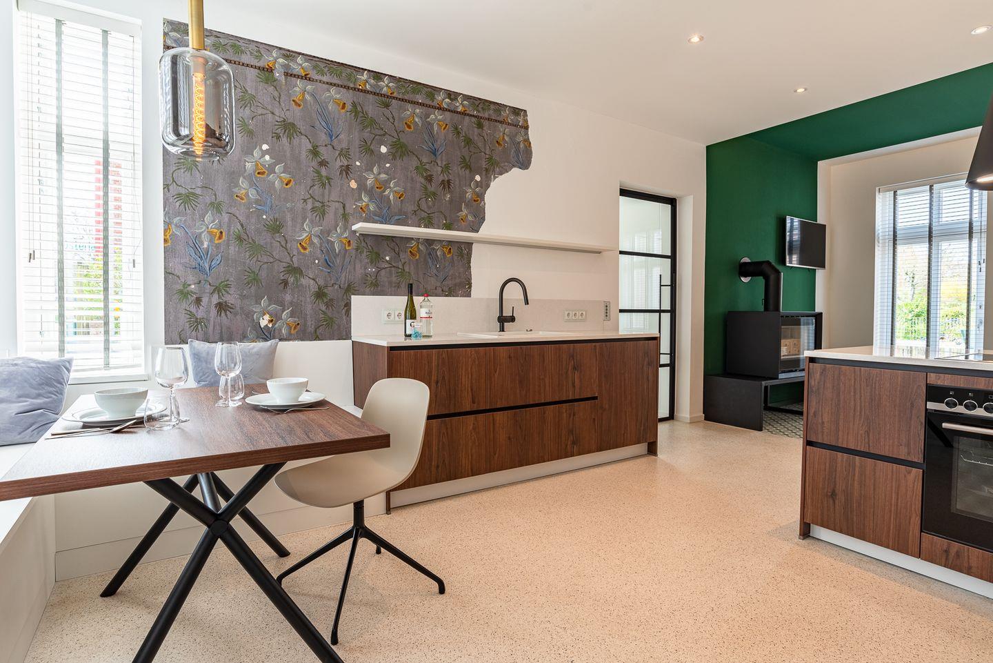 Der Hausteil liegt vollständig im Erdgeschoss und verfügt über einen großzügigen Wohn- und Essbereich mit offener Küche, ein Schlafzimmer mit Ankleide sowie einem Duschbad en Suite. Über den Wohnbereich gelangen Sie auf die eigene Terrasse und in den gemeinschaftlich genutzten Garten. Der Kaminofen im Wohnbereich sorgt auch an kühleren Tagen für eine angenehme Atmosphäre.