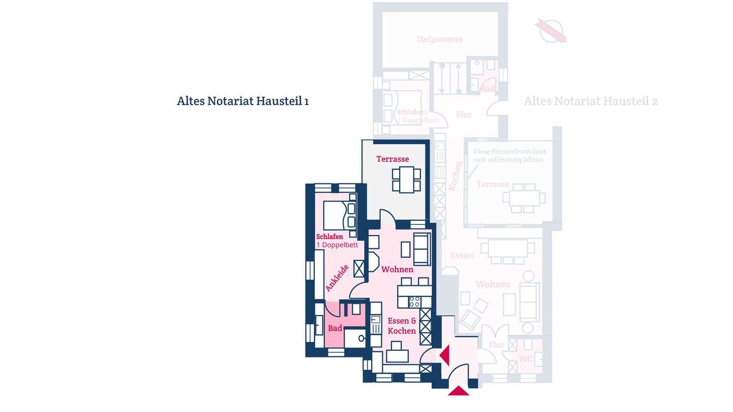 Der in den Jahren 2021-2023 kernsanierte und renovierte Hausteil 1 im Alten Notariat verfügt über 1 Schlafzimmer und 1 Bad und bietet somit komfortabel Platz für bis zu 2 Personen zuzüglich einer Kleinkinderaufbettung.