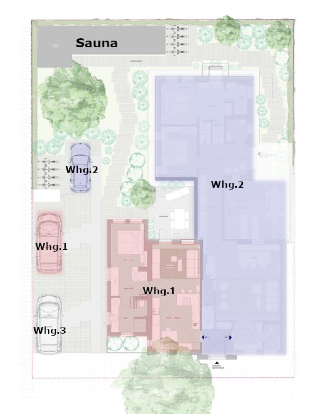 Die Sauna befindet sich im Gartenhaus und steht den Gästen beider Hausteile gemeinschaftlich zur Verfügung. Ein eigener PKW-Stellplatz mit E-Auto-Ladestation und ein eigener Fahrradständer direkt am Haus runden das Angebot ab.