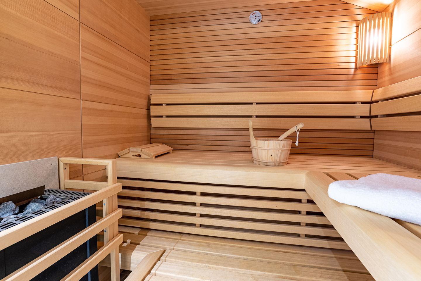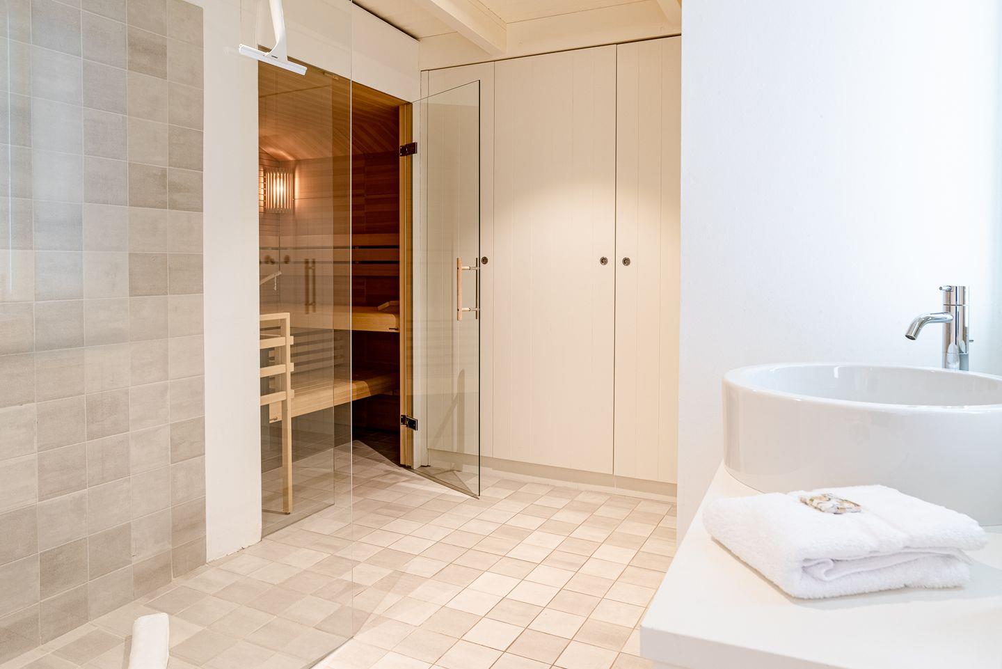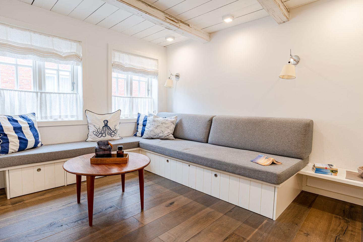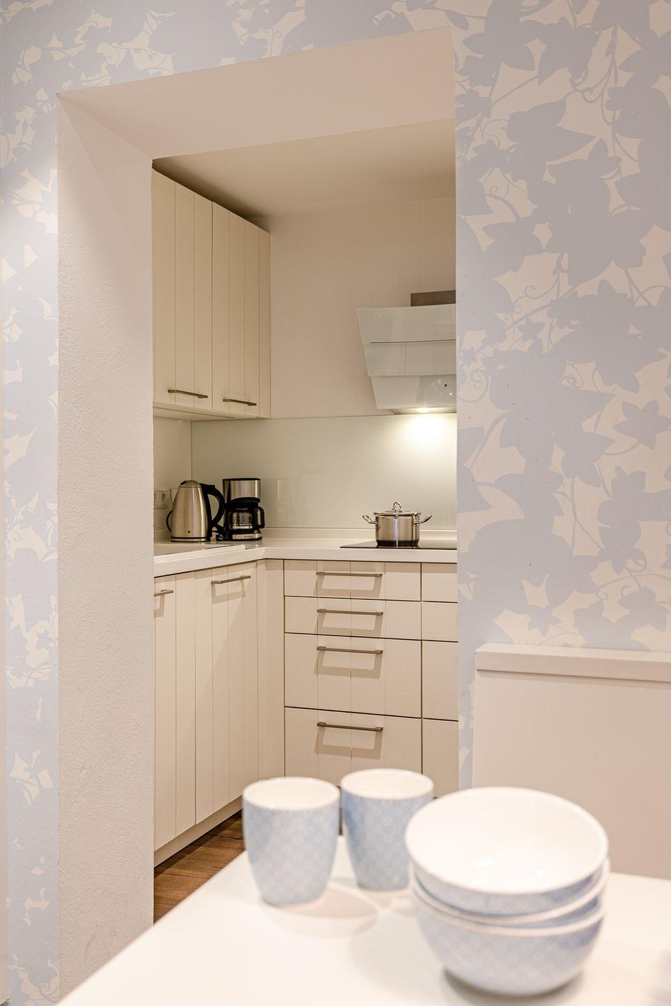 Durch die mit Efeu behangene Fassade gelangen Sie in den kleinen Flur. Dort finden Jacken und Schuhe genug Platz. In dem kombinierten Wohn-/Esszimmer mit halboffener Küche und Schlafsofa befindet sich der Esstisch mit Platz für bis zu vier Personen. Ebenfalls im Erdgeschoss befindet sich das Bad mit einer großzügigen, bodengleichen Dusche, der hauseigenen Sauna und einer Waschmaschine. Im Obergeschoss befindet sich ein Schlafzimmer mit Doppelbett.