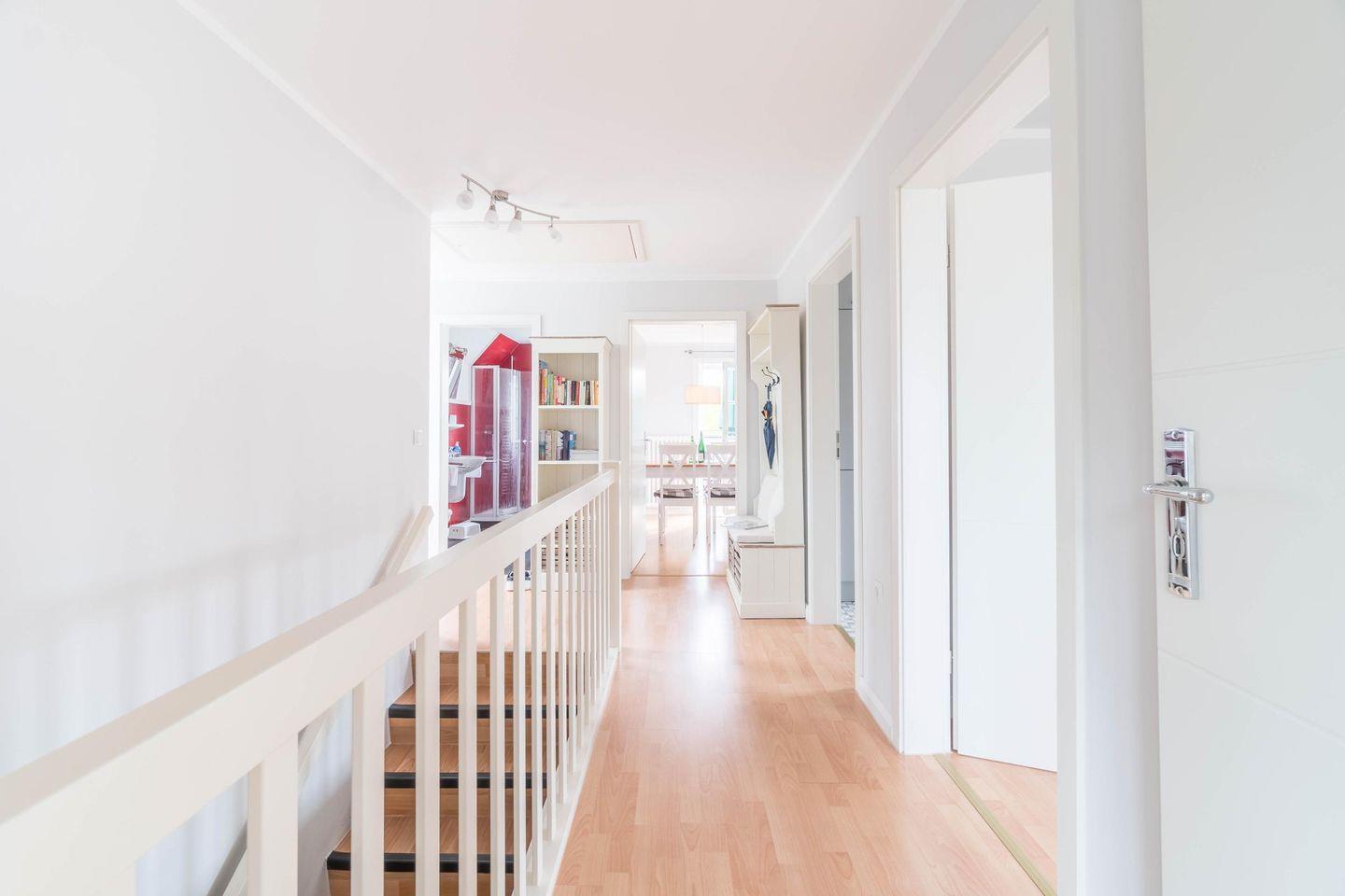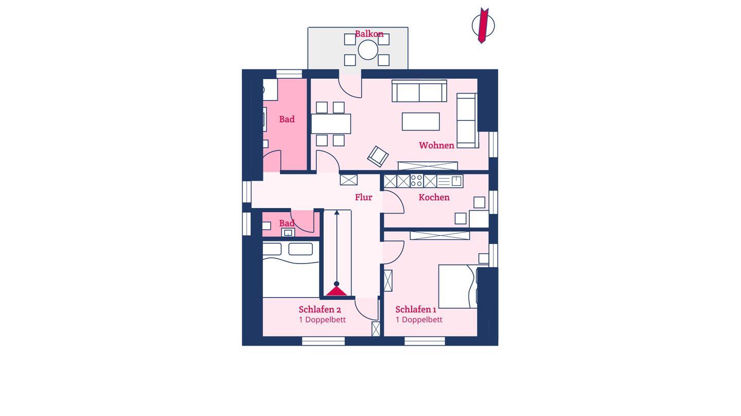 Die großzügige, ca. 65 m² große Wohnung "Hortensie" liegt im Obergeschoss und bietet Ihnen ein Wohn-Esszimmer mit separater Küche und direktem Zugang zum Balkon, zwei Doppelbett-Schlafzimmer, ein Duschbad und ein Gäste-WC. Der Garten darf gemeinschaftlich mit den anderen Wohnungen genutzt werden.