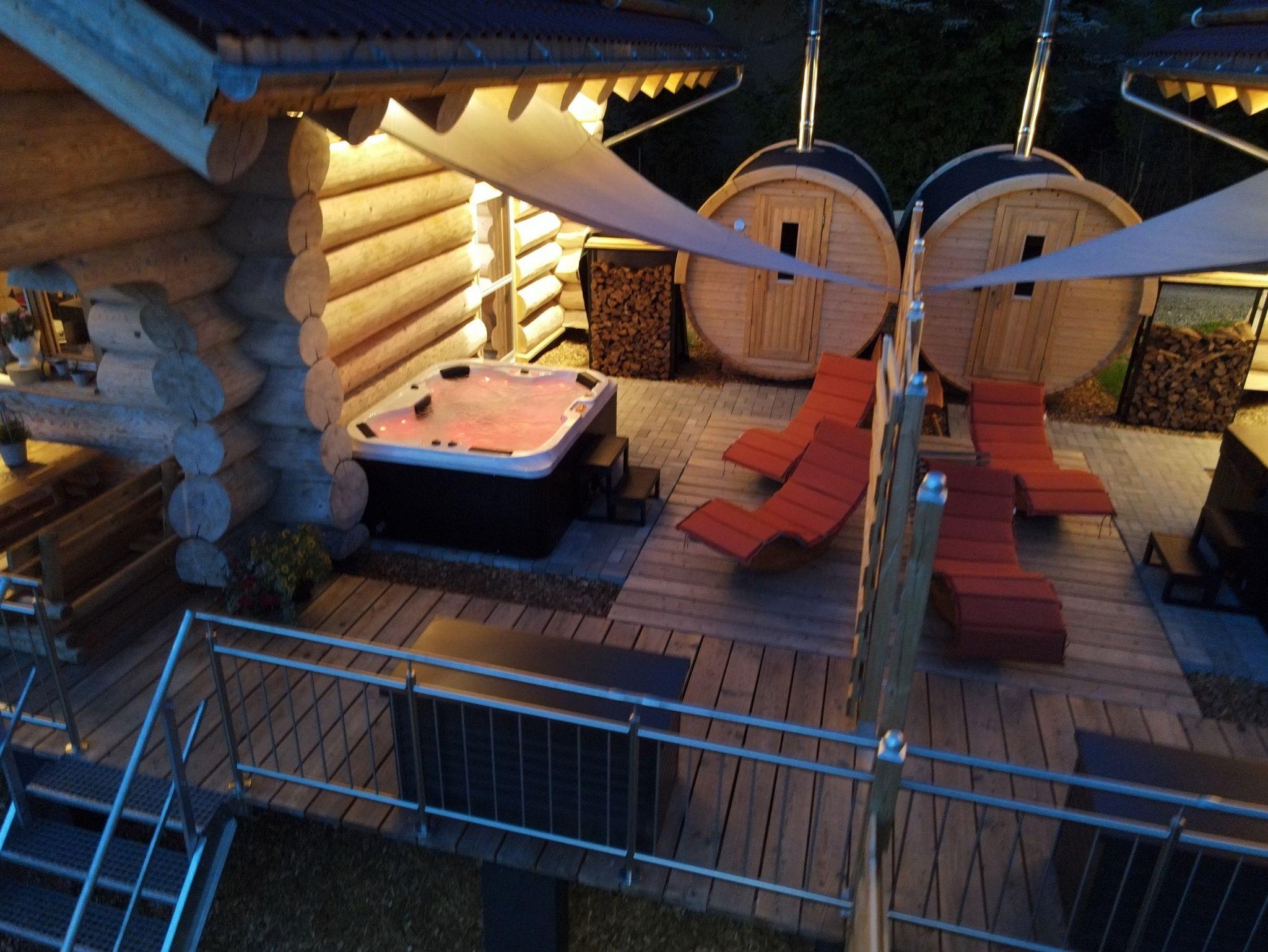 Wir wollen keine Sterne verkaufen, sondern Sie in ein Lebensgefühl der besonderen Art entführen. Sie werden ein Blockhaus beziehen, welches nachhaltig und nach traditioneller kanadischer Bauweise mit heimischen Hölzern aus Deutschland erstellt wurde. Innenausbau, diverse Möbel, Türen als auch die Unikate von Waschbecken und vieles mehr wurden nicht nur von uns selbst entworfen, sondern auch selbst angefertigt. Das Chalet ist ca. 110 qm groß und bietet Platz für bis zu 6 Personen. Auf zwei Etagen befinden sich 2 Schlafzimmer, eines mit einem Doppelbett, das zweite mit 2 Einzelbetten, eine voll ausgstattete Küche (mit Induktionsherd, Spülmaschine und natürlich auch ein Mikrowellenherd, Spülmaschine, Kaffeevollautomat), ein Wohnzimmer, ein Badezimmer mit Dusche und WC. Im Wohn-Essbereich befindet sich ein Esstisch, eine Couch (Schlafcouch) sowie ein Fernseher. Wlan und ein Parkplatz stehen kostenfrei zur Verfügung. Ein Pallets-Ofen sorgt für wohlige Wärme. Besondere Highlights sind der Whirlpool im Freien und die Fasssauna, sowie eine Wellnessdusche und ein Sitzbad. Diese Annehmlichkeiten stehen exklusiv zur Verfügung. Zudem erwartet Sie ein reichhaltig gefüllter Begrüßungskorb mit selbst gemachten Köstlichkeiten.