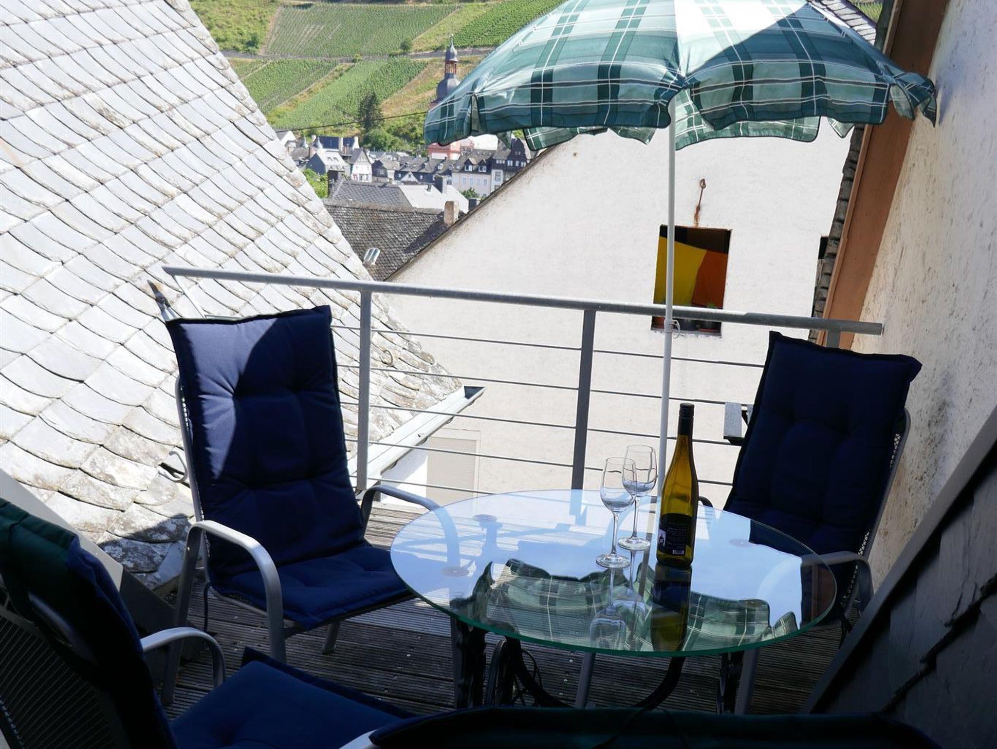 Vom Obergeschoss aus kommt man auf die kleine Dachterrasse, mit Blick auf die Weinberge der Zeller Schwarzen Katz.