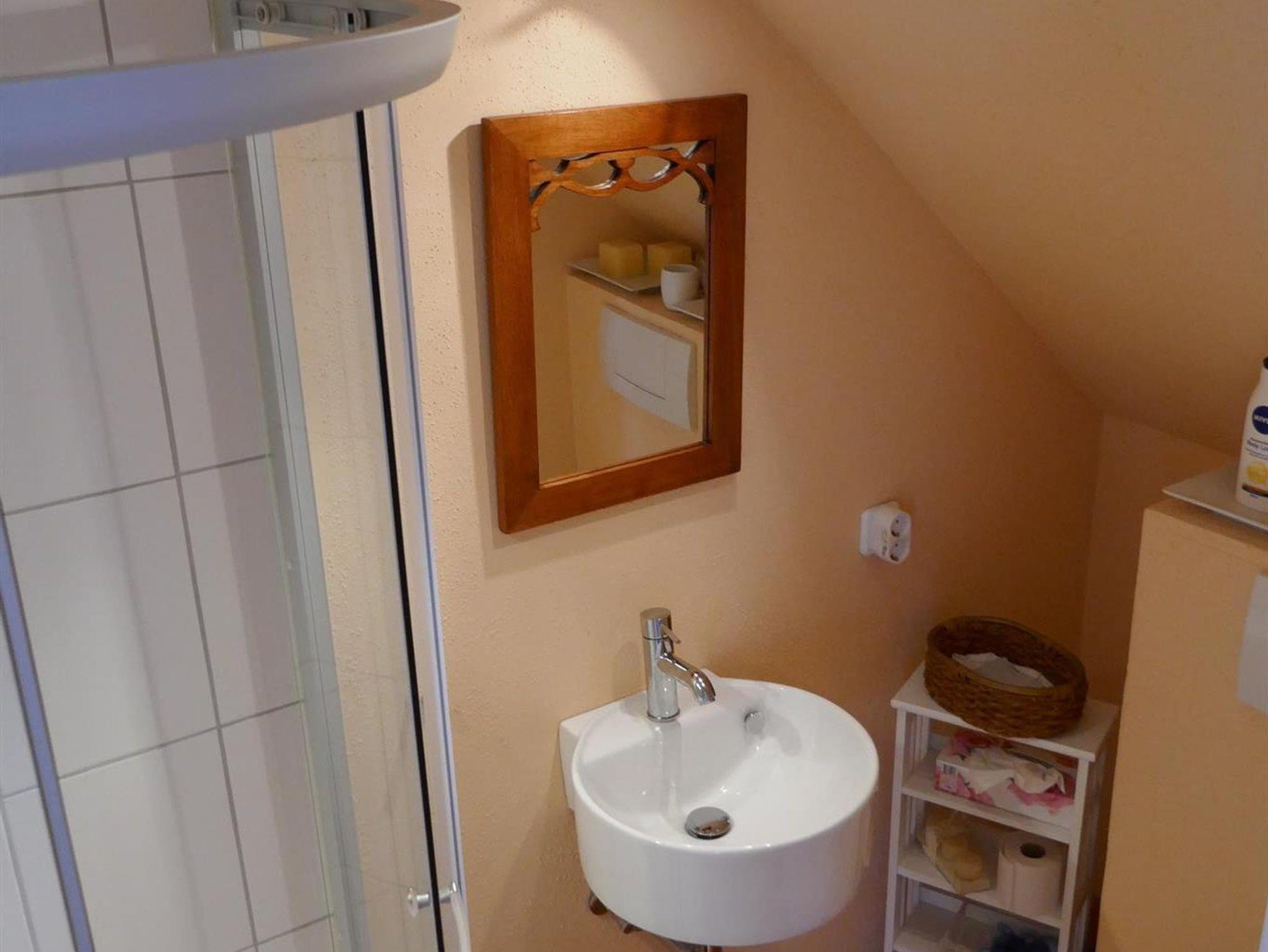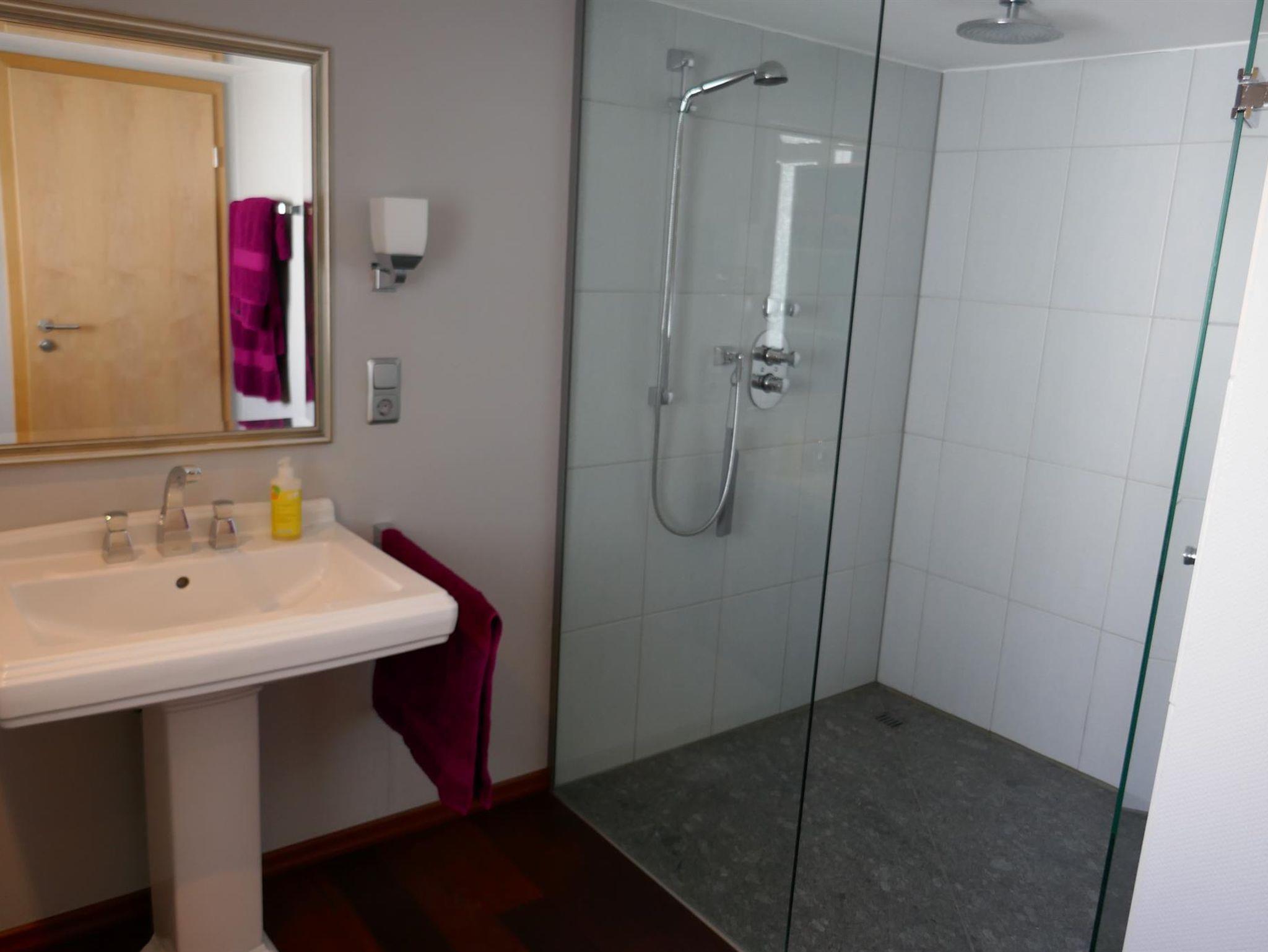 Im Obergeschoss befindet sich ein weiteres Schlafzimmer mit einem eigenen Badezimmer, ebenfalls mit Dusche. Ebenso gibt es hier eine zweite Küchenzeile, für einen frühen Kaffee oder ein spätes Glas Wein. Das ganze Obergeschoss ist wie eine eigene kleine Wohnung, nur dass es keinen separaten Hauseingang dafür gibt.