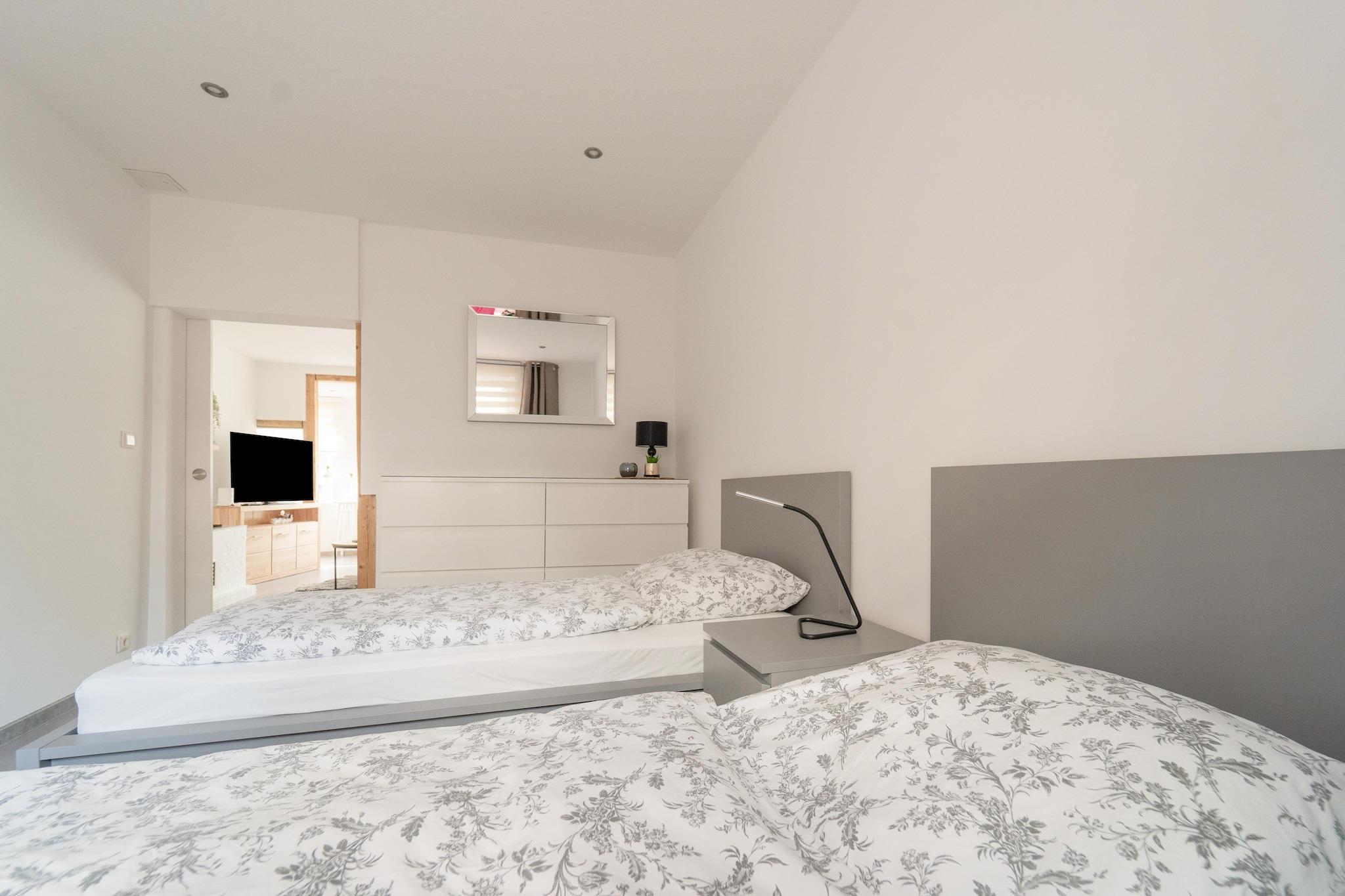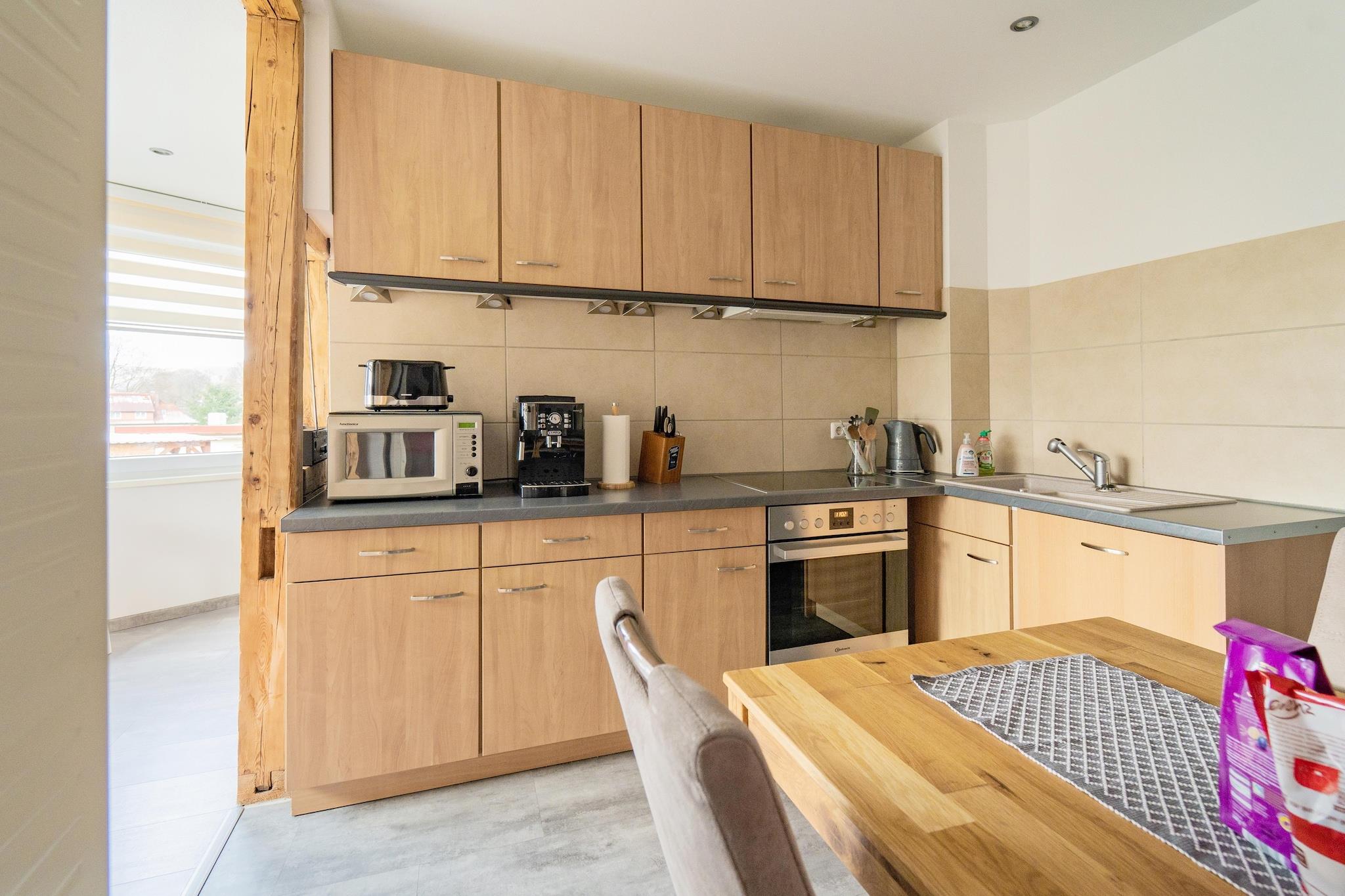 Detta inbjudande semesterhus i Zella-Mehlis erbjuder en fridfull oas i utkanten av Thüringer Wald, borta från folkmassorna men ändå nära natur och kultur. Nyligen renoverad och omtänksamt inredd, lägenheten välkomnar par, familjer och vänner med sitt mysiga vardagsrum, ljusa interiörer och hemtrevliga inslag. Efter en dag utomhus kan du samlas i vardagsrummet eller laga gemensamma måltider i det fullt utrustade köket innan du kopplar av i det rymliga badrummet med ett långt dopp i badkaret. Zella-Mehlis ligger vid porten till Rennsteig, Tysklands mest berömda vandringsled på hög höjd, vilket gör den till en underbar utgångspunkt för natursköna promenader, mountainbikecykling och vintersporter. Staden hyllas också som ett nav för nordisk skidåkning. Utöver utomhusaktiviteter kan du besöka Explorata Science Center, utforska lokala museer eller njuta av en film på bio. På sommaren erbjuder närliggande utomhuspooler, lekplatser och sportanläggningar roligt för alla åldrar, medan mysiga tavernor och traditionella Thüringer restauranger inbjuder dig att prova rejäla regionala smaker. Att resa med husdjur är särskilt givande här. Från skogsstigar perfekta för långa promenader till öppna ängar där hundar kan springa fritt, din fyrbenta följeslagare kommer att känna sig som hemma. Många vandringsleder runt Zella-Mehlis är hundvänliga, och närliggande kaféer välkomnar ofta husdjur på sina terrasser, vilket gör det enkelt att kombinera avkoppling med kvalitetstid utomhus.