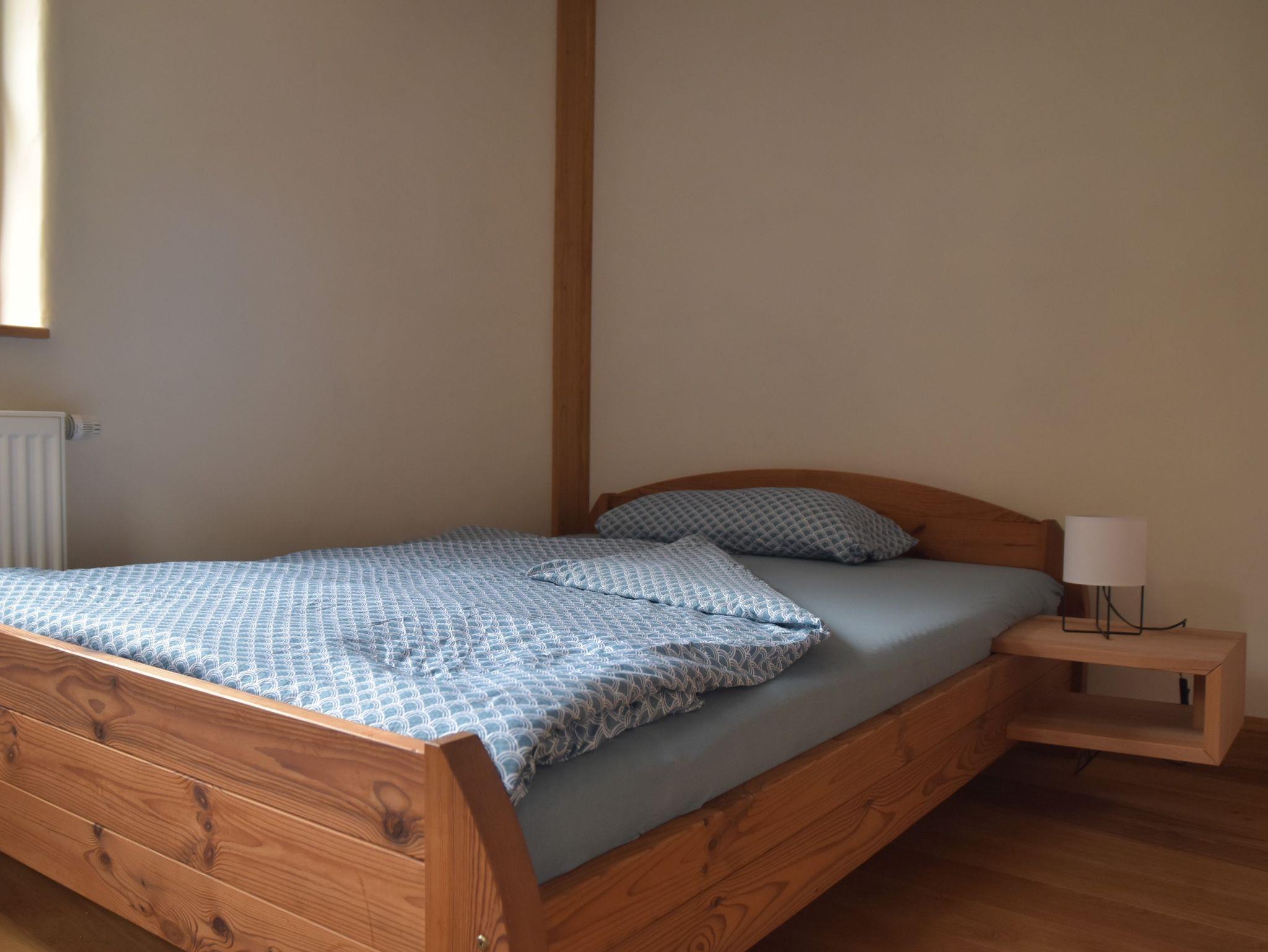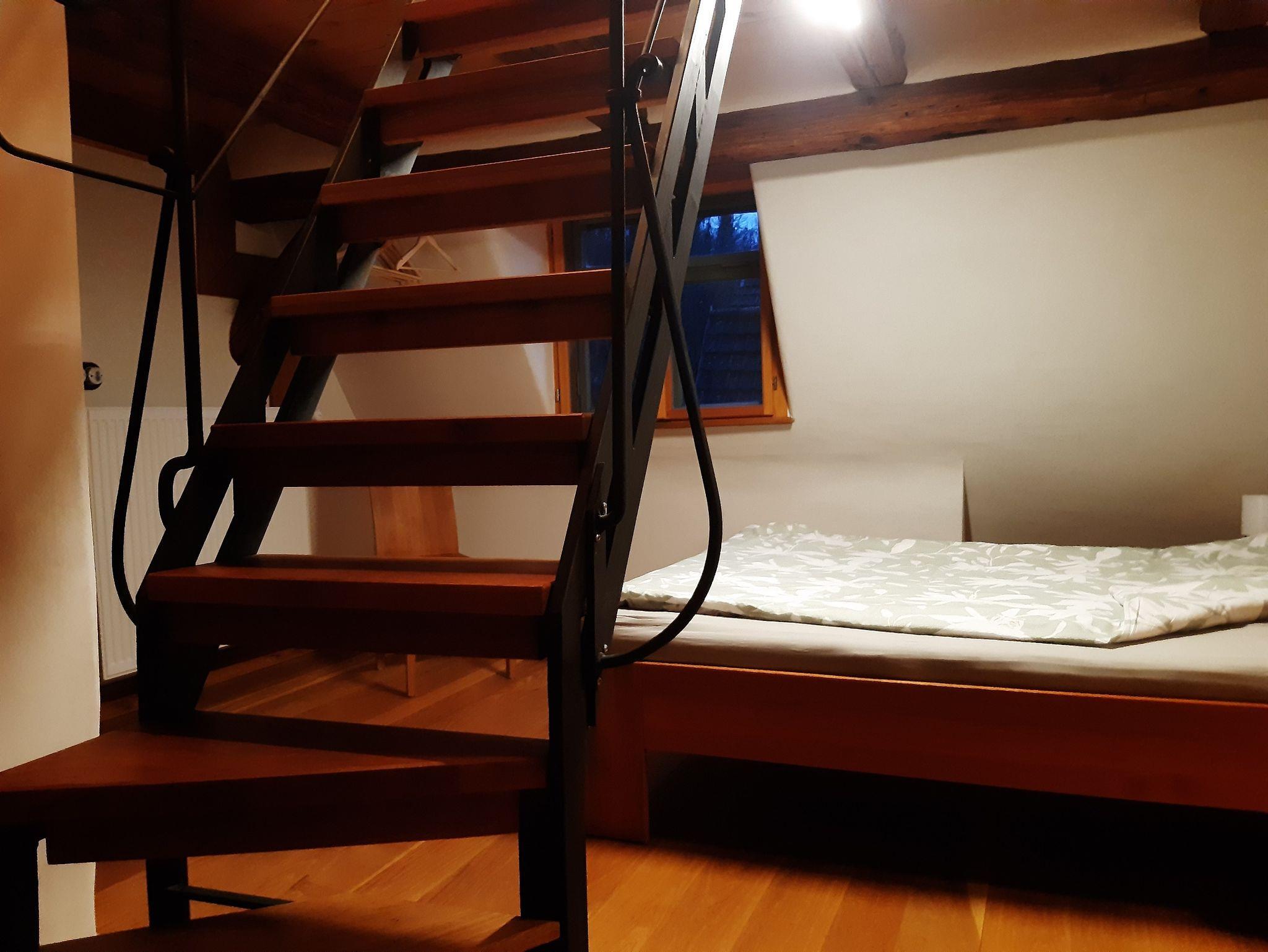 Die Treppe zum Schlafzimmer in den Spitzboden unter dem Dach befindet sich in einem der darunter liegenden Schlafzimmer. Die zwei Zimmer sind also nicht komplett voneinander getrennt.