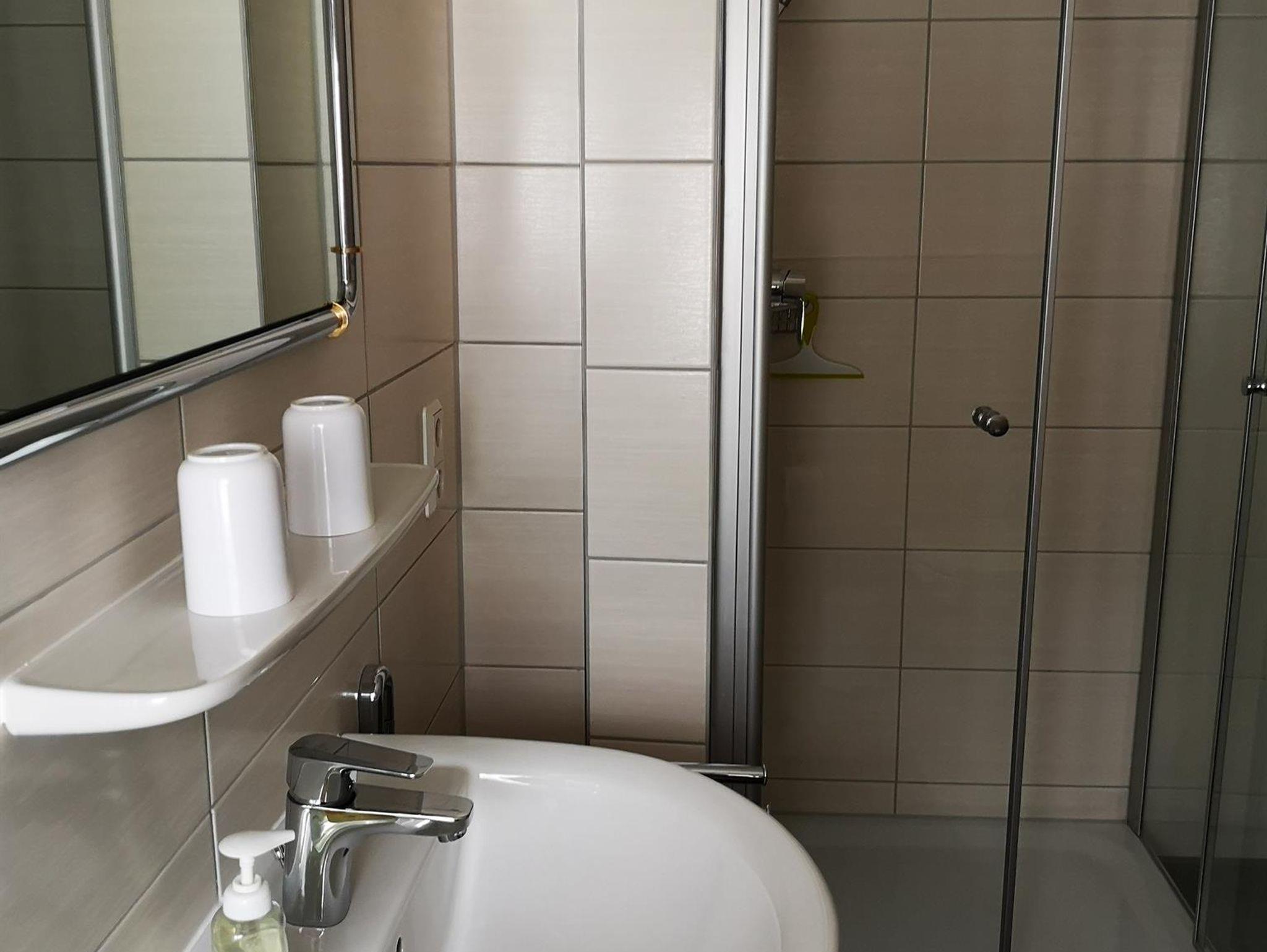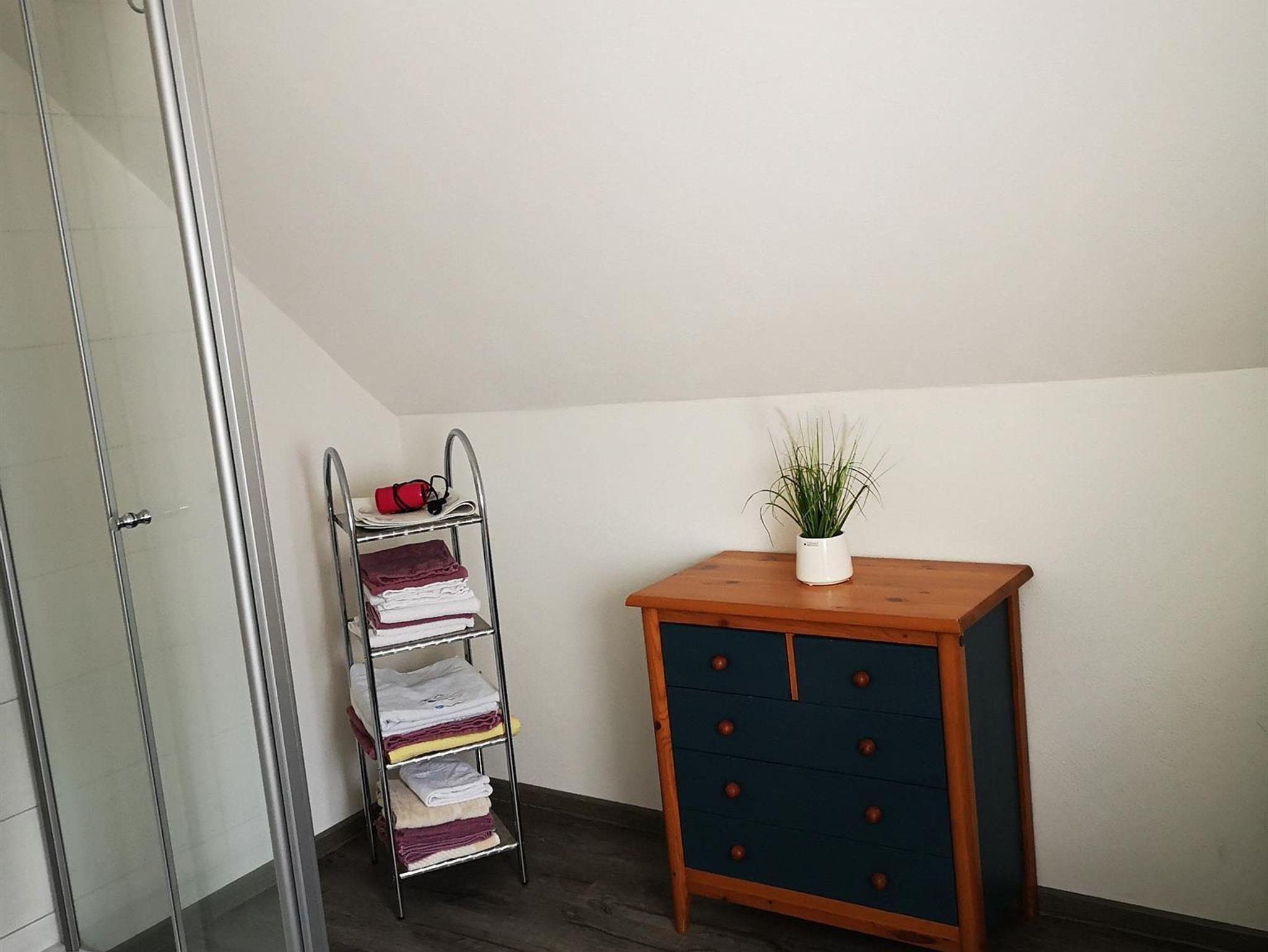 Schlafzimmer und das direkt daran anschließende Bad befinden sich im OG. Im EG gibt es ein Gäste-WC.
