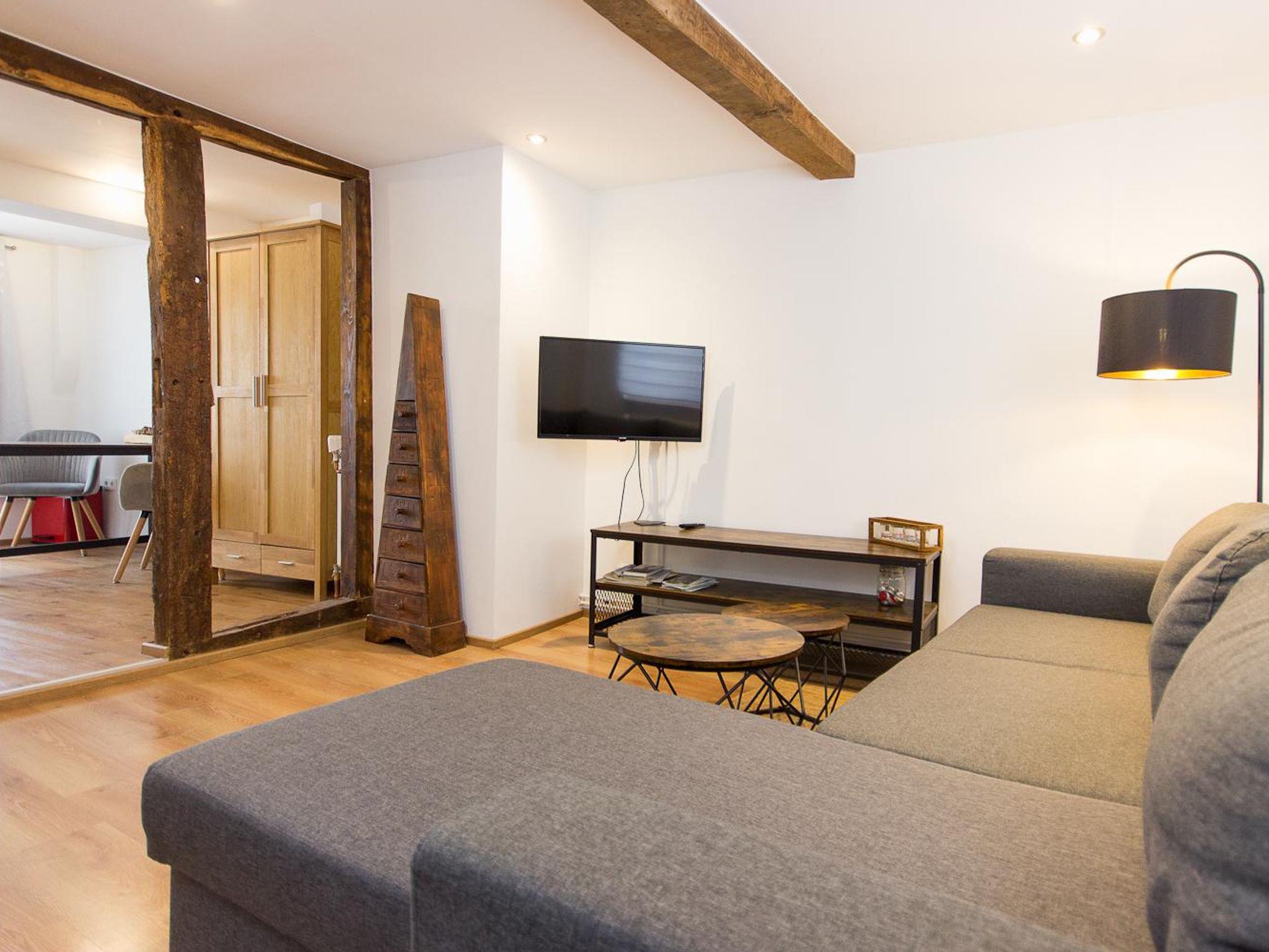 Unser 36 m² großes Appartement bietet Ihnen eine gemütliche Wohlfühlatmosphäre und eine komplette Ausstattung für Ihren Aufenthalt. Das Highlight ist die private Terrasse mit Tisch, zwei Stühlen und Sonnenschirm – genießen Sie den Blick auf die umliegenden Weinberge und die Rosenberg-Burgruine.