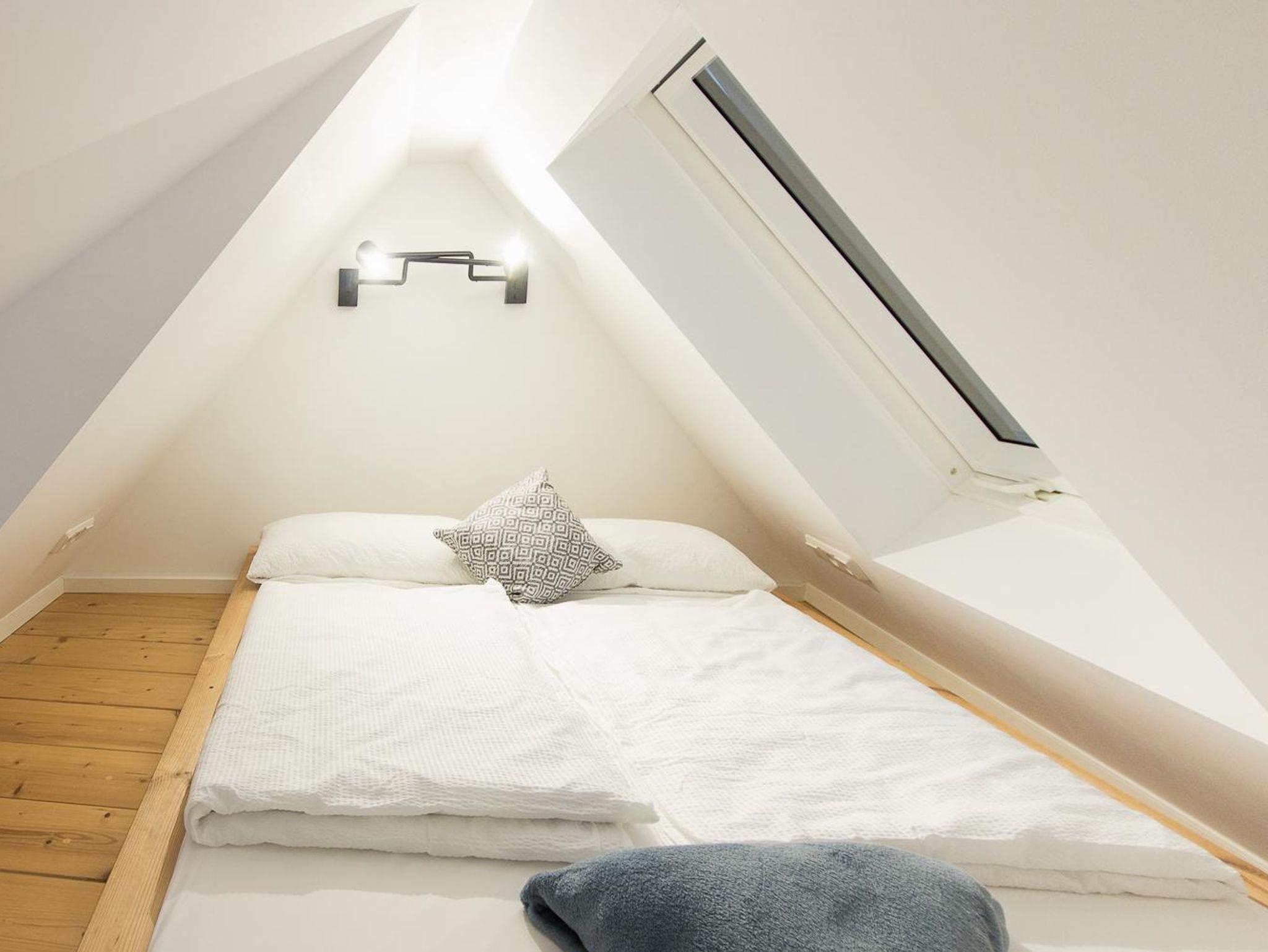 Das 140 cm Doppelbett befindet sich auf einer Empore, es ist wie ein Futon-bett, also niedrig. Aus dem Bett siehst Du die Mosel und nachts den Himmel.