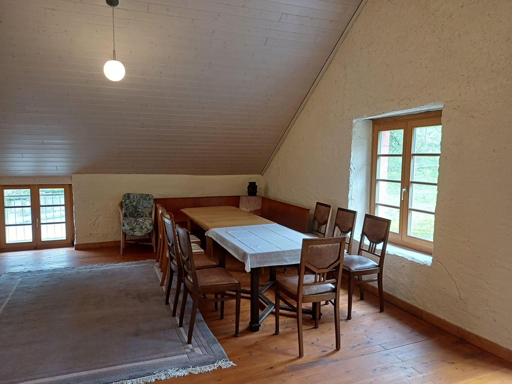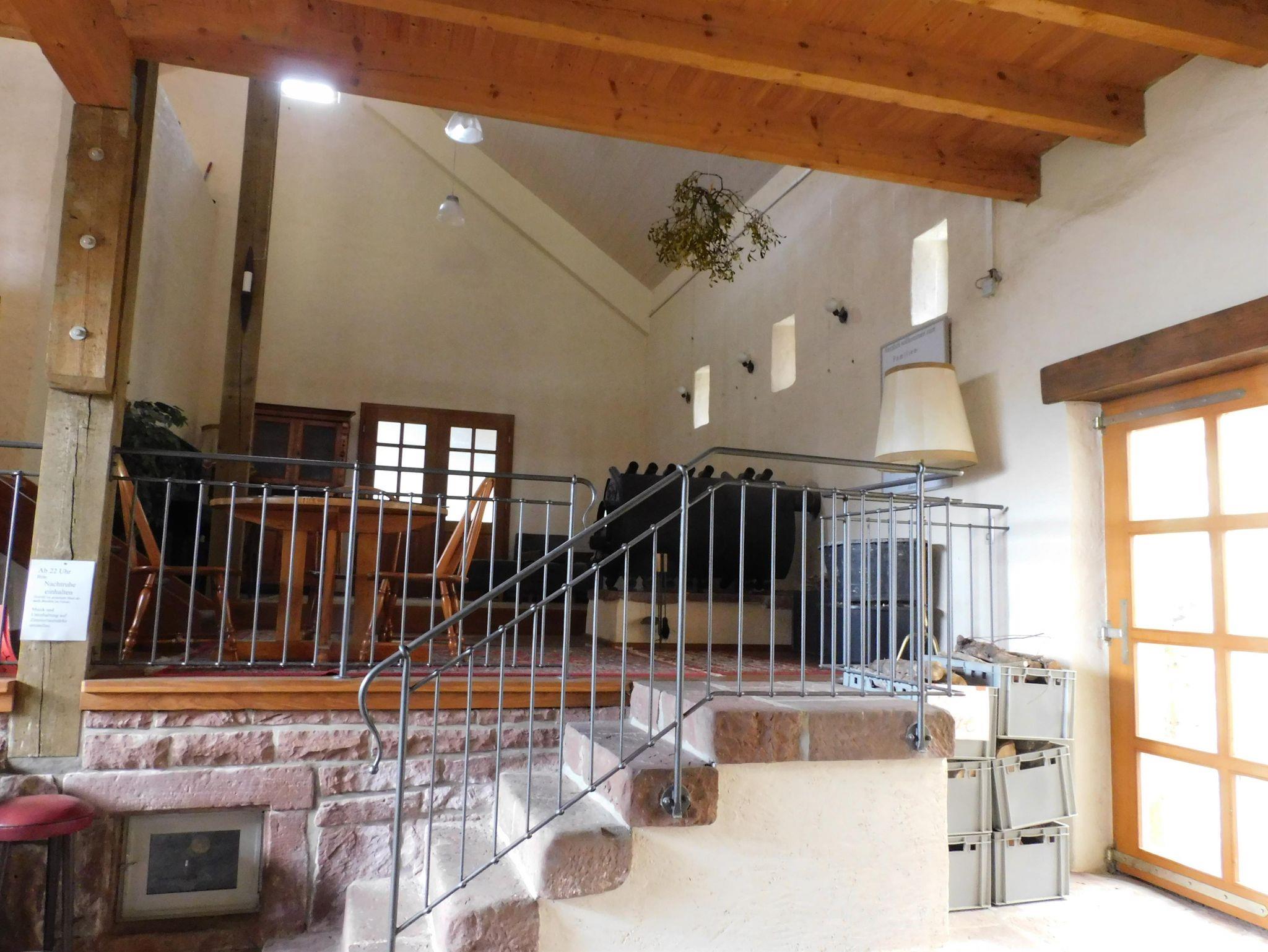 Die Scheune kann als Aufenthaltsraum genutzt werden. Tischkicker und Tischtennisplatte laden zum Spielen, eine Sofaecke zum gemütlichen Beisammensein ein. Eine Empore bietet zusätzlich Platz und einen großen Tisch zum Zusammensitzen. Der Garten mit Grillstelle kann entweder über die Empore oder über eine Außentreppe erreicht werden.