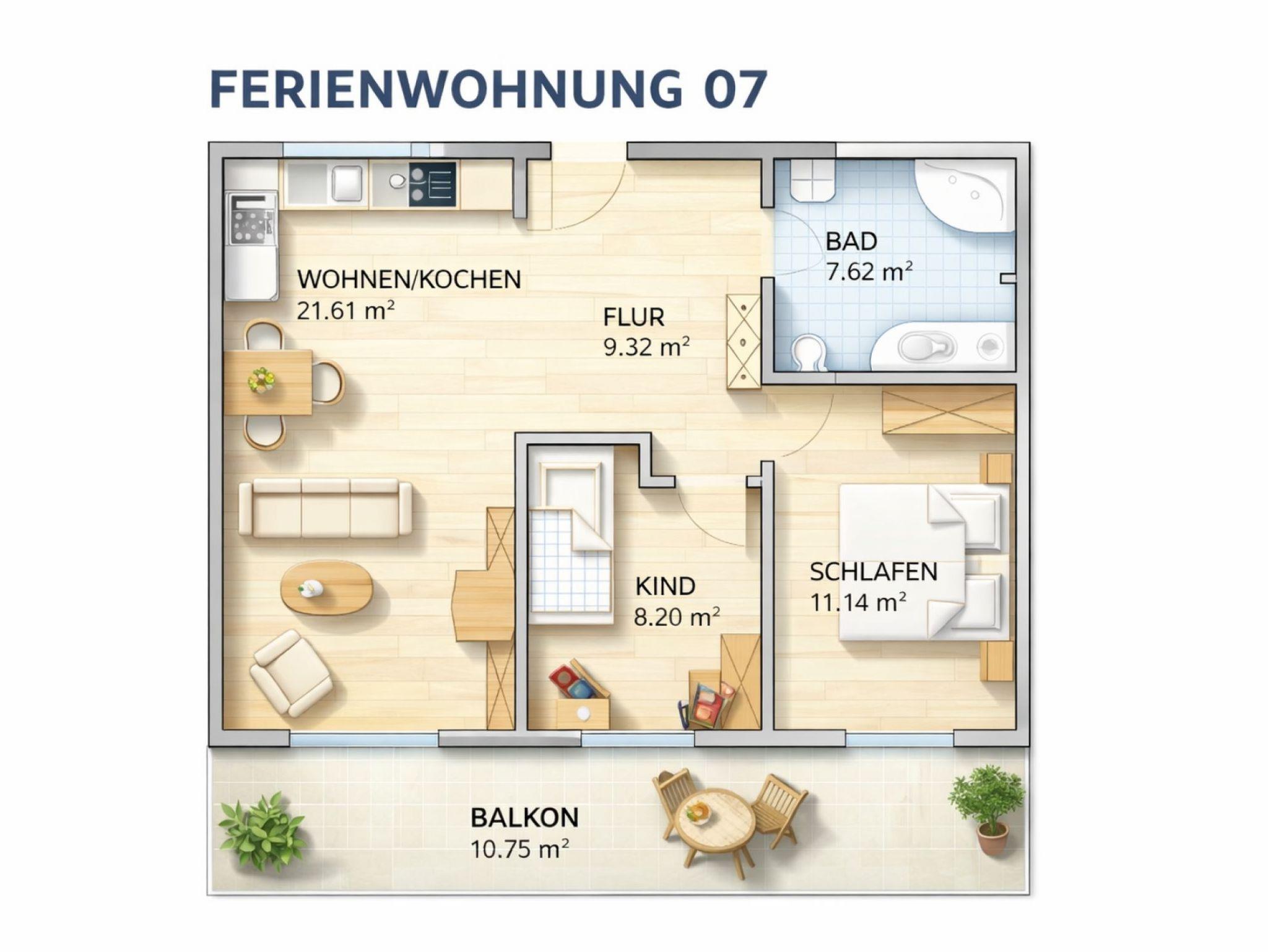 Modern eingerichtete Ferienwohnungen mit einer Größe von 51 m² - 80 m² laden mit ihrem gemütlichen Ambiente und den eigenen großen Balkons/ Eck-Balkonen zum Wohl fühlen ein. Hier kann man den Alltagsstress abschalten und sich in angenehmer Atmosphäre wohl fühlen.
