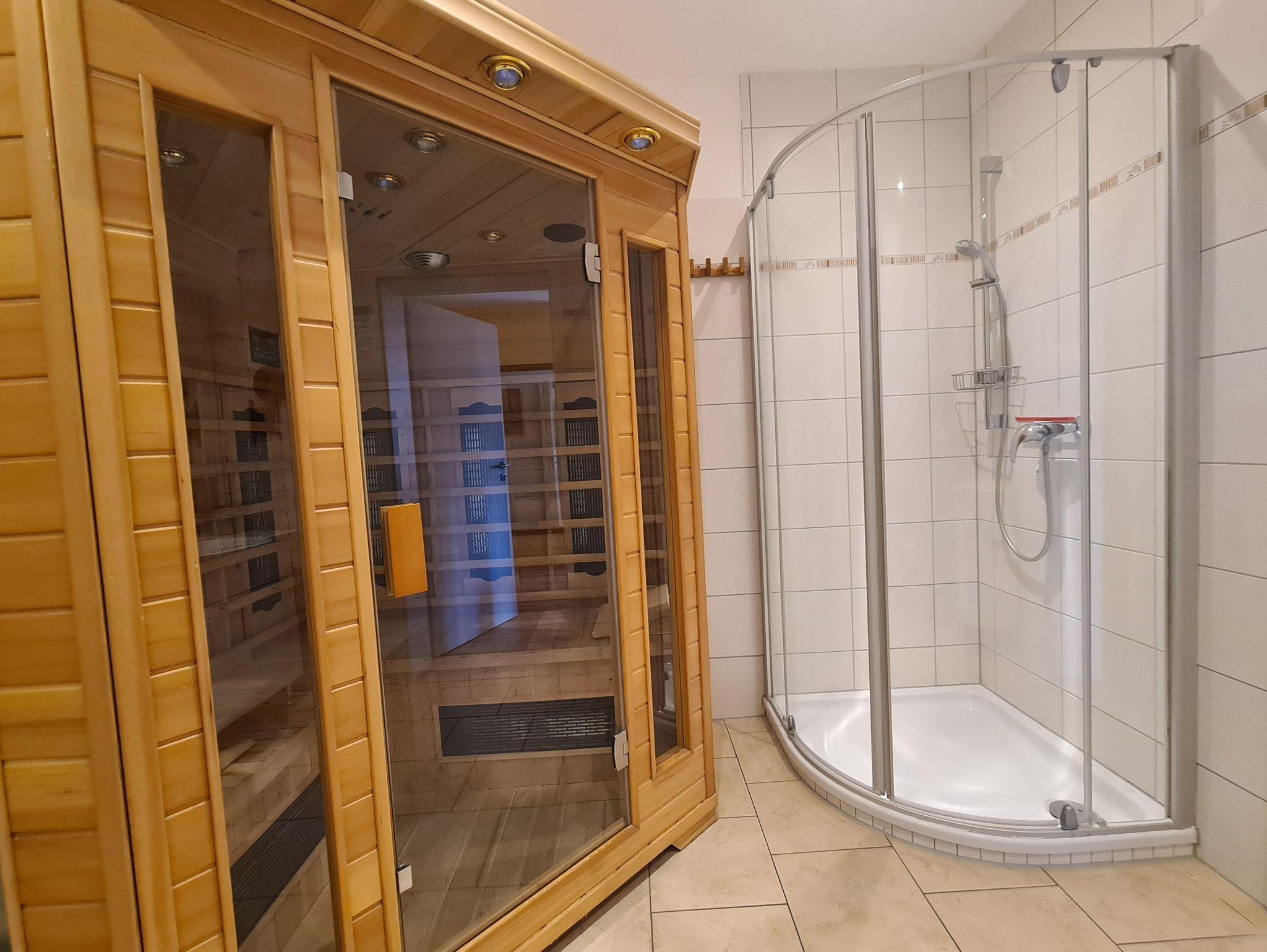 Fußbodenheizung, Infrarotsauna, TV + DVB-T, DVD-Player, Radio mit CD/MP3-Player, Balkonmöbel, Ceranherd, Backofen, Kühlschrank, Tiefkühlfach, Gläser, Geschirr, Besteck