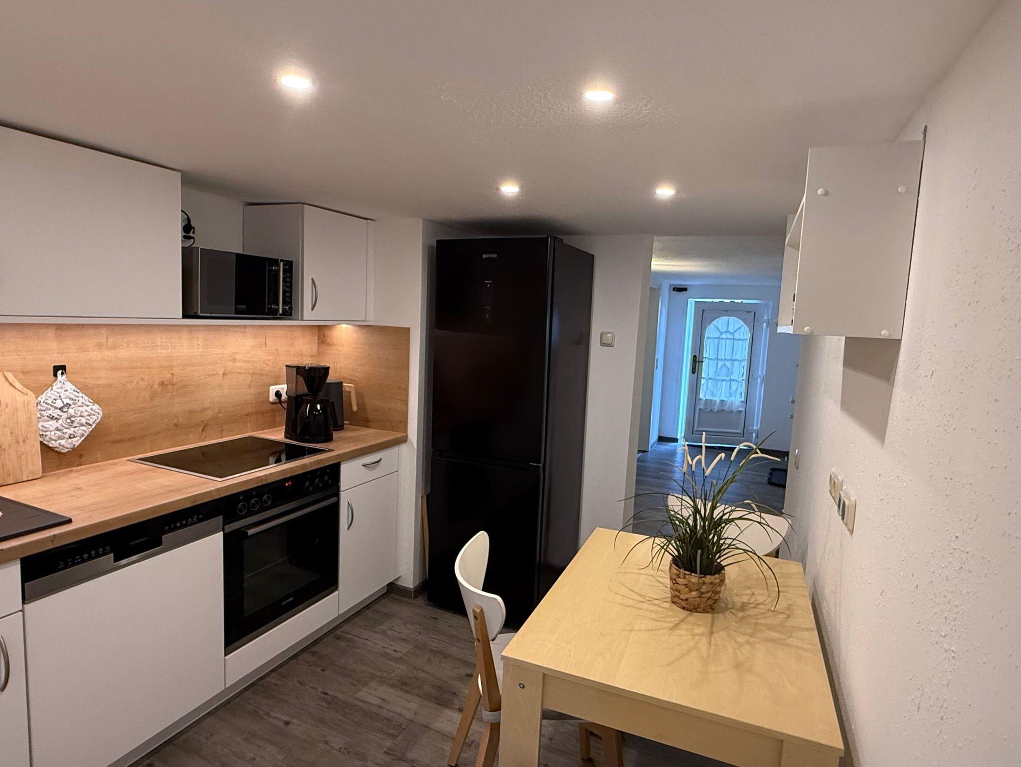 Kleine Küche mit Backofen, Cerankochfeld, Kühl-/Gefrierschrank, Mikrowelle, Toaster, Kaffeemaschine, Wasserkocher, Geschirrspüler reichlich Geschirr und Kochutensilien, Esstisch und -plätze f. 3-Personen. Schlafzimmer mit Doppelbett 1,80 m und Schrank,