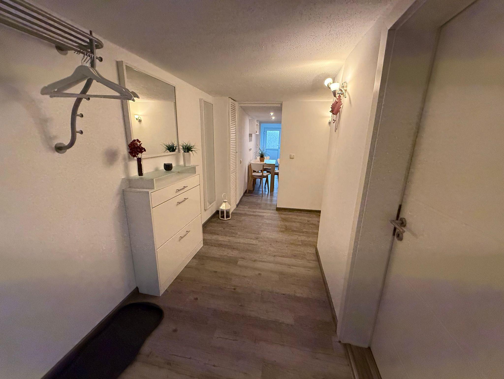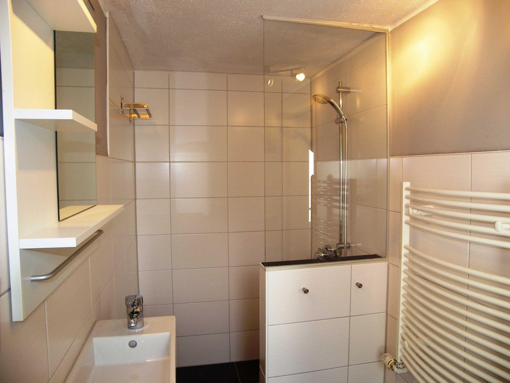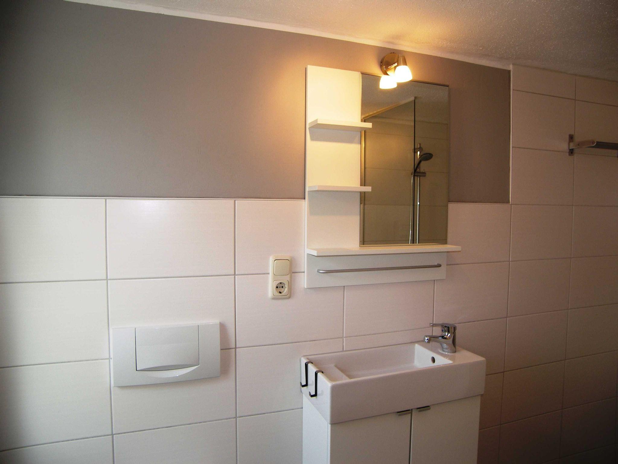 Bad mit Dusche, Waschbecken, WC, Handtuchheizkörper, Haartrockner. Wir weisen ausdrücklich daraufhin, dass die lichte Raumhöhe in dieser Ferienwohnung bei nur knapp 2,00 m liegt.