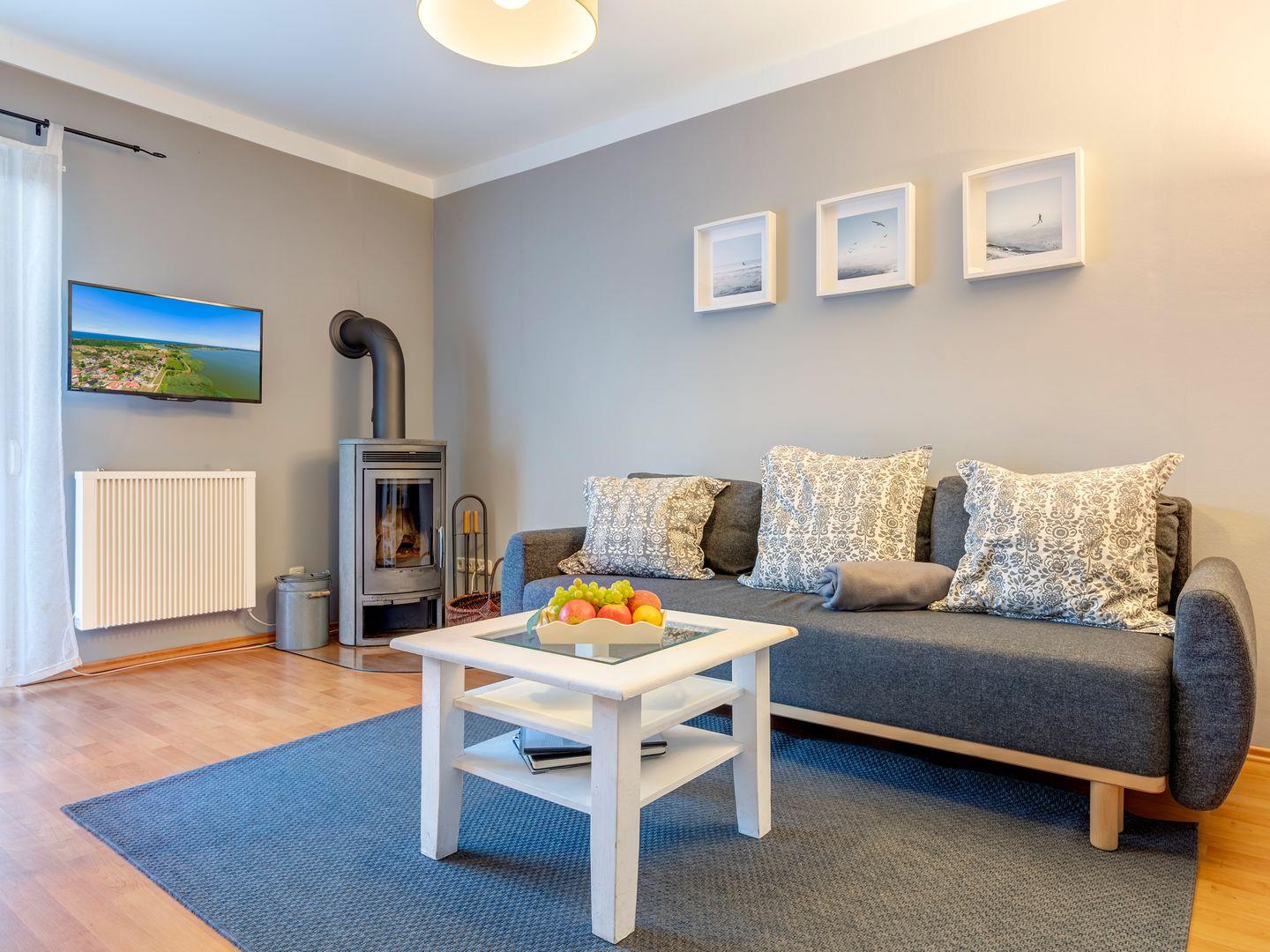 Das charmante Zwei-Zimmer-Appartement im Bungalow-Stil verfügt über ein helles Tageslicht-Bad mit Dusche und WC. Der großzügige Wohn- und Essbereich ist mit einem Flatscreen-TV sowie kostenfreiem WLAN ausgestattet. Über 250 TV-Sender in HD (darunter 80 Pay-TV-Kanäle) sorgen für Unterhaltung. Die Couch lässt sich schnell in ein komfortables Zweibett-Schlafsofa umwandeln, während der Schwedenofen an kühleren Tagen für wohlige Wärme sorgt. Vom Wohnzimmer gelangen Sie direkt auf die Terrasse, die in den grünen Garten führt – der perfekte Ort zum Entspannen und die frische Luft zu genießen.