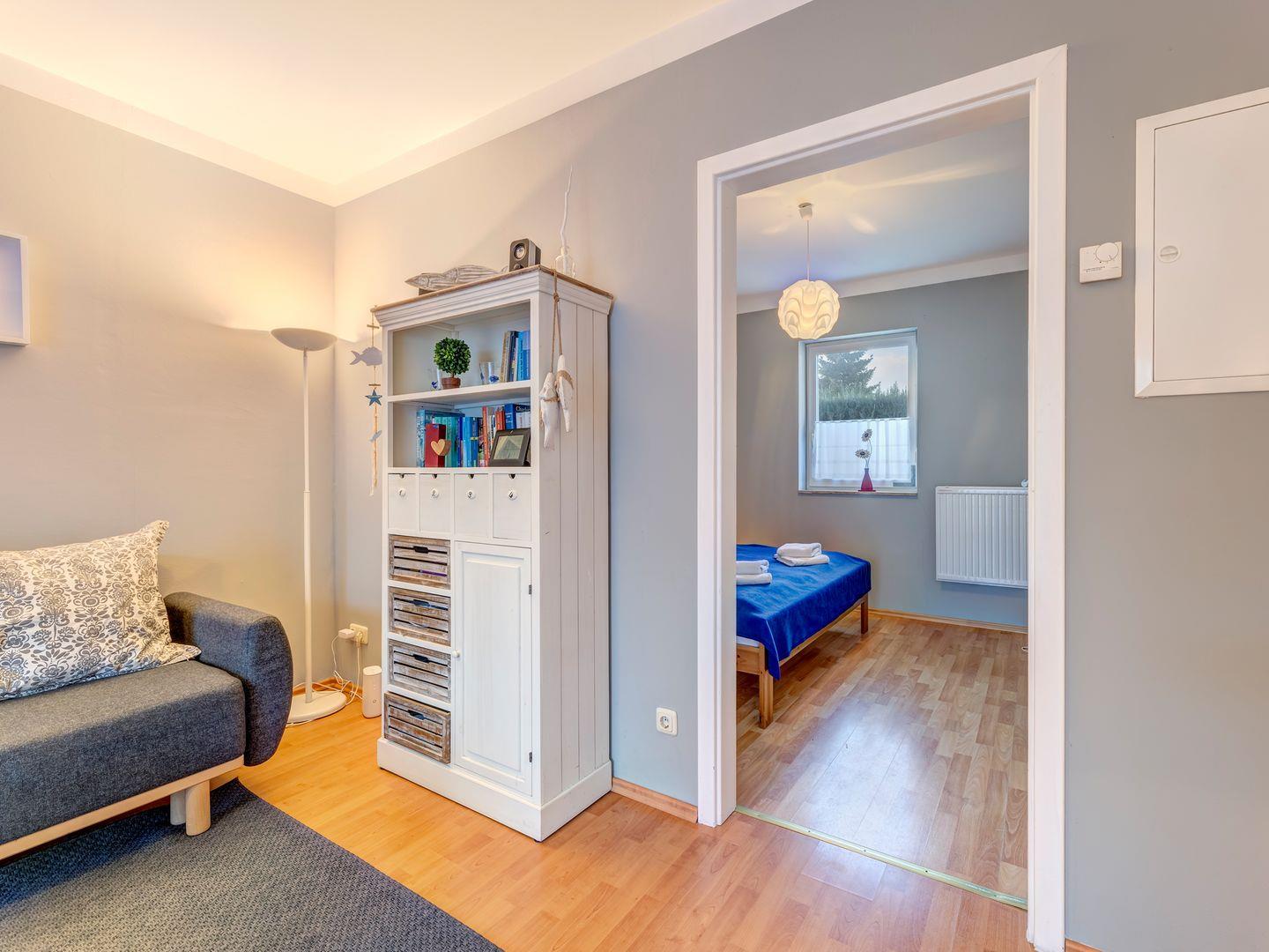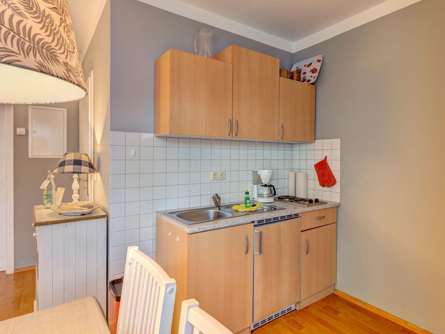 Die gut ausgestattete, offene Küche bietet Ihnen alle nötigen Annehmlichkeiten, um selbst zu kochen. Das Schlafzimmer ist mit einem gemütlichen Doppelbett ausgestattet und bietet ausreichend Stauraum für Ihre Kleidung und Gepäck. (Hinweis: Ein Reisebettchen passt hier leider nicht.)